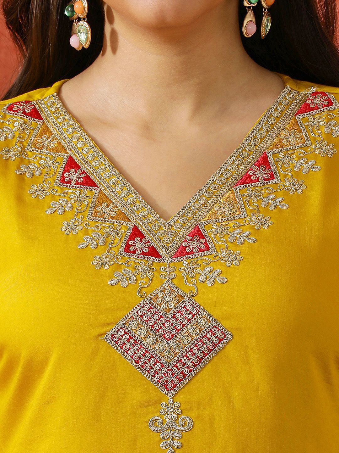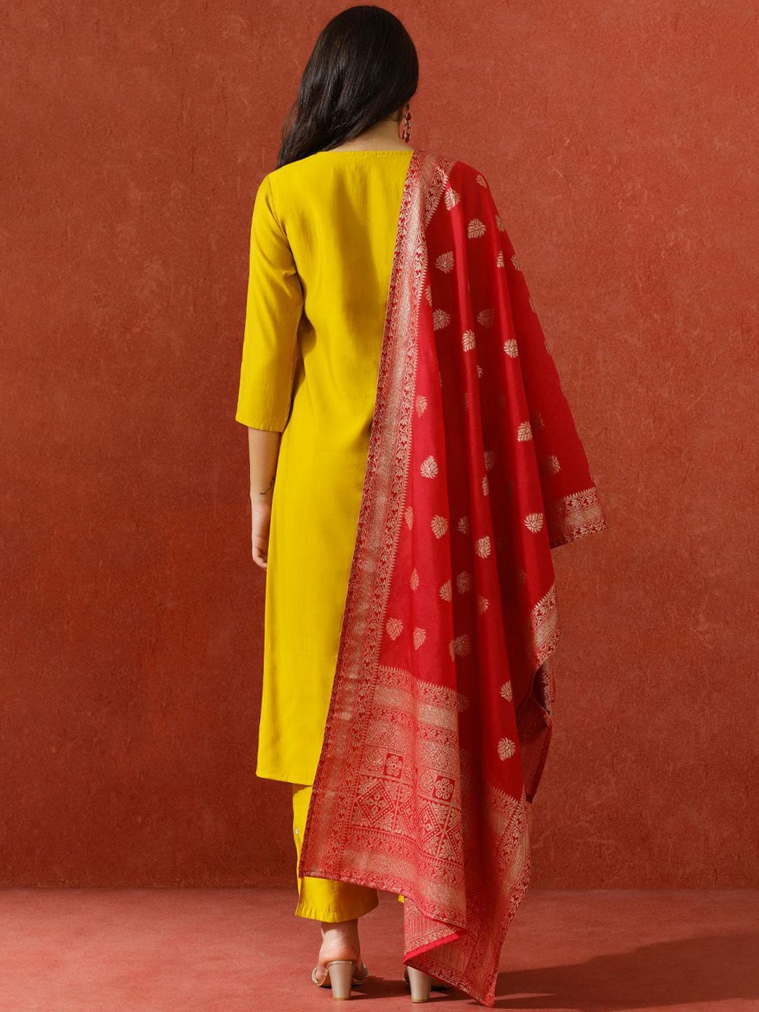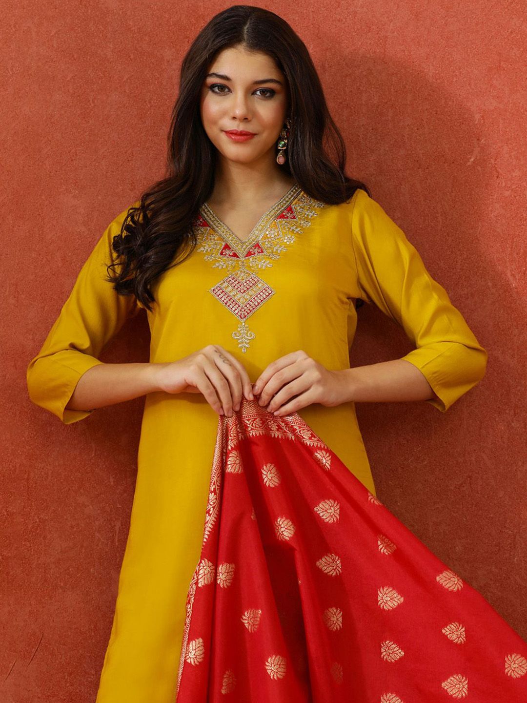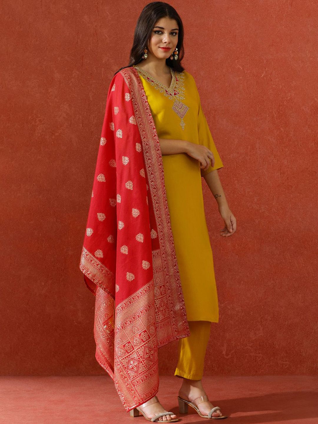QSH Embroidered A-Line Solid Festive Kurta & Trousers With Dupatta