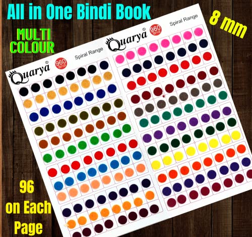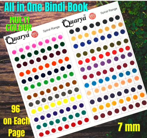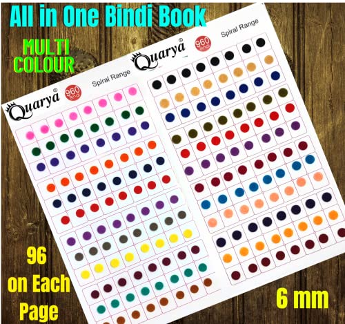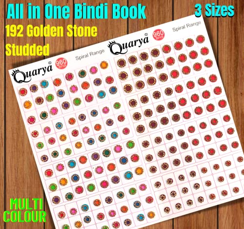 Spiral Booklet of 960 bindis, Golden Stone Studded (192) and Plain Round Multicolour (768) Bindis in 3 different sizes 7 mm, 8mm, 9 mm plus 3pc printed scrunchies hair bands Easy and safe to use Self adhesive bindis are ideal for daily use as well as party wear. 960 different size,colour and style bindis enable you to create your own designs and patterns. Handcrafted by the best craftsmen in the perfect dimensions for a perfect look without causing a speck of discomfort to you. Come in vibrant colours to match all your dresses and looks.