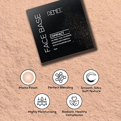 RENEE Face Base Compact Powder Cashew Beige 9gm, Enriched With Hyaluronic Acid & Vitamin E, Long - Lasting, Easy Blend, Matte Finish, for All Skin Types