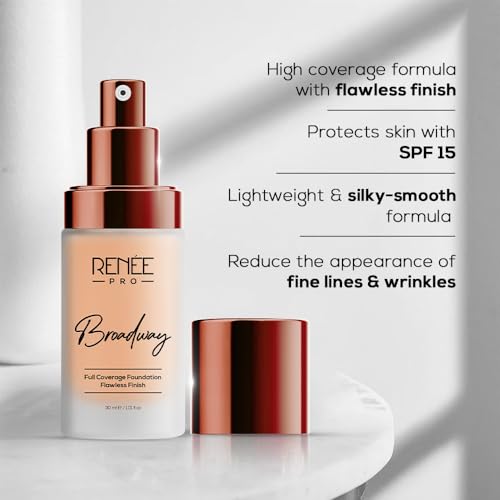 RENEE PRO Broadway Liquid Foundation - Eden, Full Coverage, Lightweight, Long-Lasting, And Highly Buildable. Delivers Velvety Matte Finish, Infused with Spf 15 & Argan Oil for Nourishment - 30ml