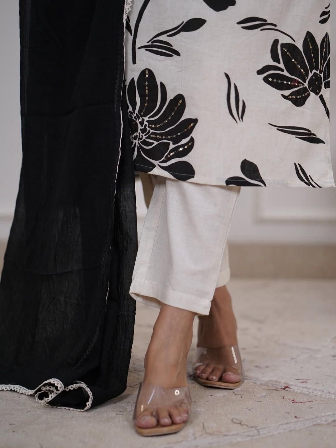 ROOTSOUL Women Black Viscose Rayon Printed Kurta & Trousers With Dupatta