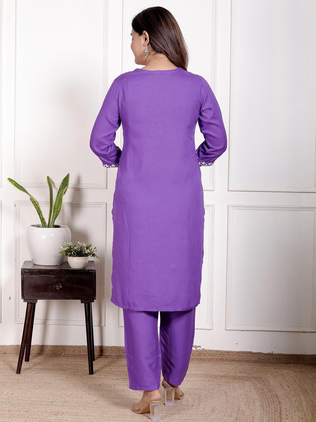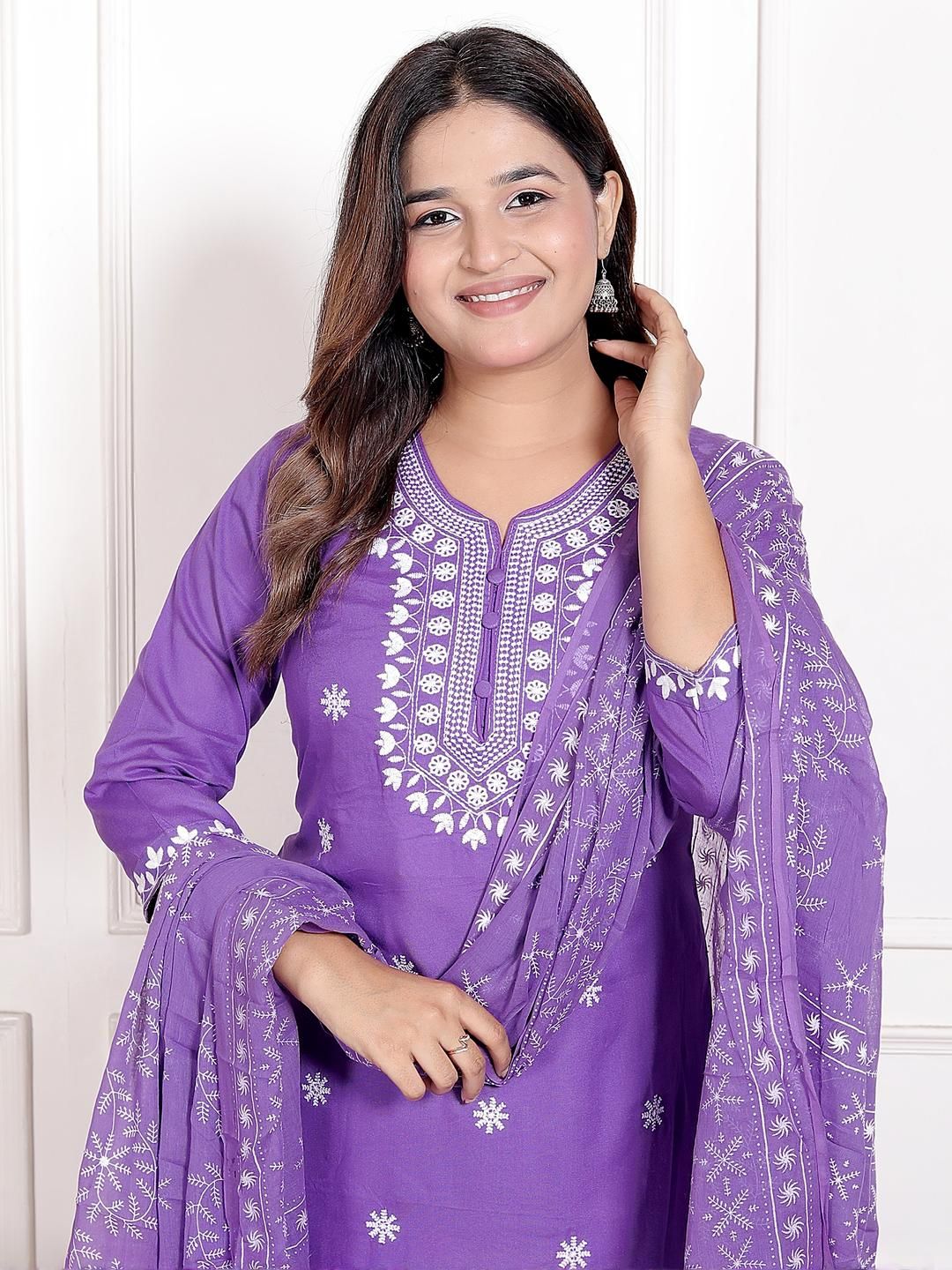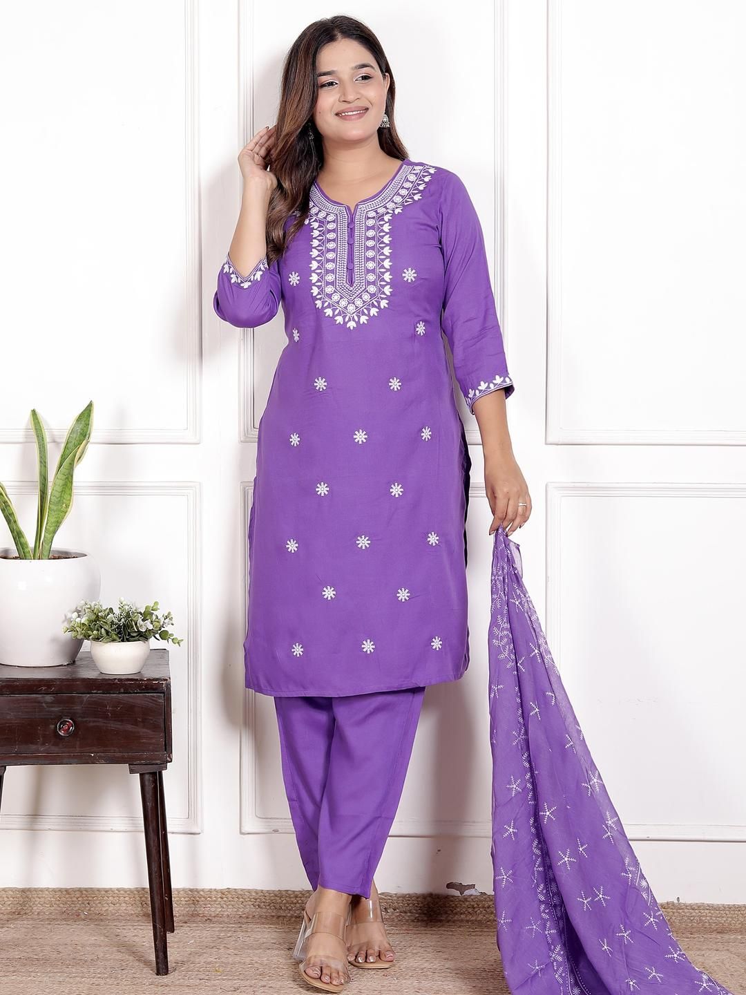 ROOTSOUL Women Purple Viscose Rayon Embroidered Kurta & Trousers With Dupatta