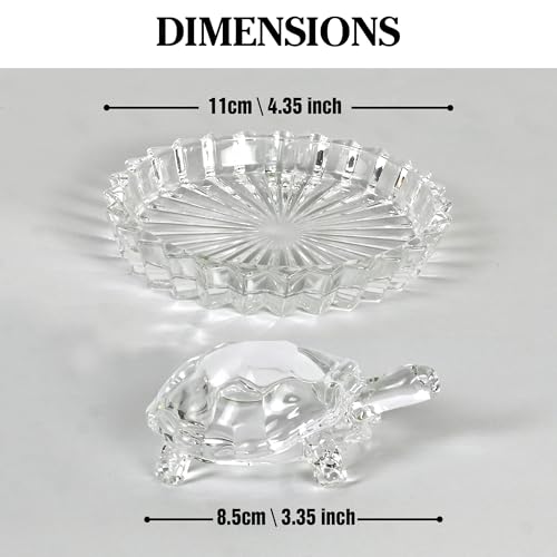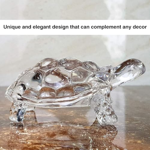 Auspicious Décor: Rousrie crystal tortoise with plate is a Feng Shui crystal glass turtle for home décor and gifting purposes, believed to bring good luck as per Vastu principles. Elegant Design: Featuring a beautiful tortoise figurine crafted from crystal glass, this décor piece exudes elegance and sophistication. Versatile Placement: The accompanying plate allows for easy placement on tables, shelves, or any desired surface in your living space. Meaningful Gift: This Rousrie tortoise makes an excellent gift option for housewarming ceremonies, festive occasions, or as a thoughtful present for loved ones. Dimensions: The tortoise figurine measures approximately 10 cm in length, ensuring a compact yet eye-catching presence in any room.
