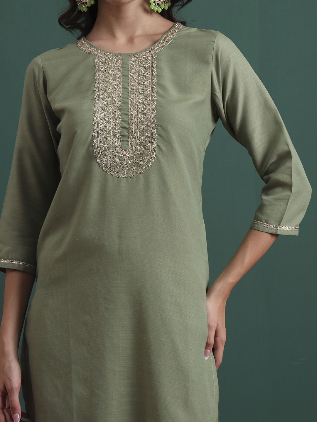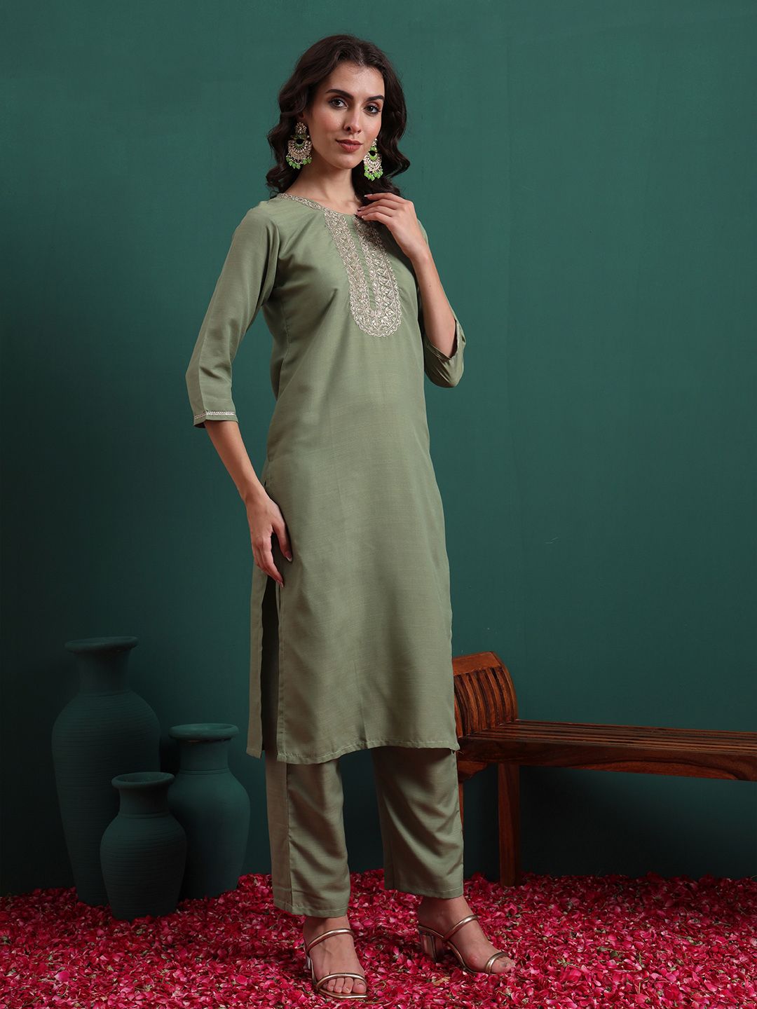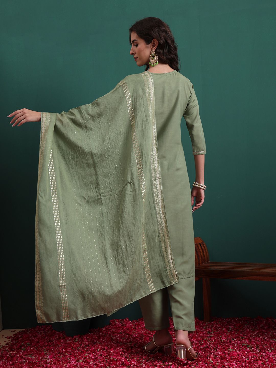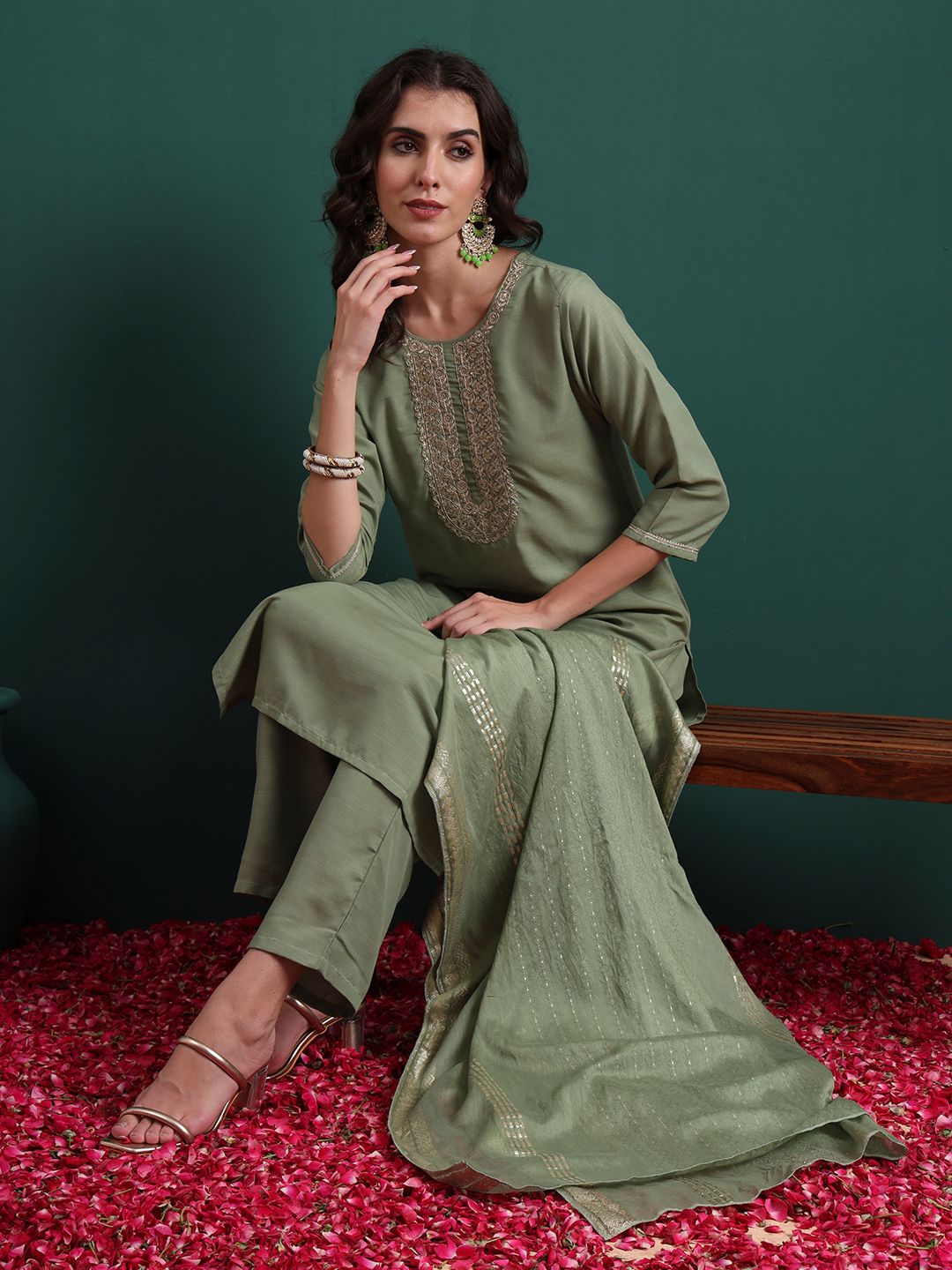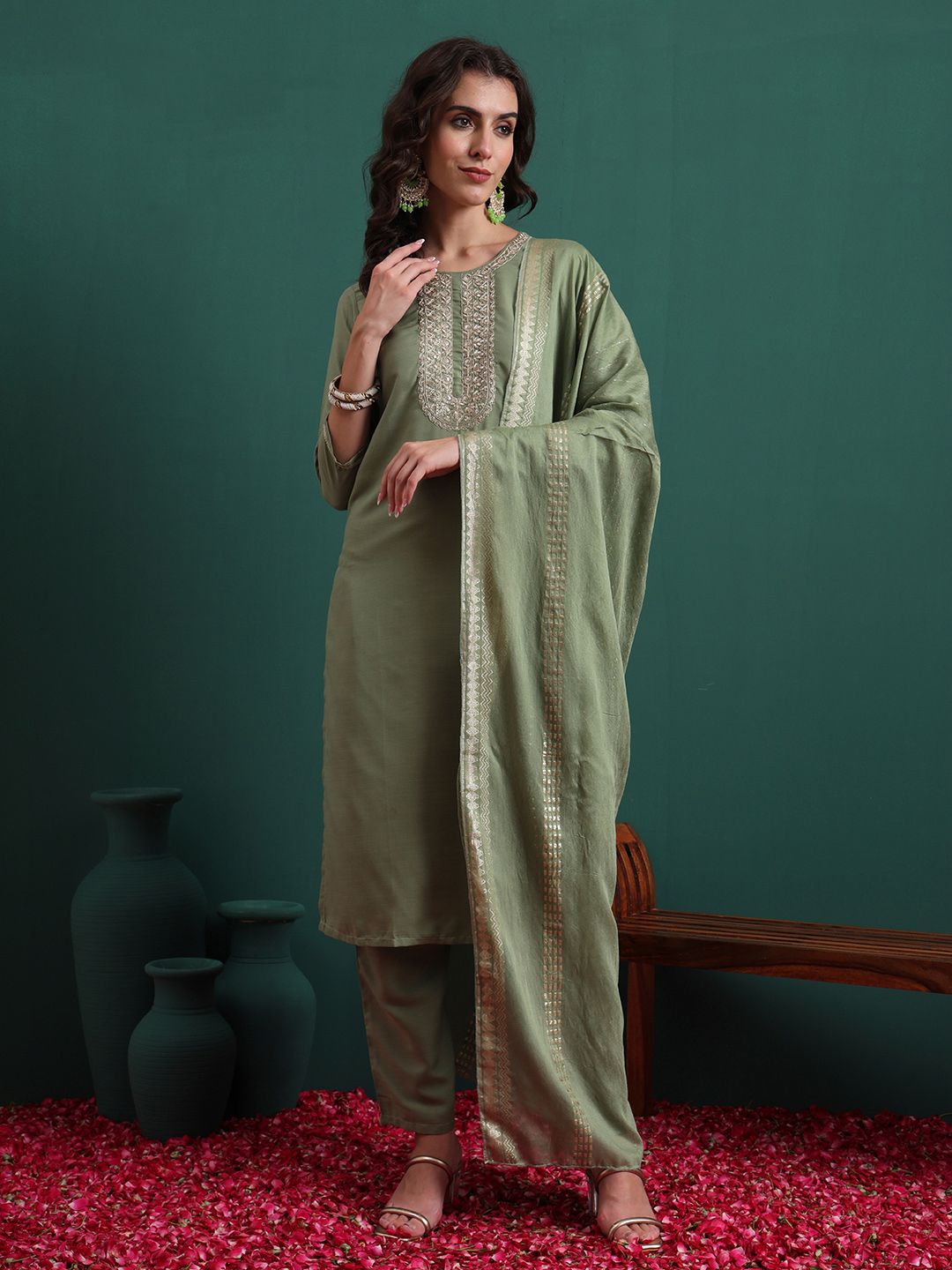 Royal Export Floral Embroidered Round Neck Straight Kurta With Trousers & Dupatta