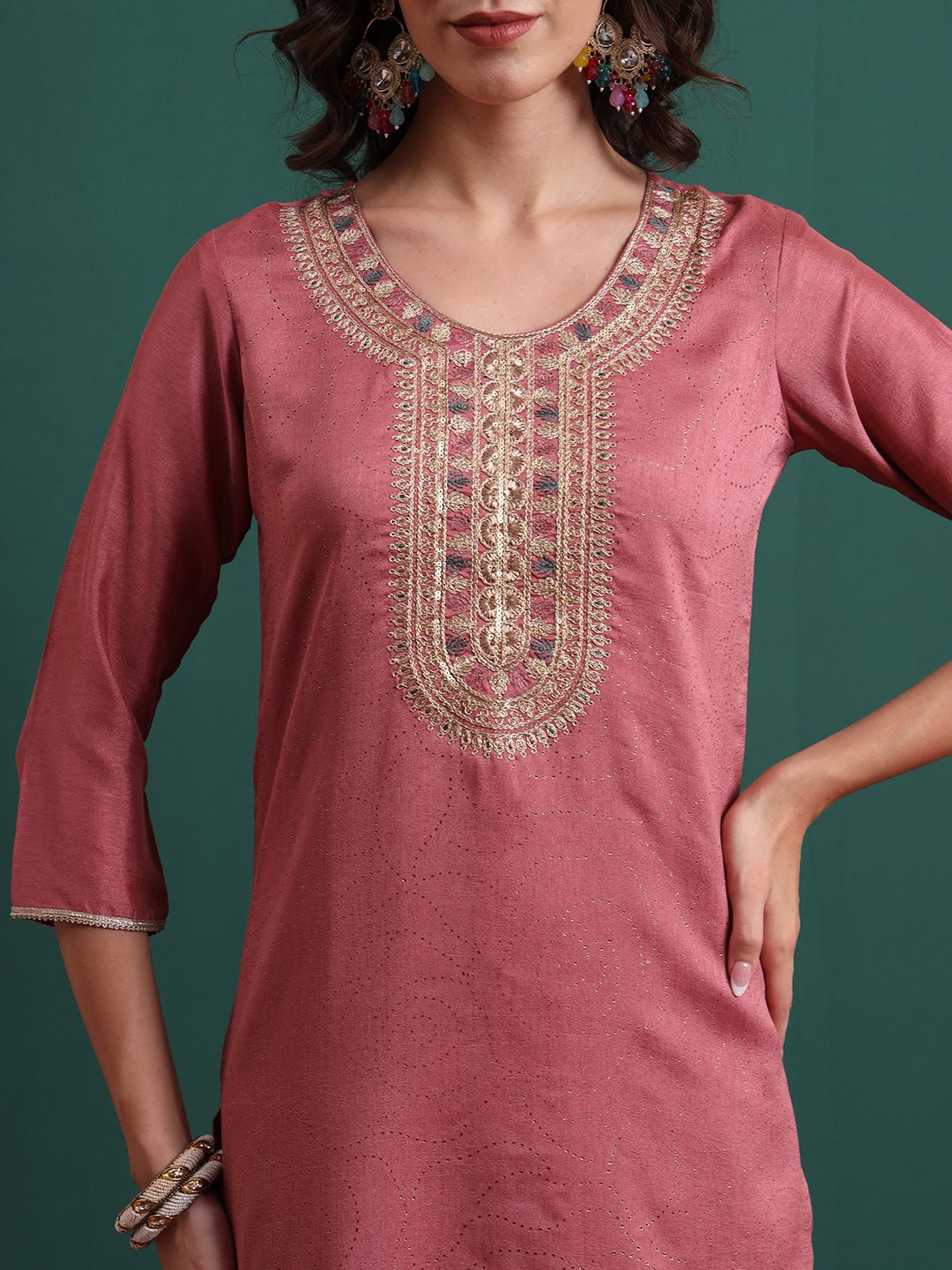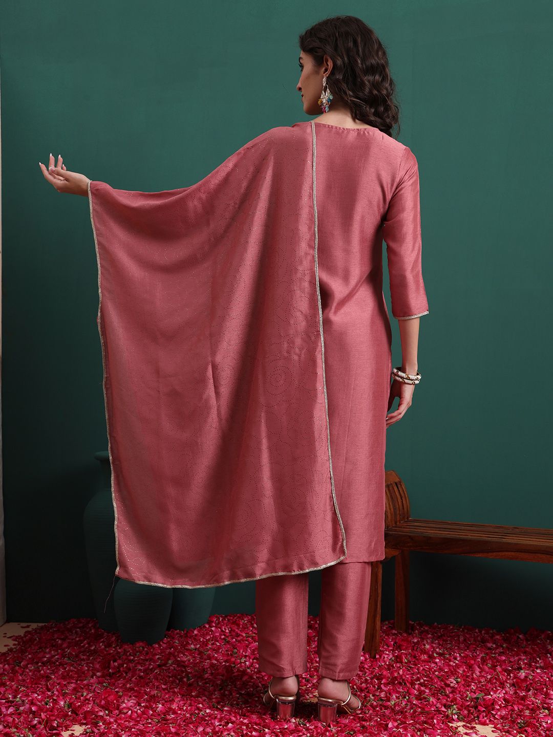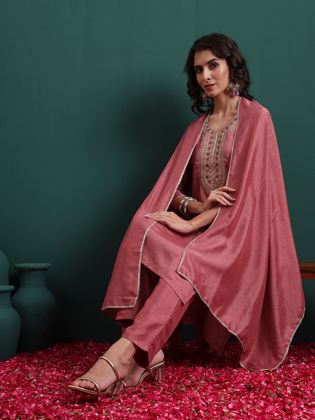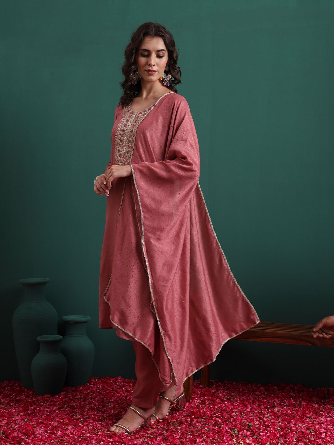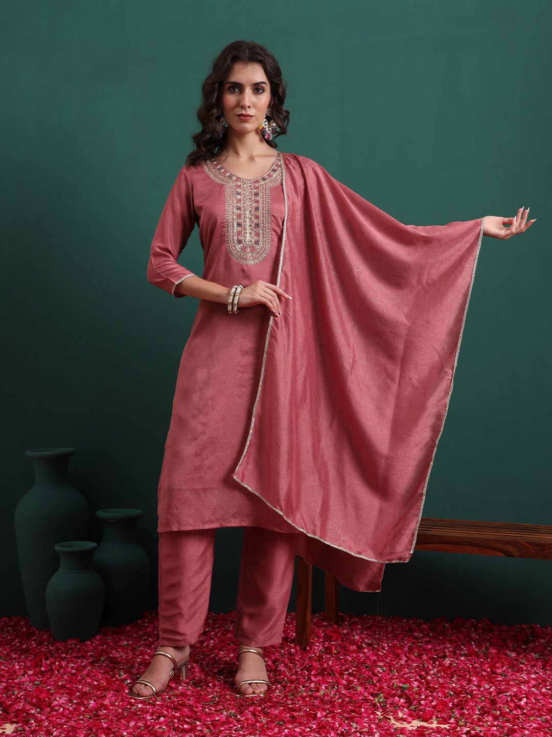 Royal Export Floral Embroidered Round Neck Thread Work Kurta With Trousers & Dupatta