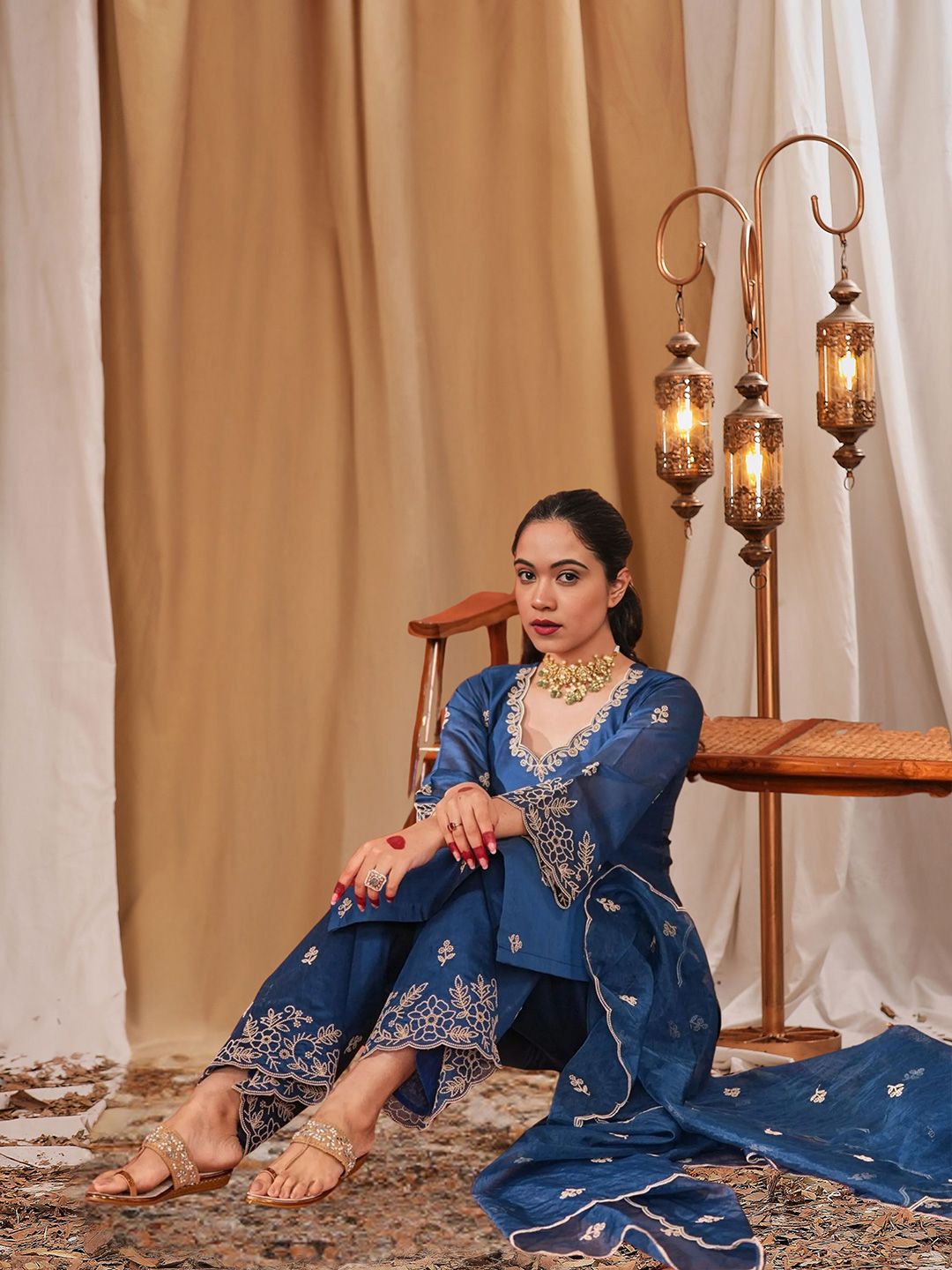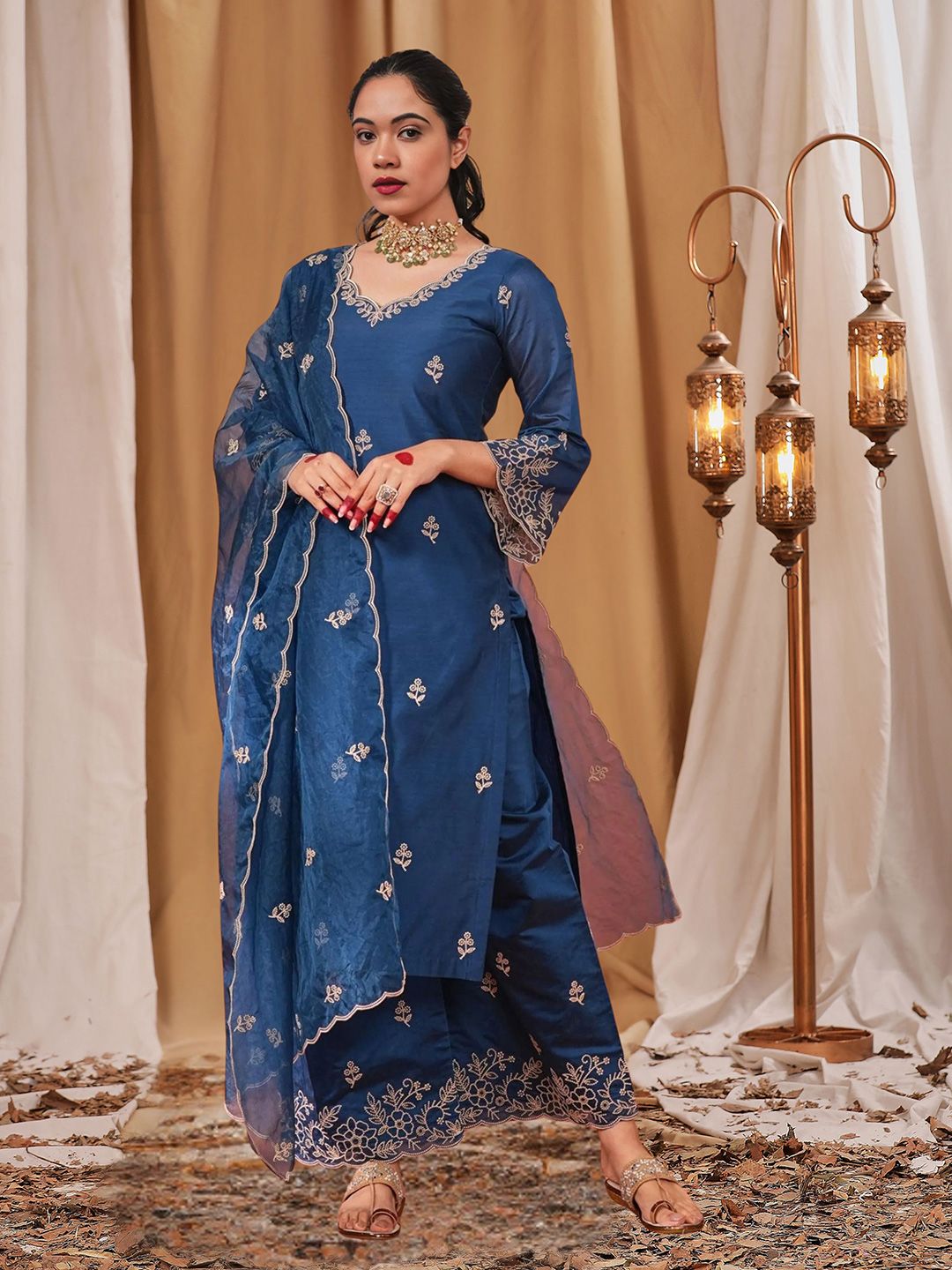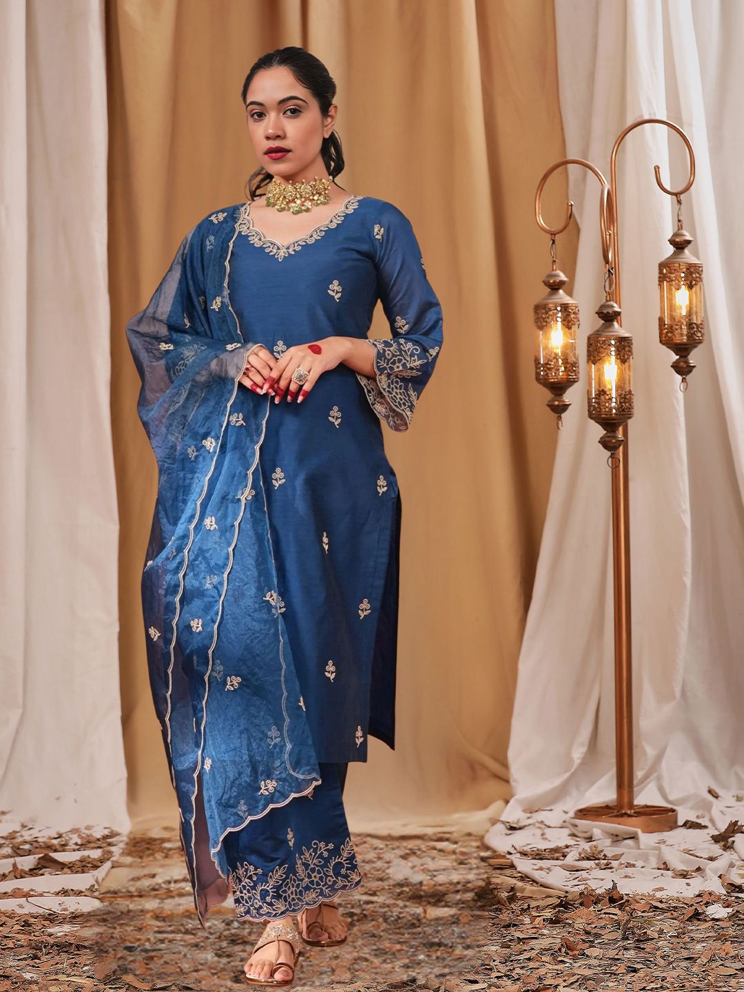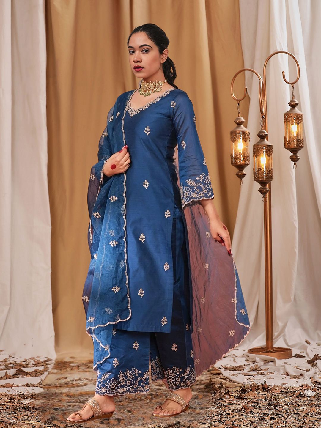 Royal Export Floral Embroidered V-Neck Thread Work Straight Kurta With Trousers & Dupatta