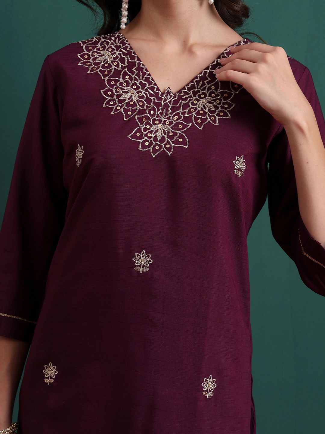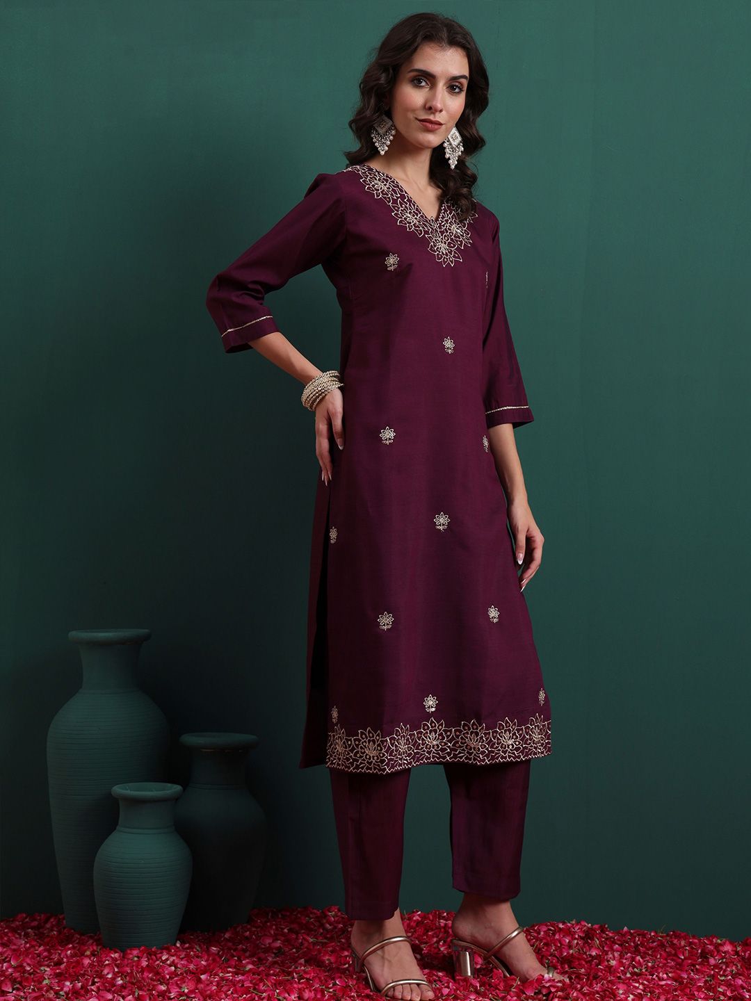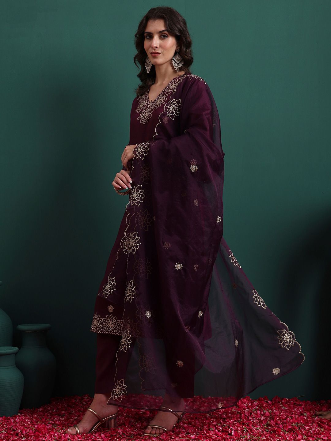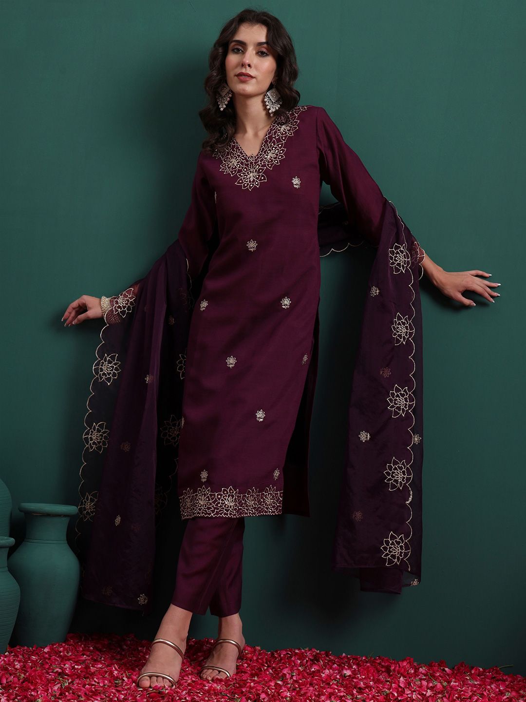 Royal Export Floral Embroidered V-Neck Thread Work Straight Kurta With Trousers & Dupatta