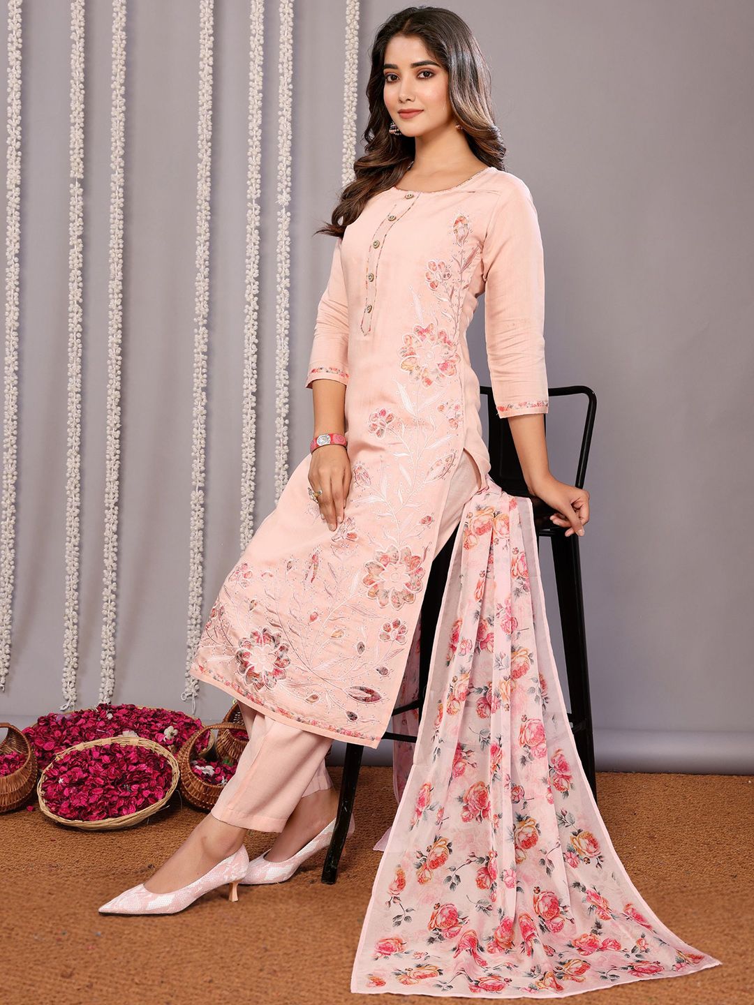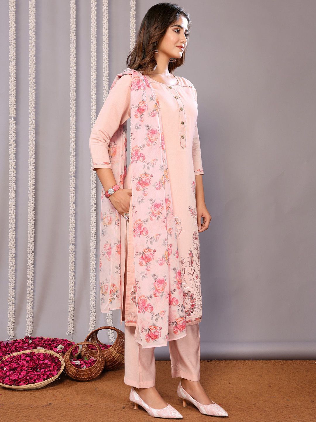 Royal Export Floral Printed Chanderi Cotton Straight Kurta With Trousers And Dupatta