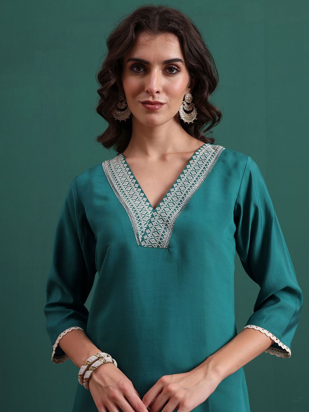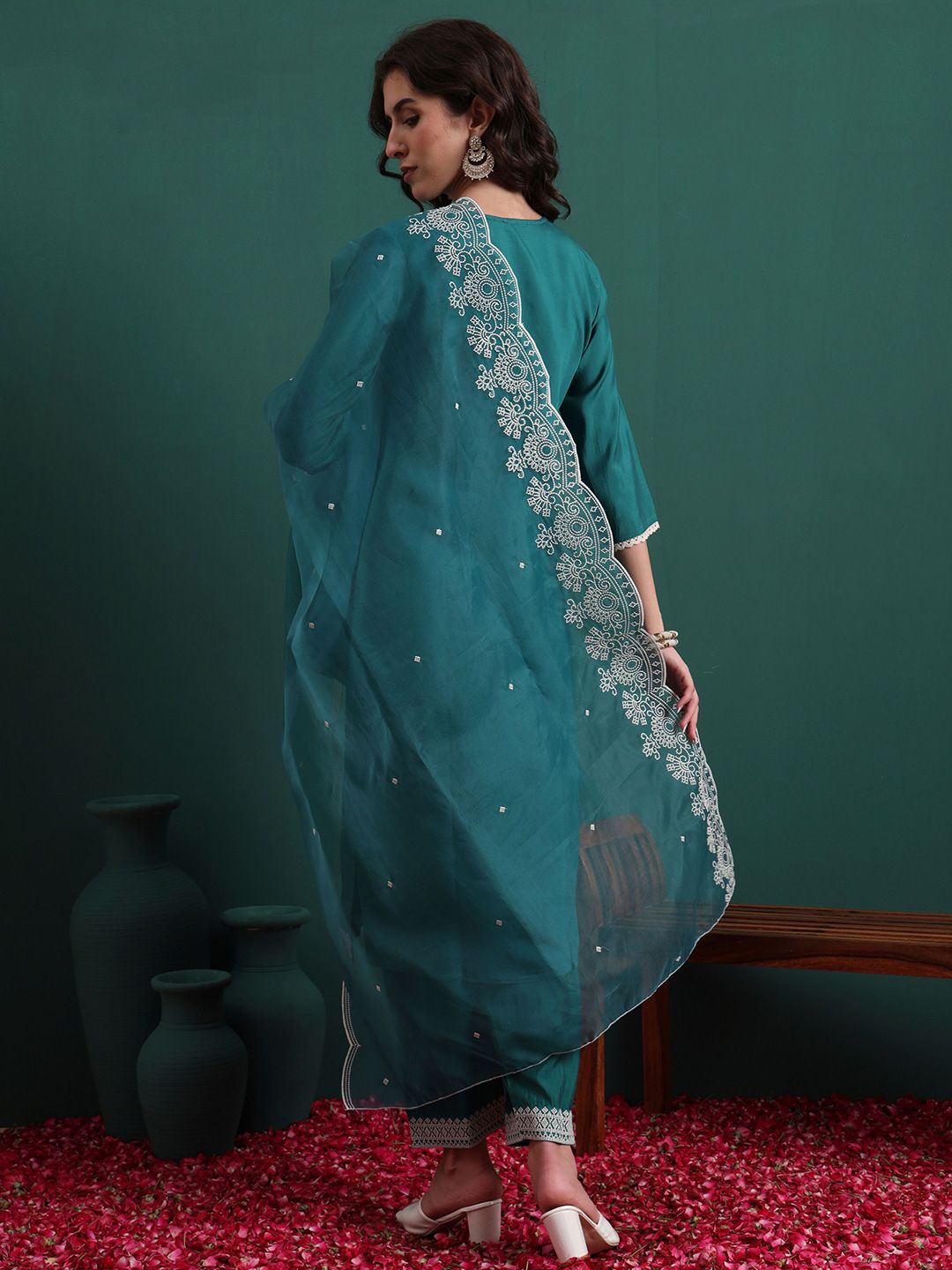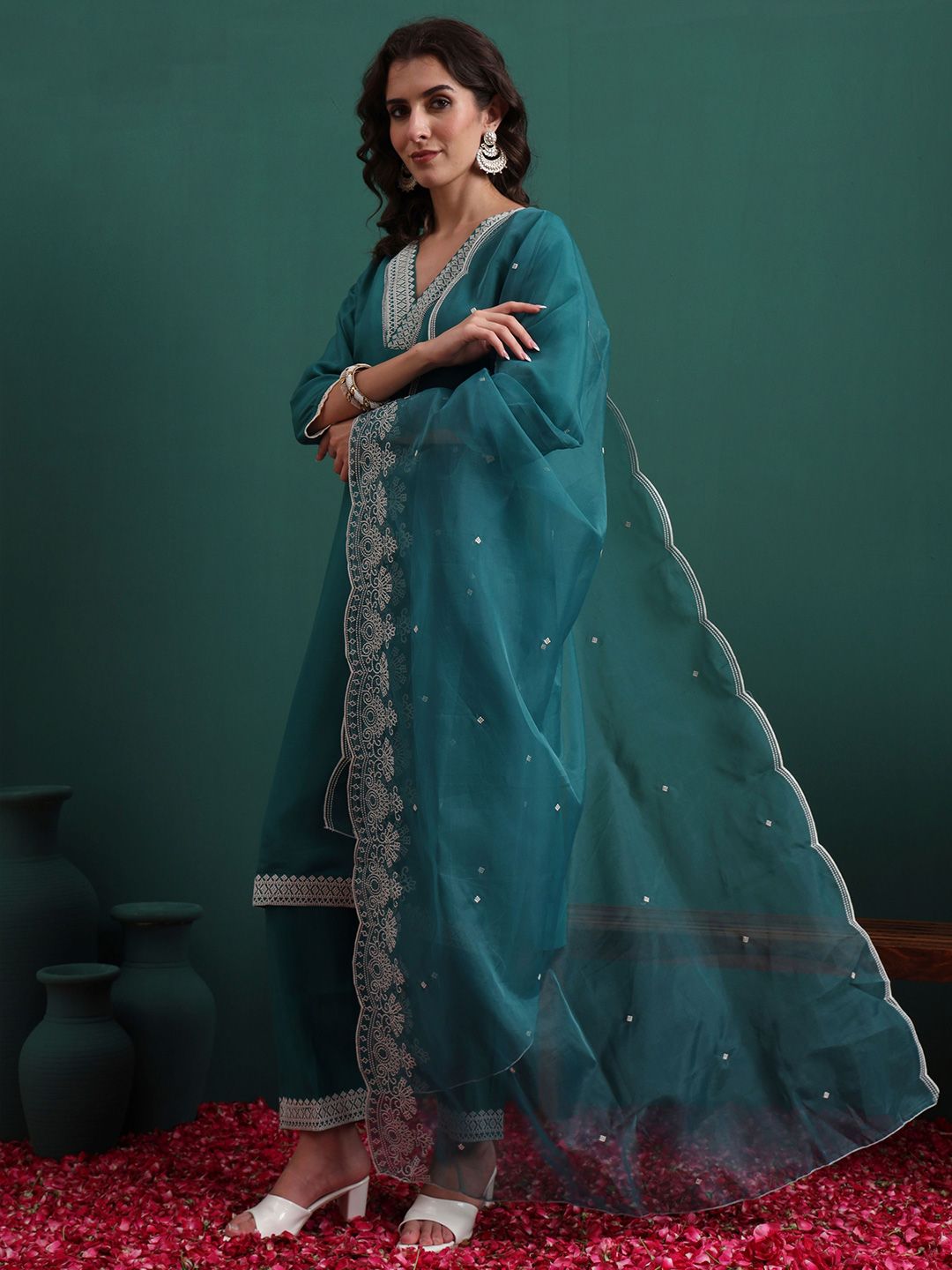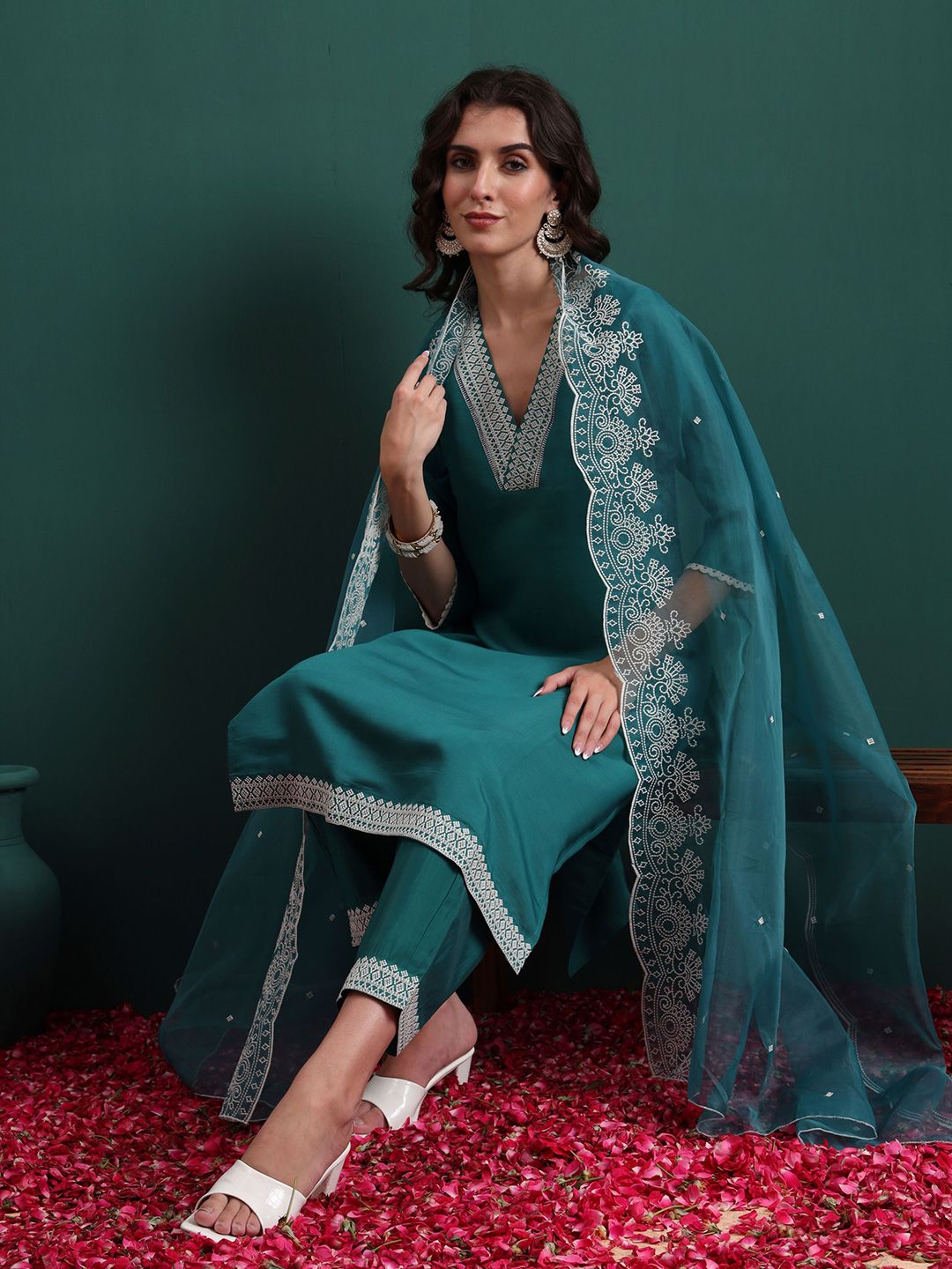 Royal Export Floral Yoke Design V-Neck Thread Work Straight Kurta With Trousers & Dupatta