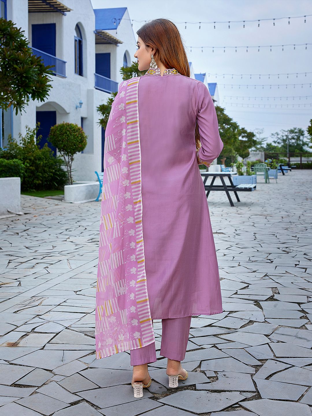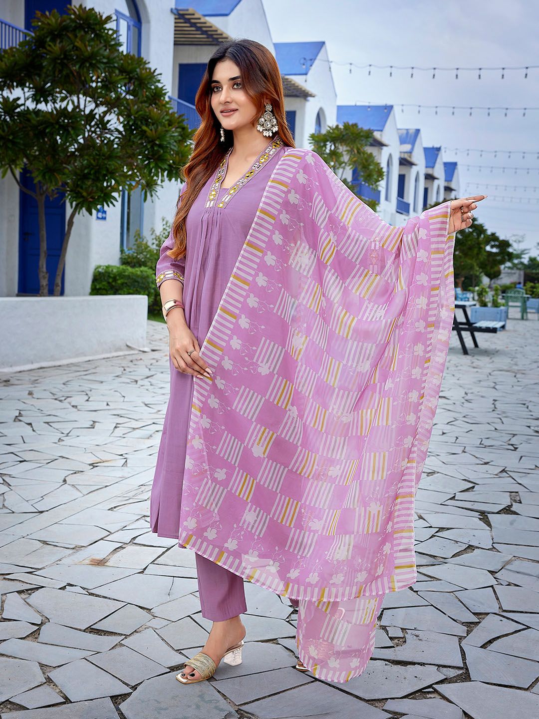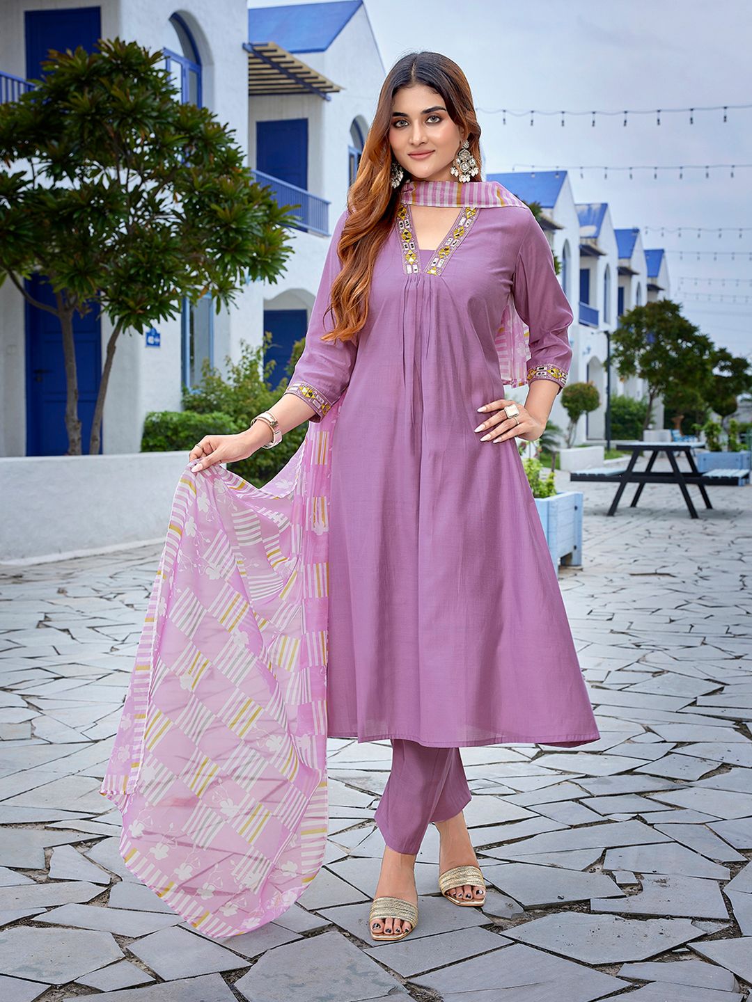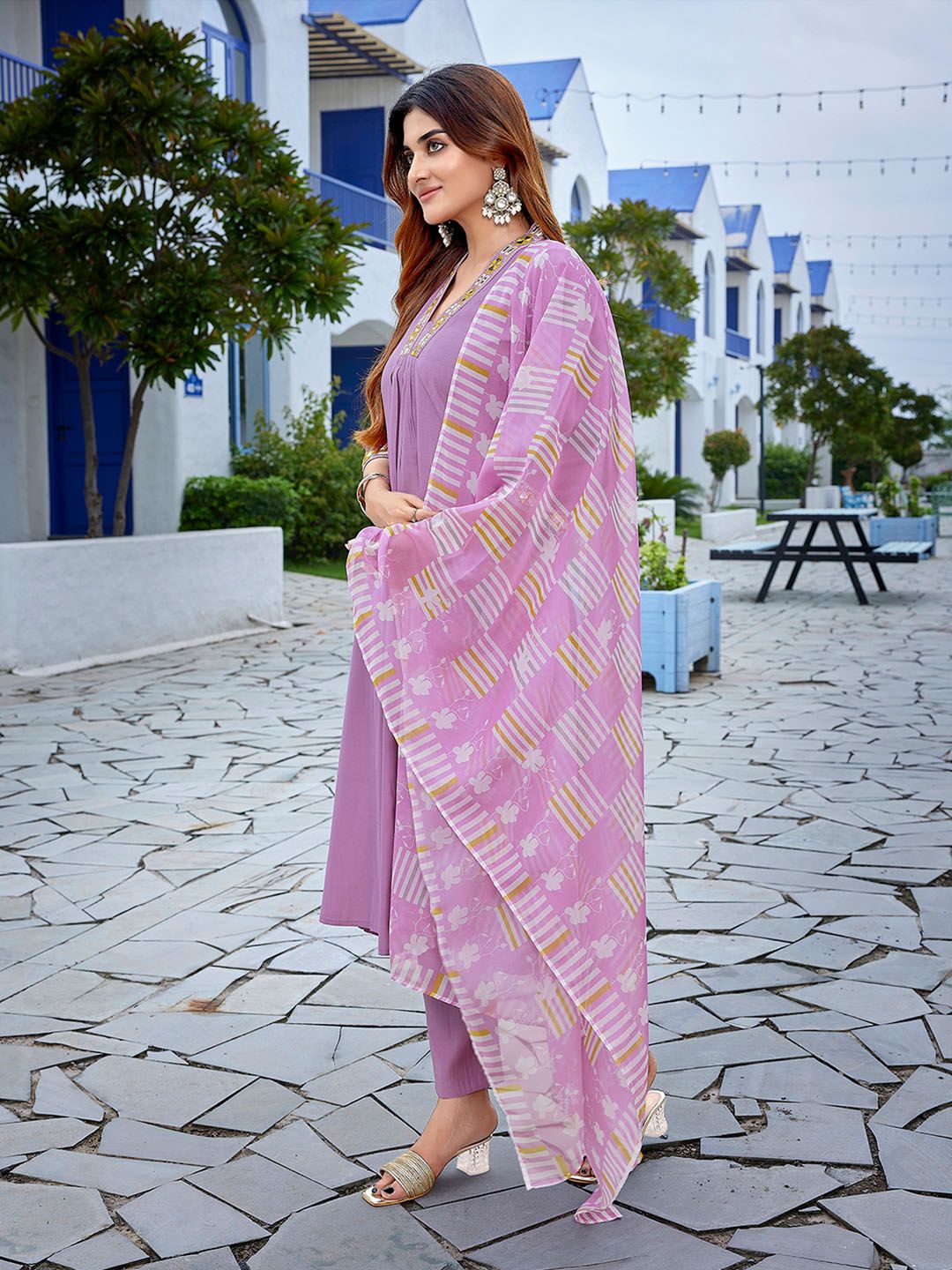 Royal Export Geometric Yoke Design Square Neck Straight Kurta With Trousers & Dupatta