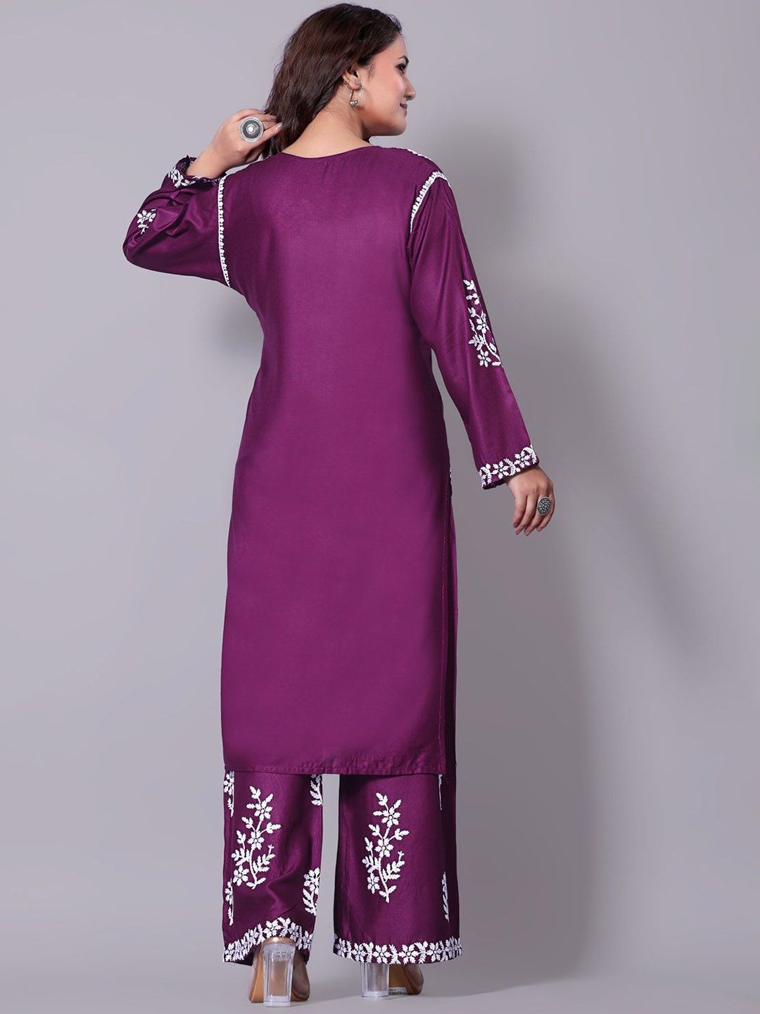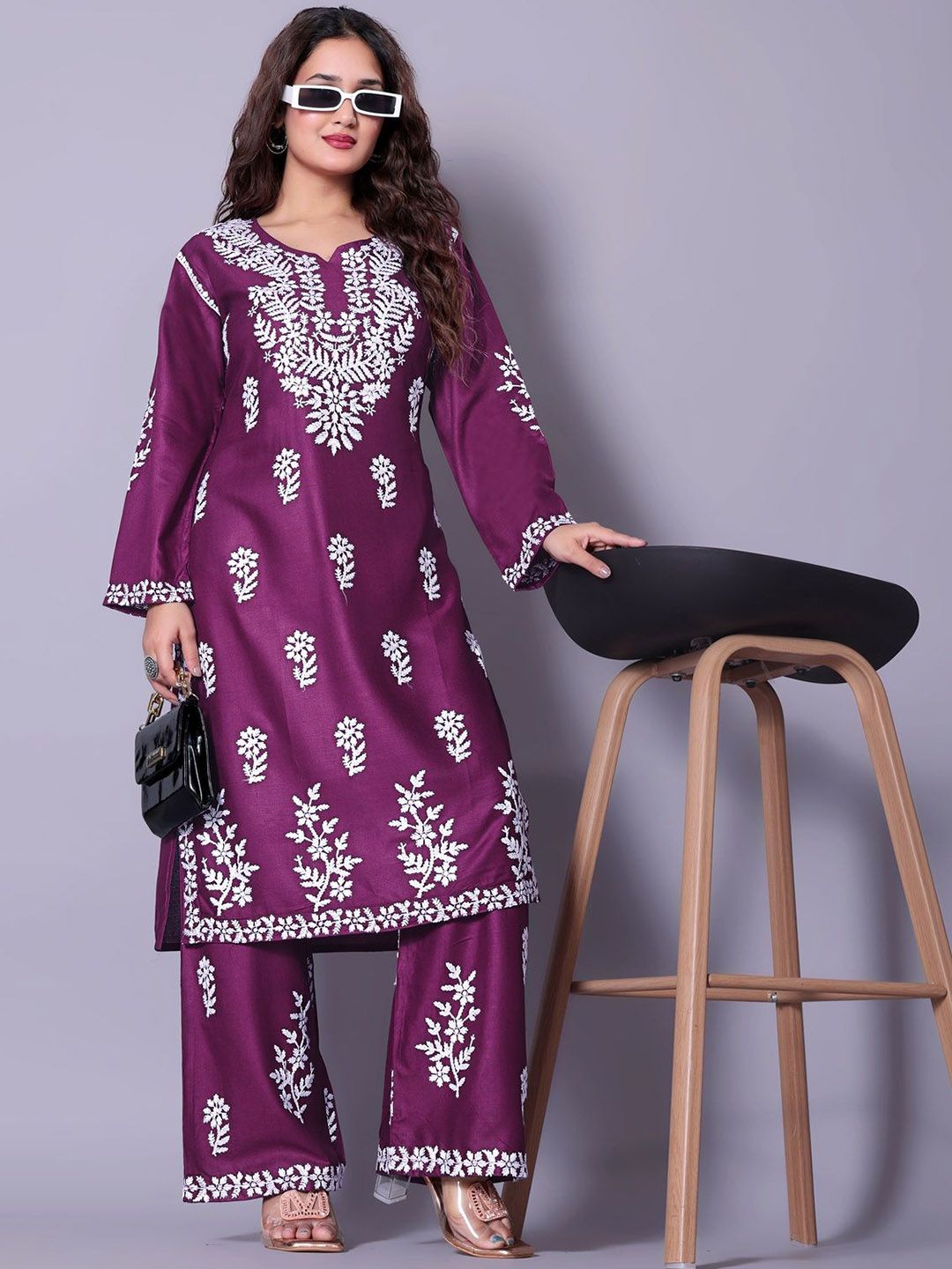 RUDRA LIFESTYLE Women Floral Embroidered Round Neck Pure Cotton Kurta with Palazzos