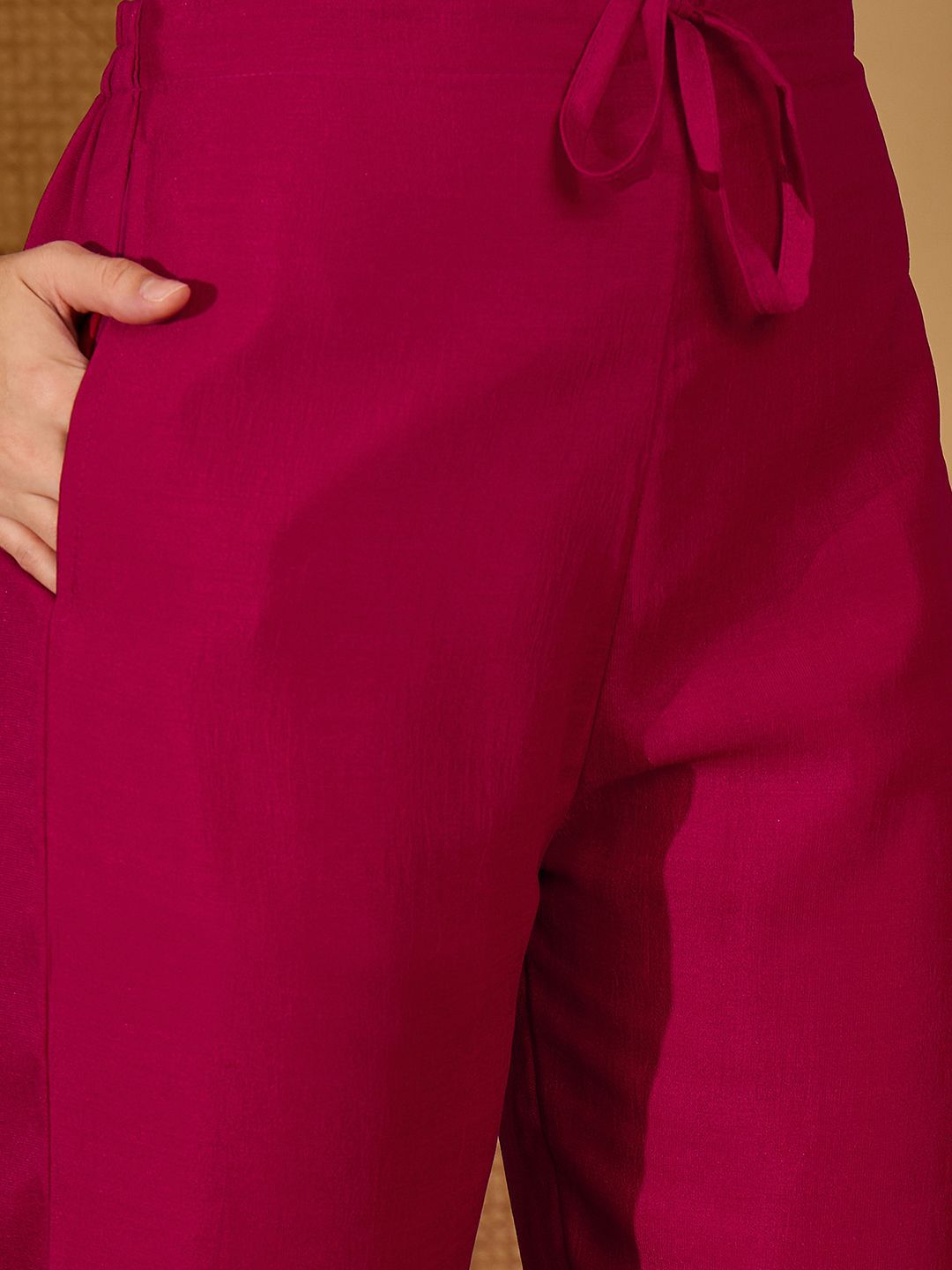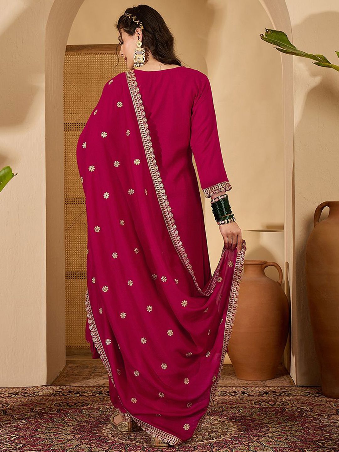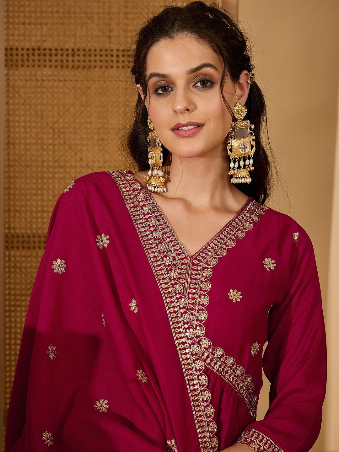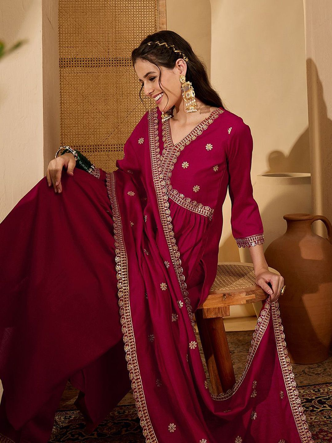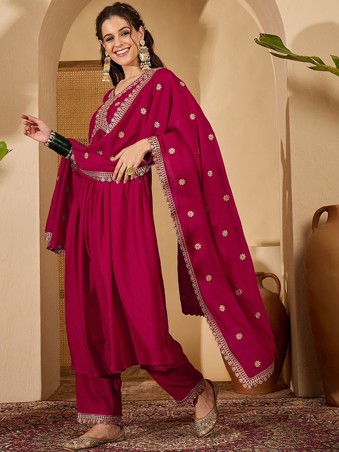 Sangria Embroidered V-Neck A-Line Kurta With Trouser & Dupatta