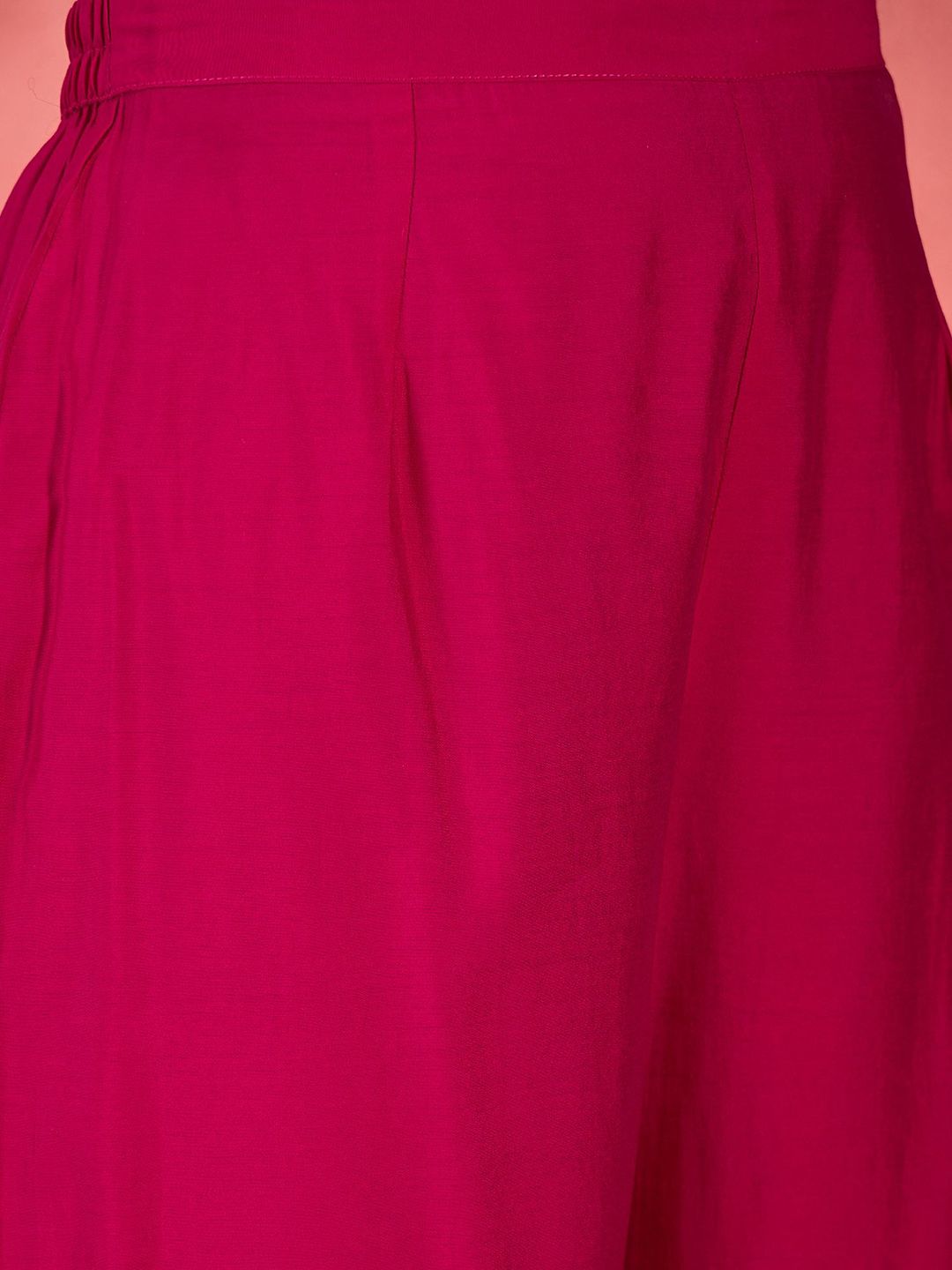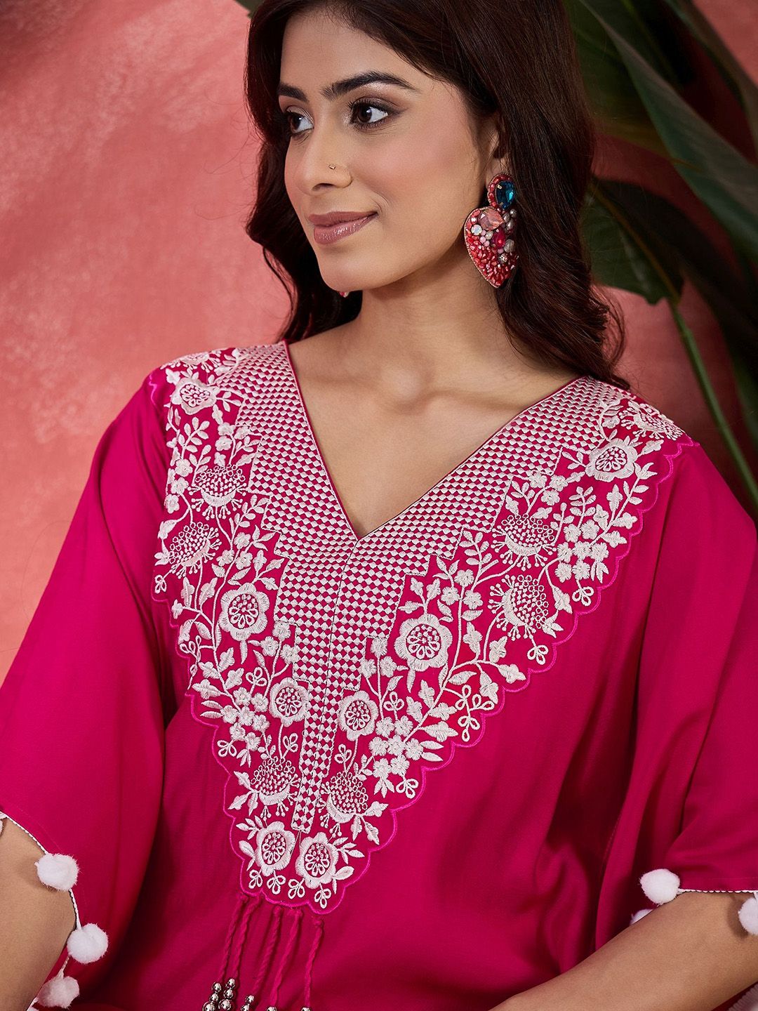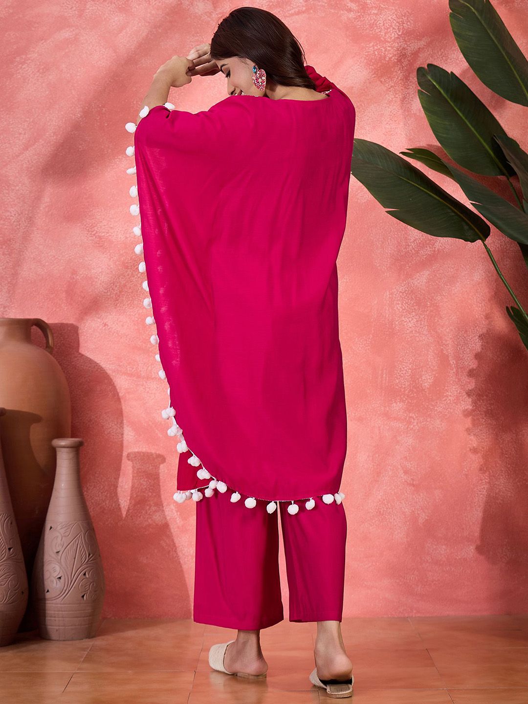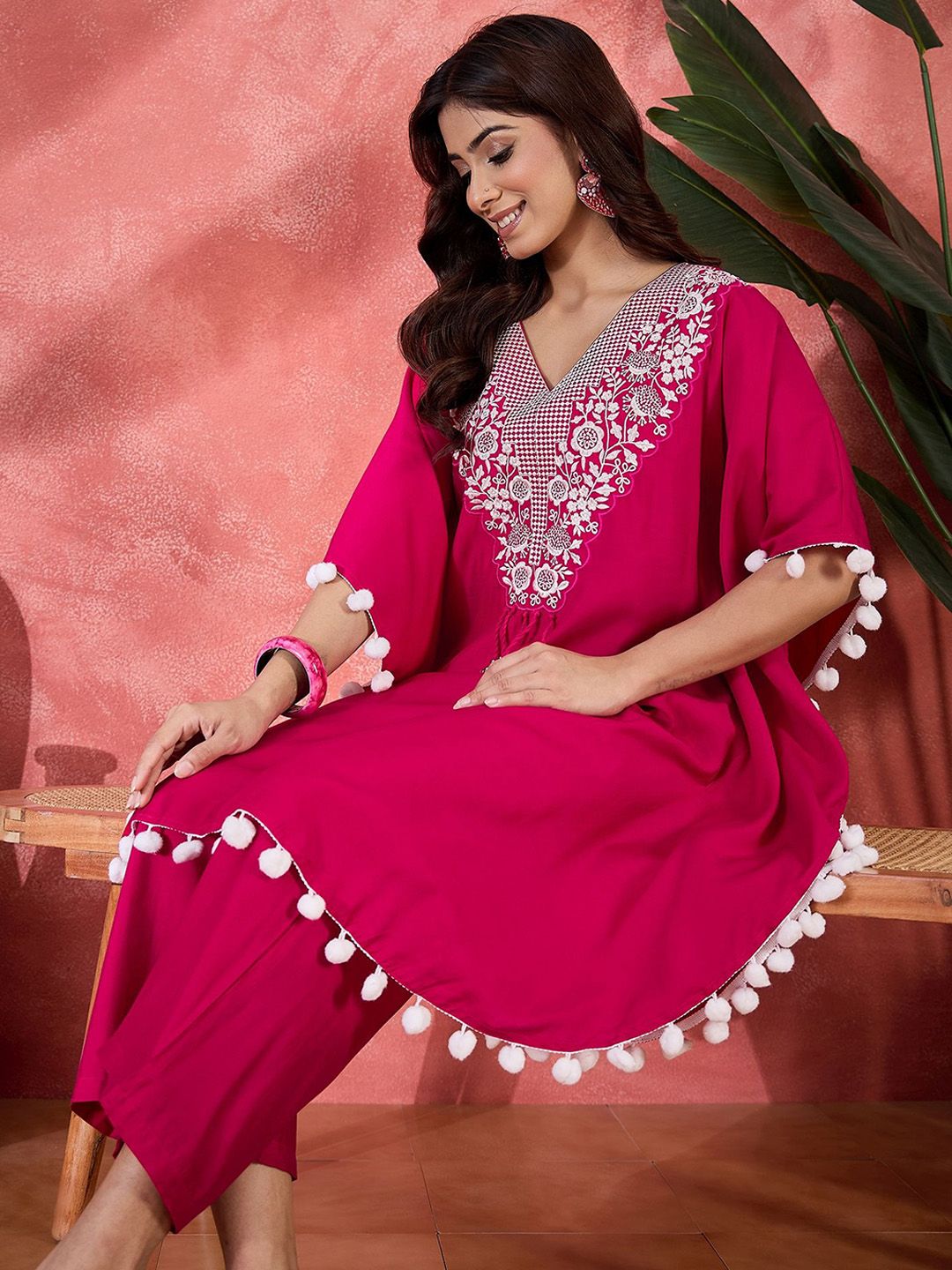 Sangria Embroidered V-Neck Mirror Work Kaftan With Trousers