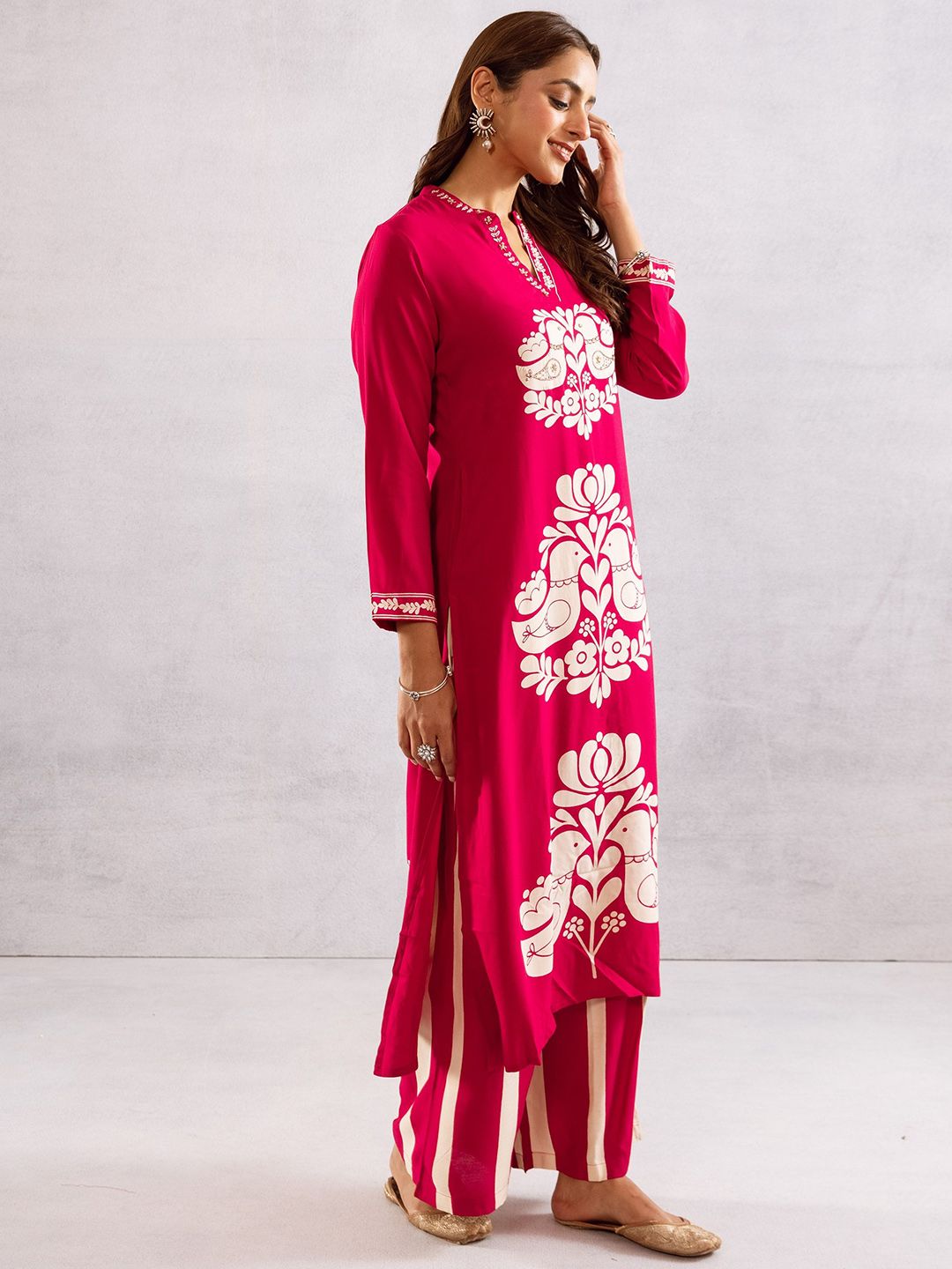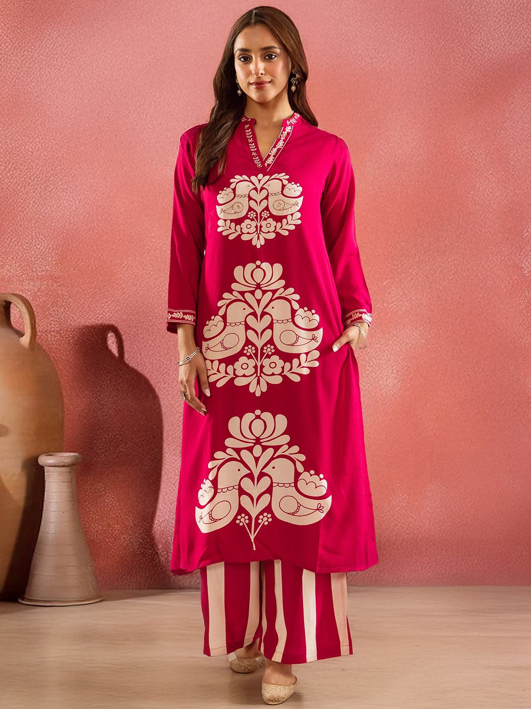 Sangria Ethnic Motifs Printed Mandarin Collar Straight Kurta With Palazzos