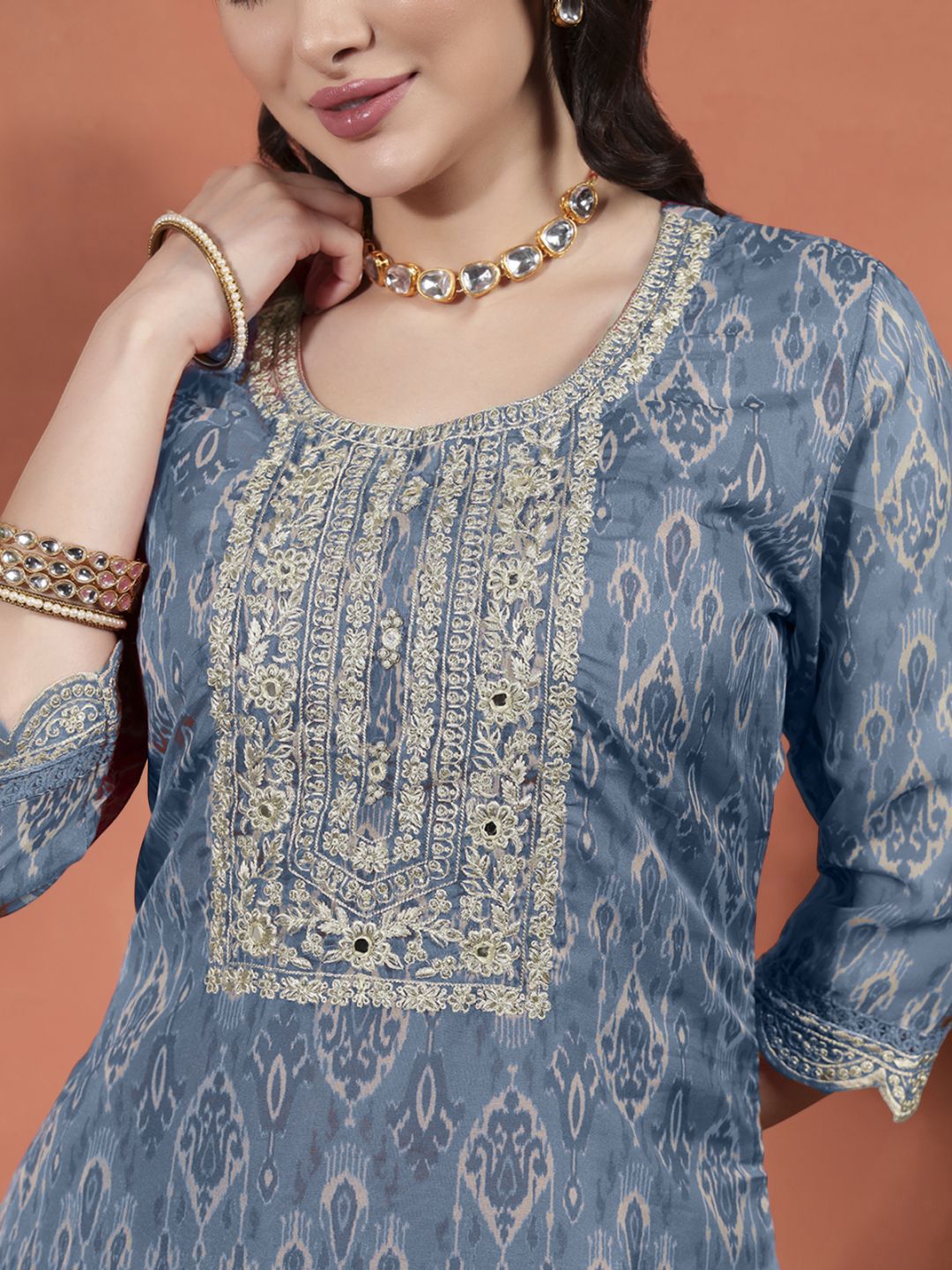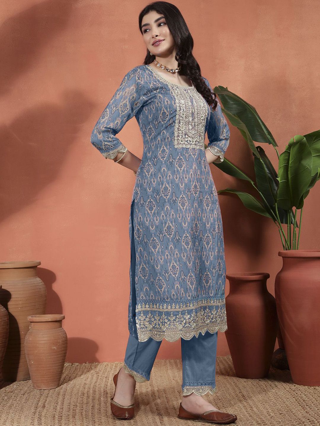Sangria Ethnic Motifs Printed Round Neck Sequinned Straight Kurta With Trousers & Dupatta