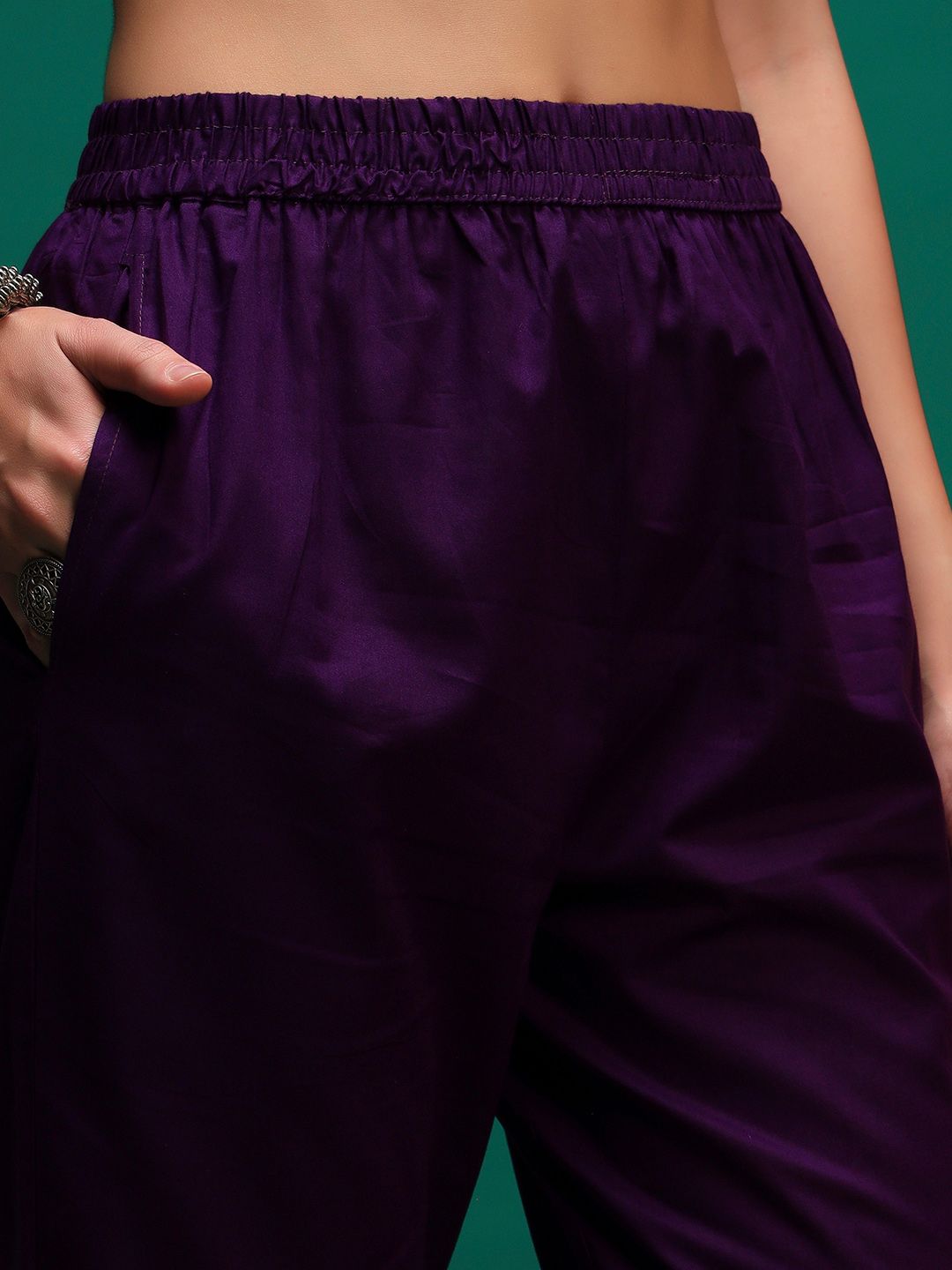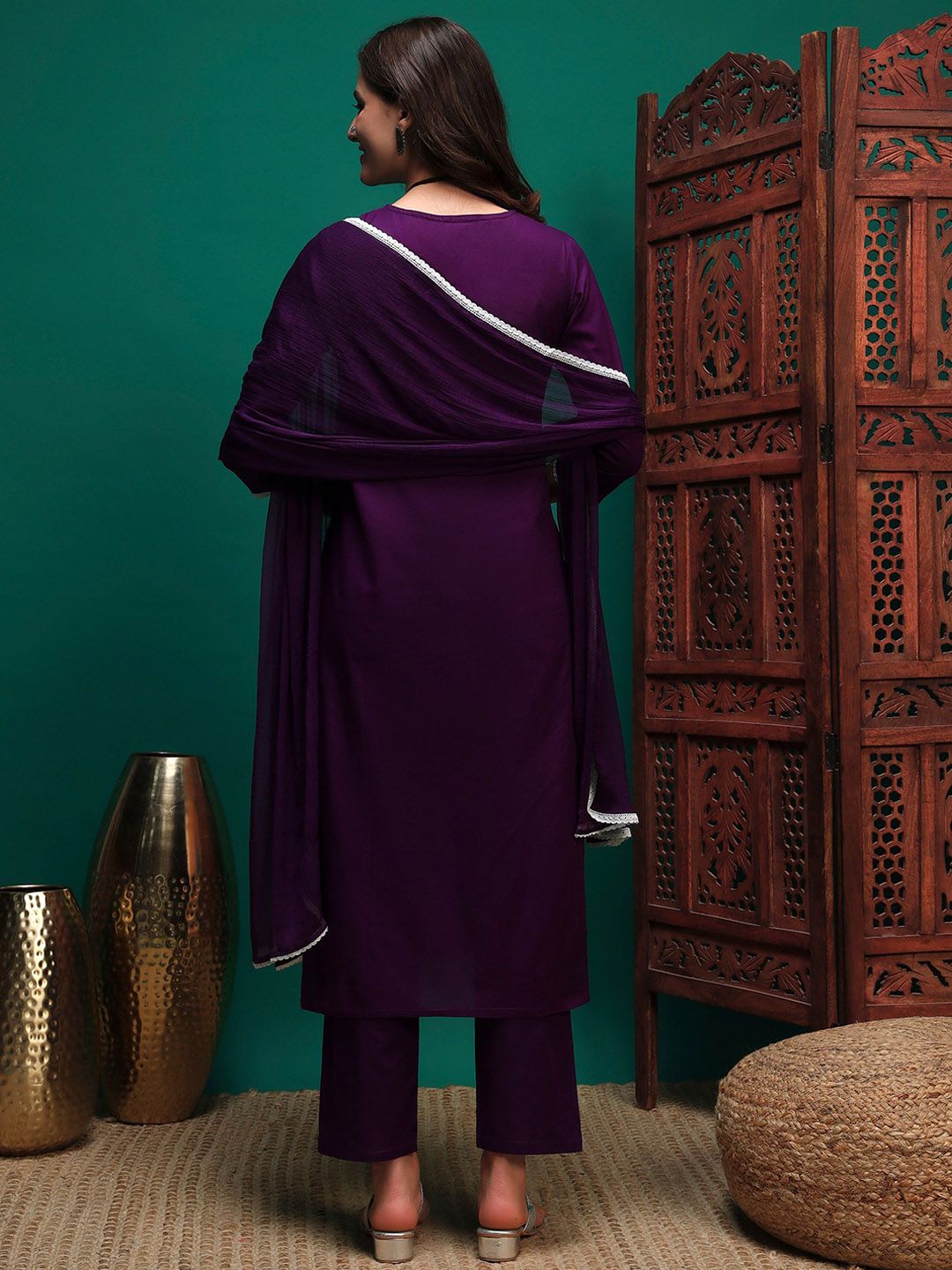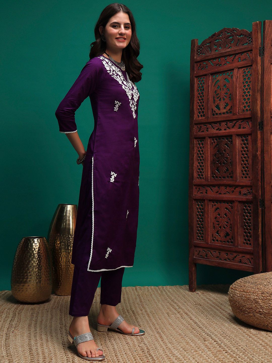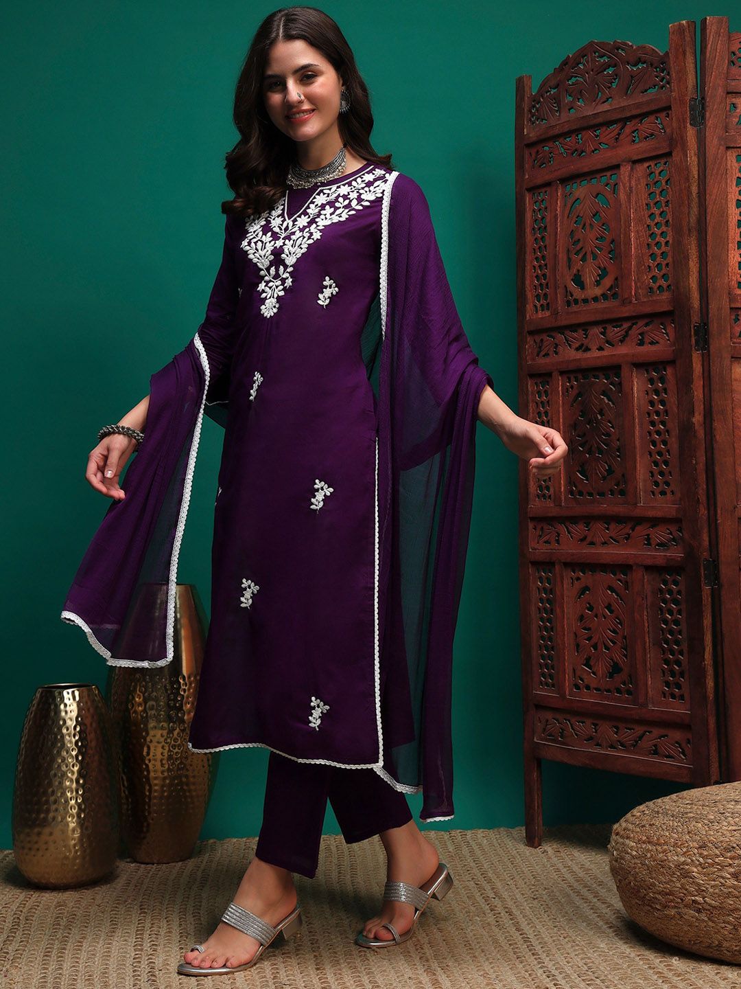 Sangria Floral Embroidered Chikankari Pure Cotton Straight Kurta With Trouser And Dupatta