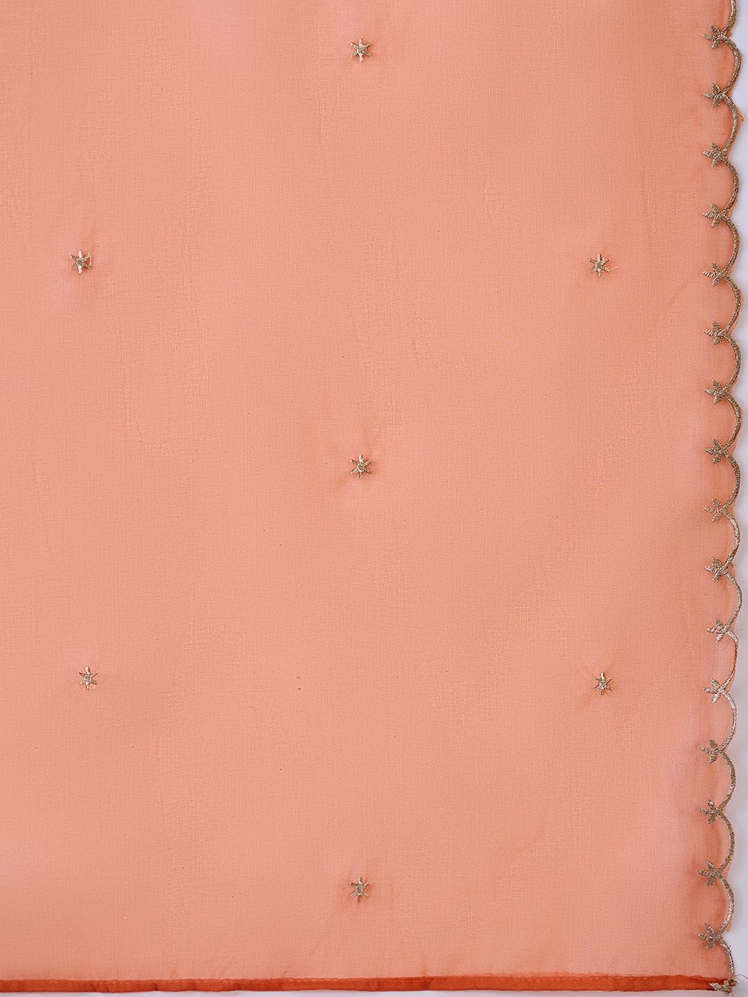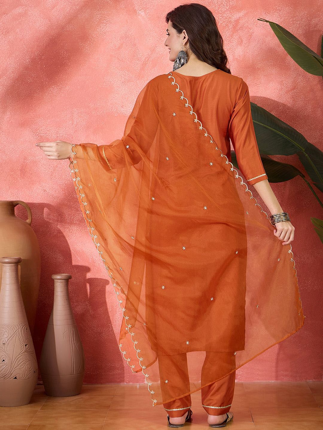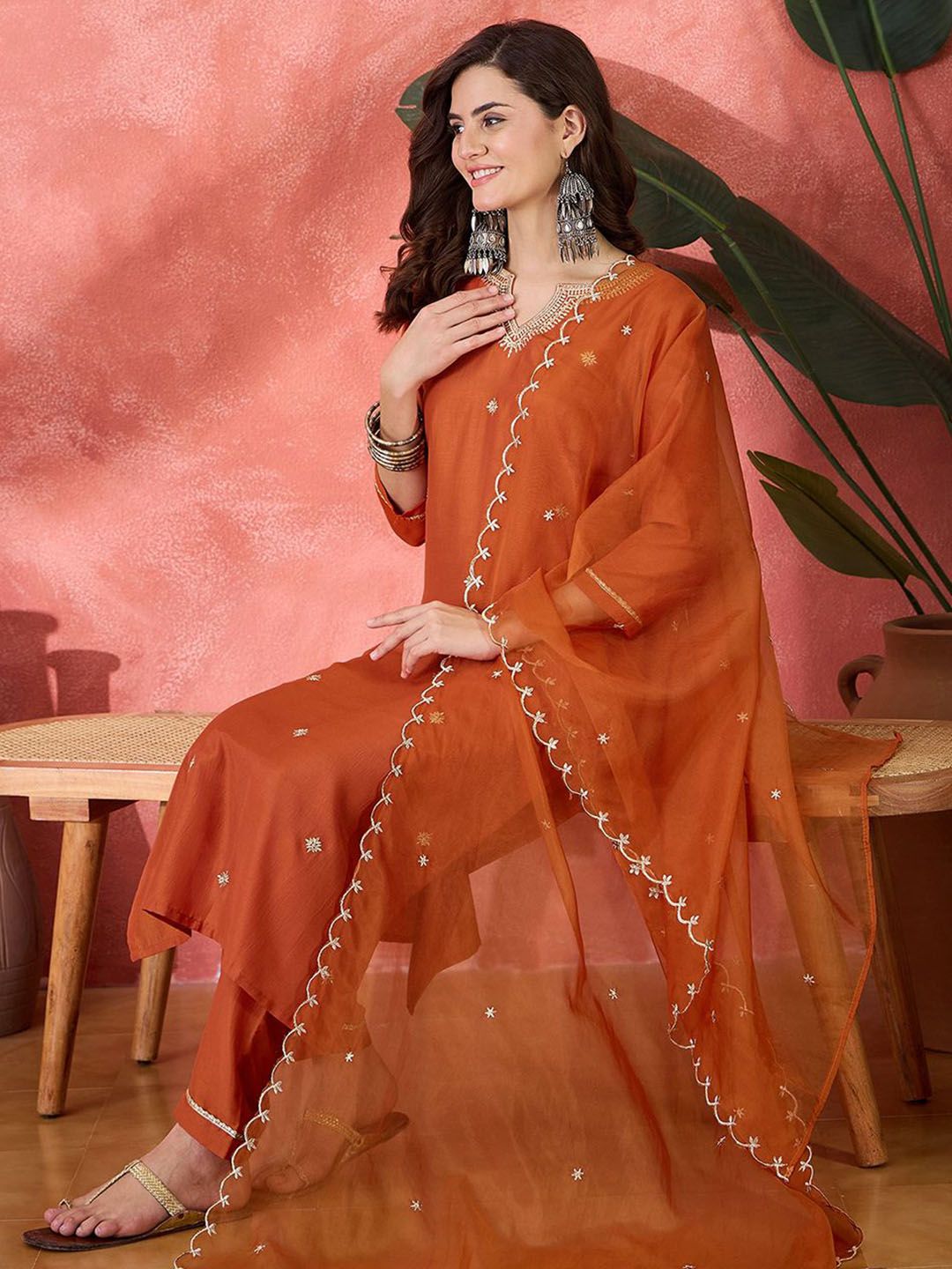 Sangria Floral Embroidered Notch Neck Thread Work Straight Kurta With Trouser & Dupatta