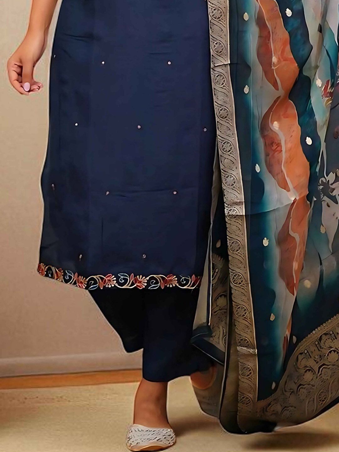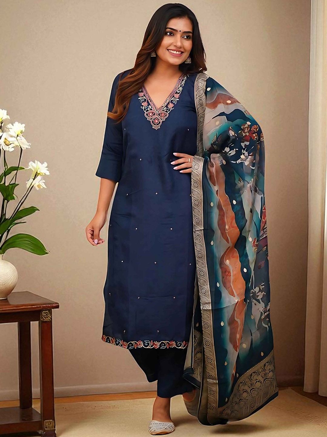 Sangria Floral Embroidered Thread Work V Neck Straight Kurta With Trouser And Dupatta