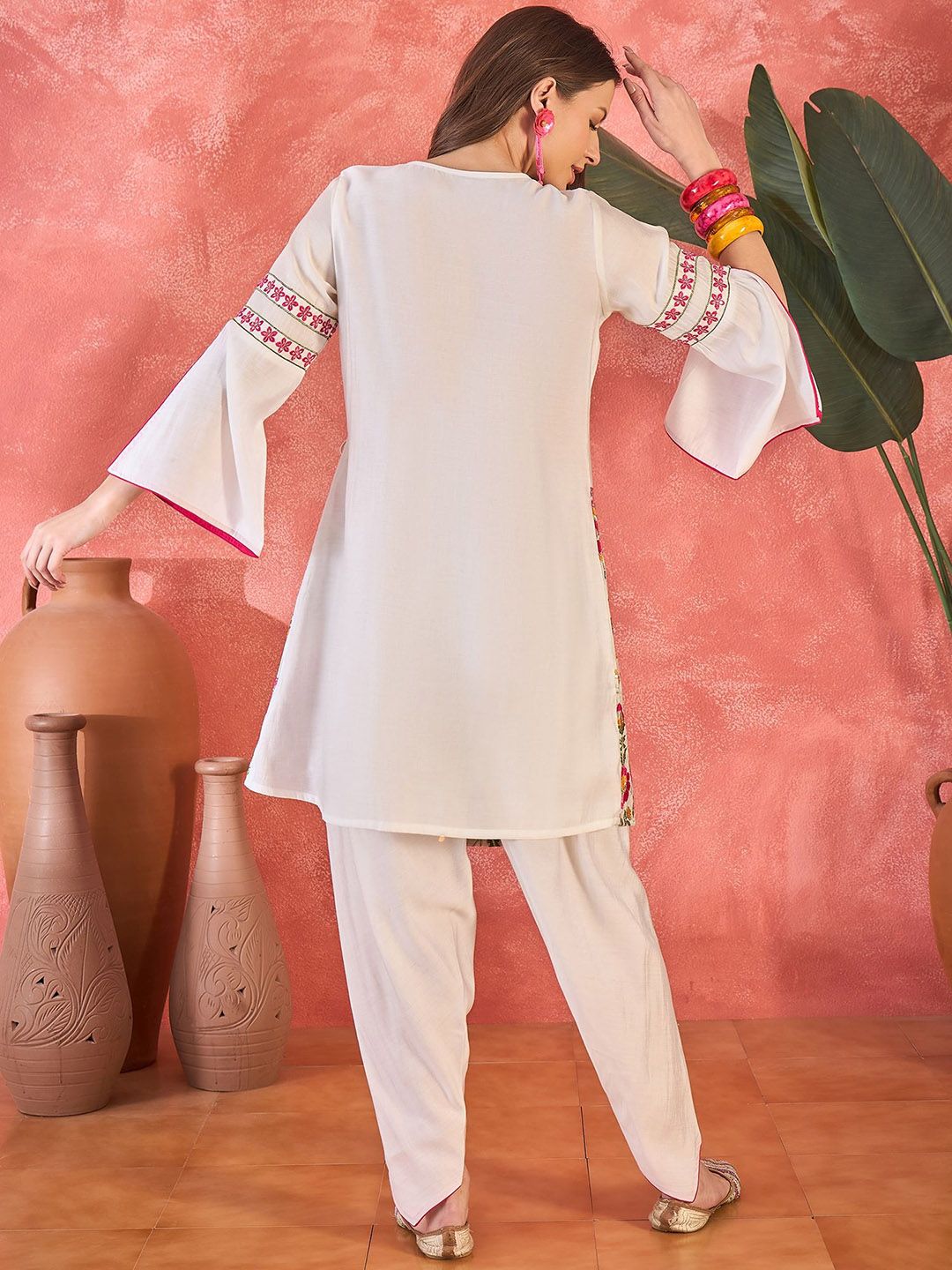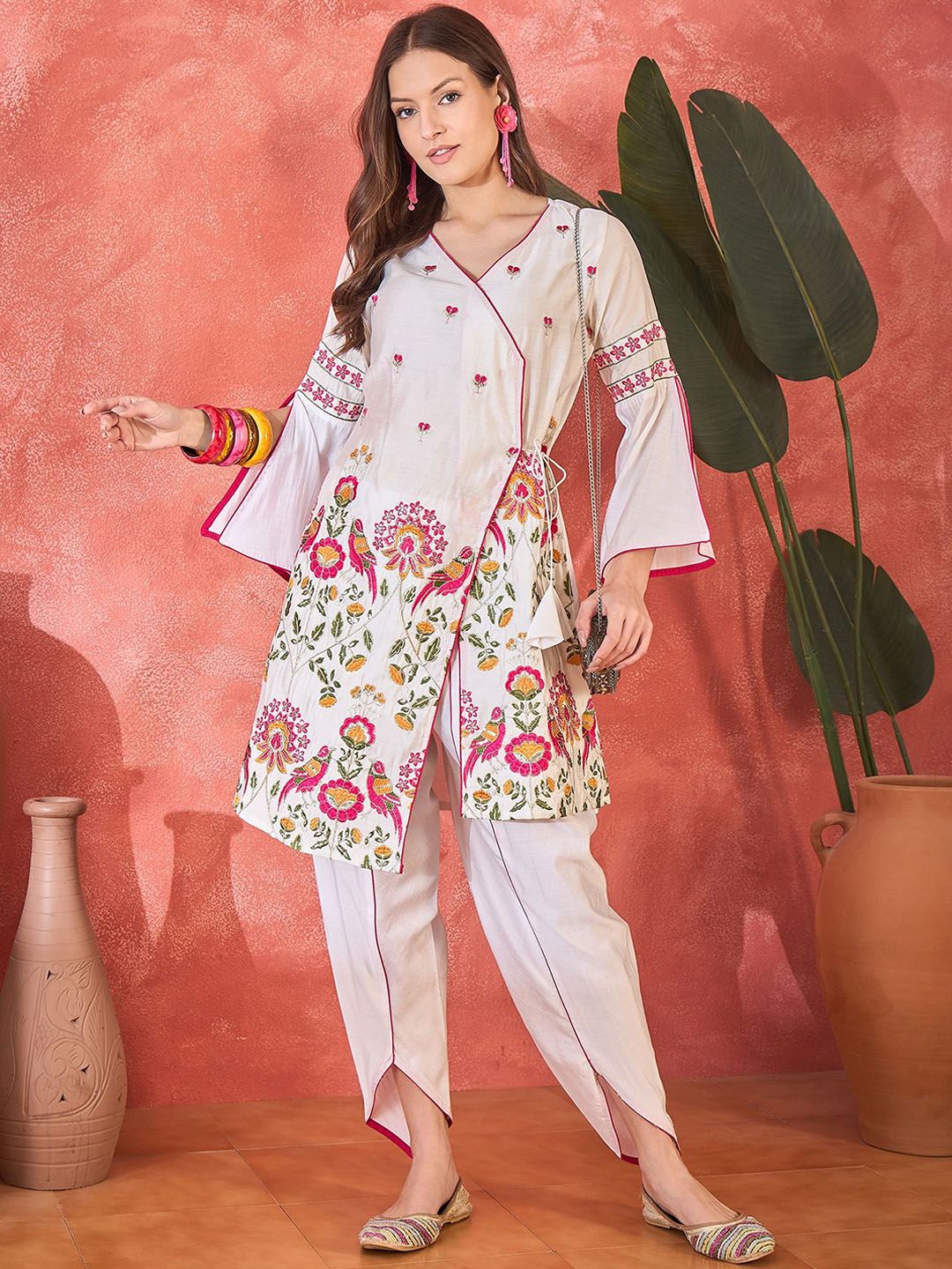 Sangria Floral Embroidered V-Neck Angrakha A-Line Kurta With Dhoti Pant