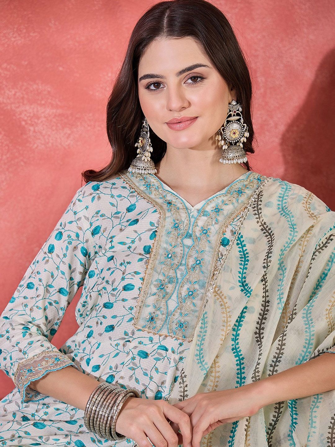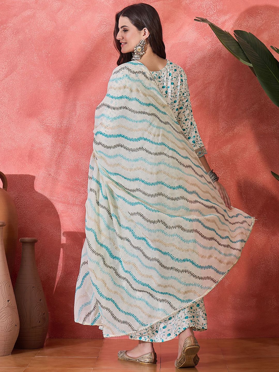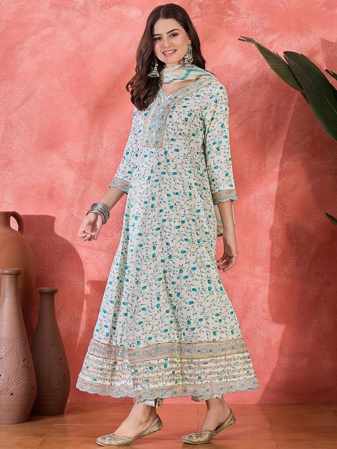 Sangria Floral Embroidered V-Neck Sequinned Anarkali Kurta With Trousers & Dupatta