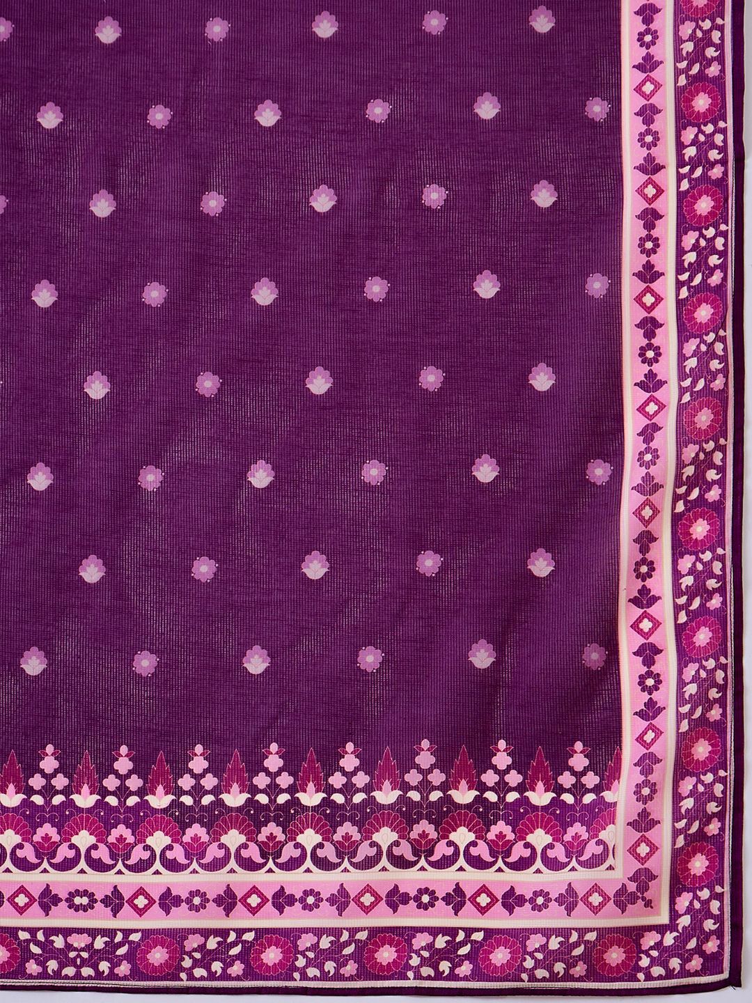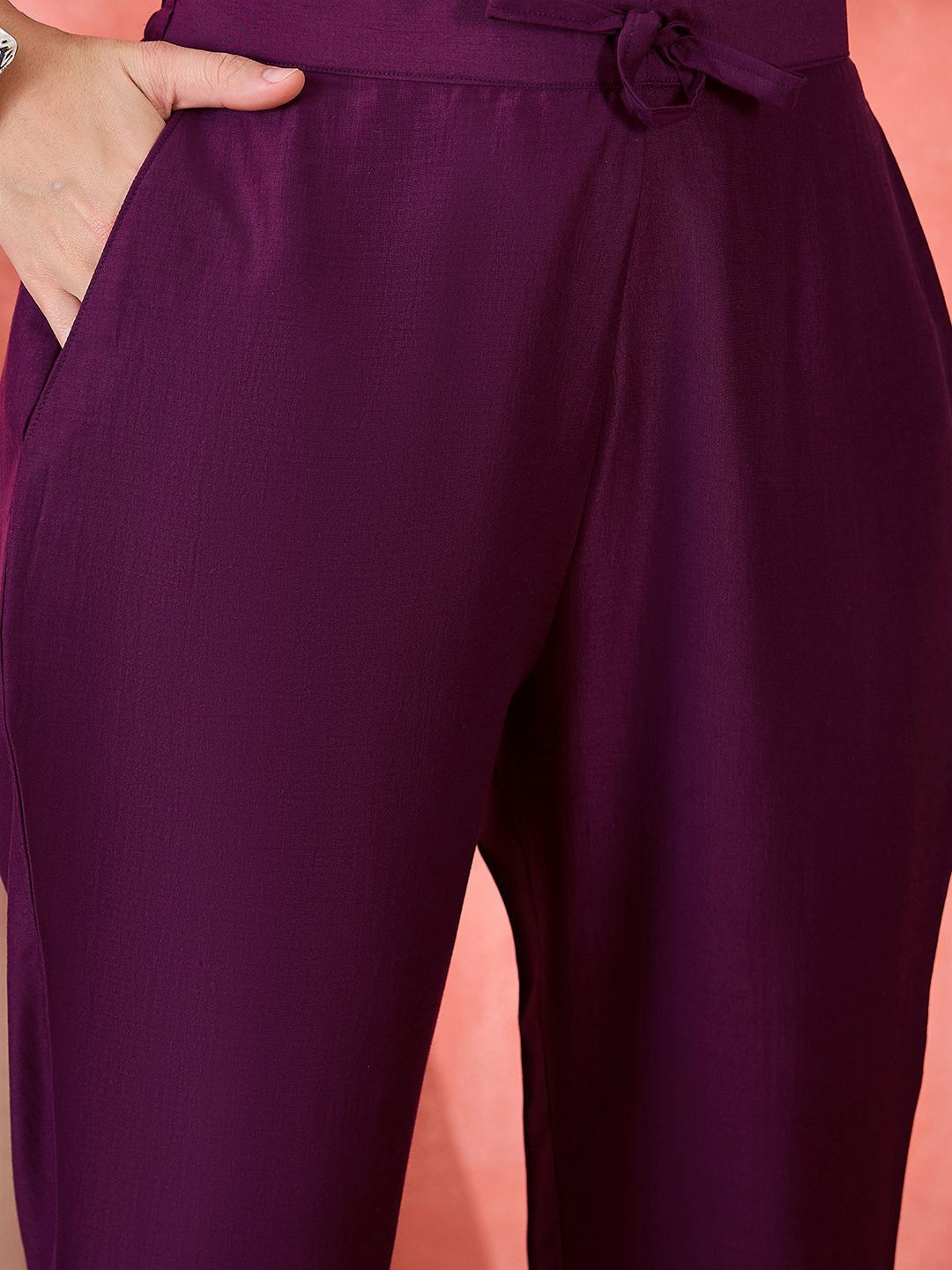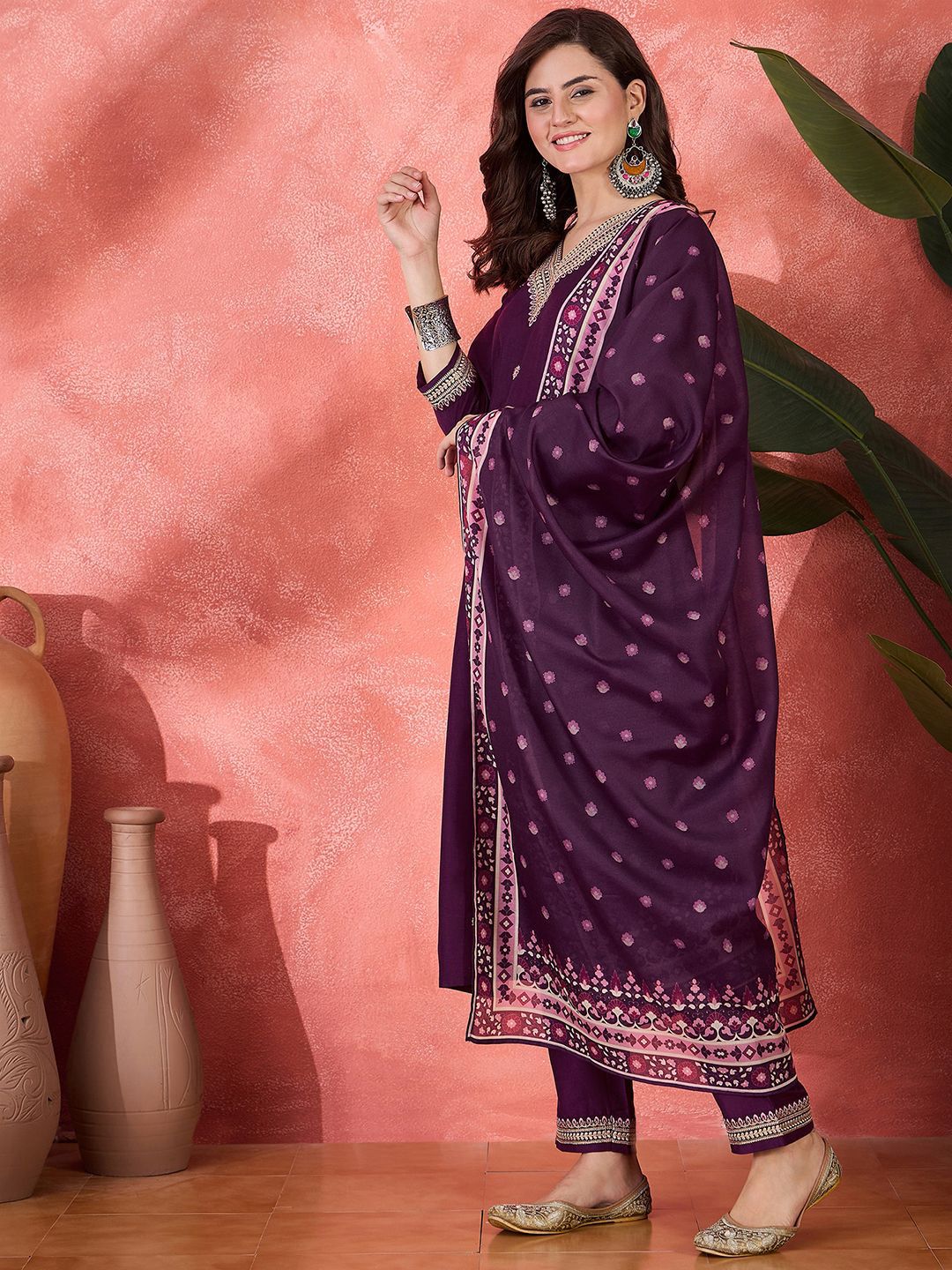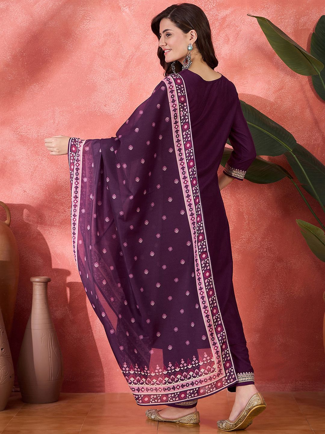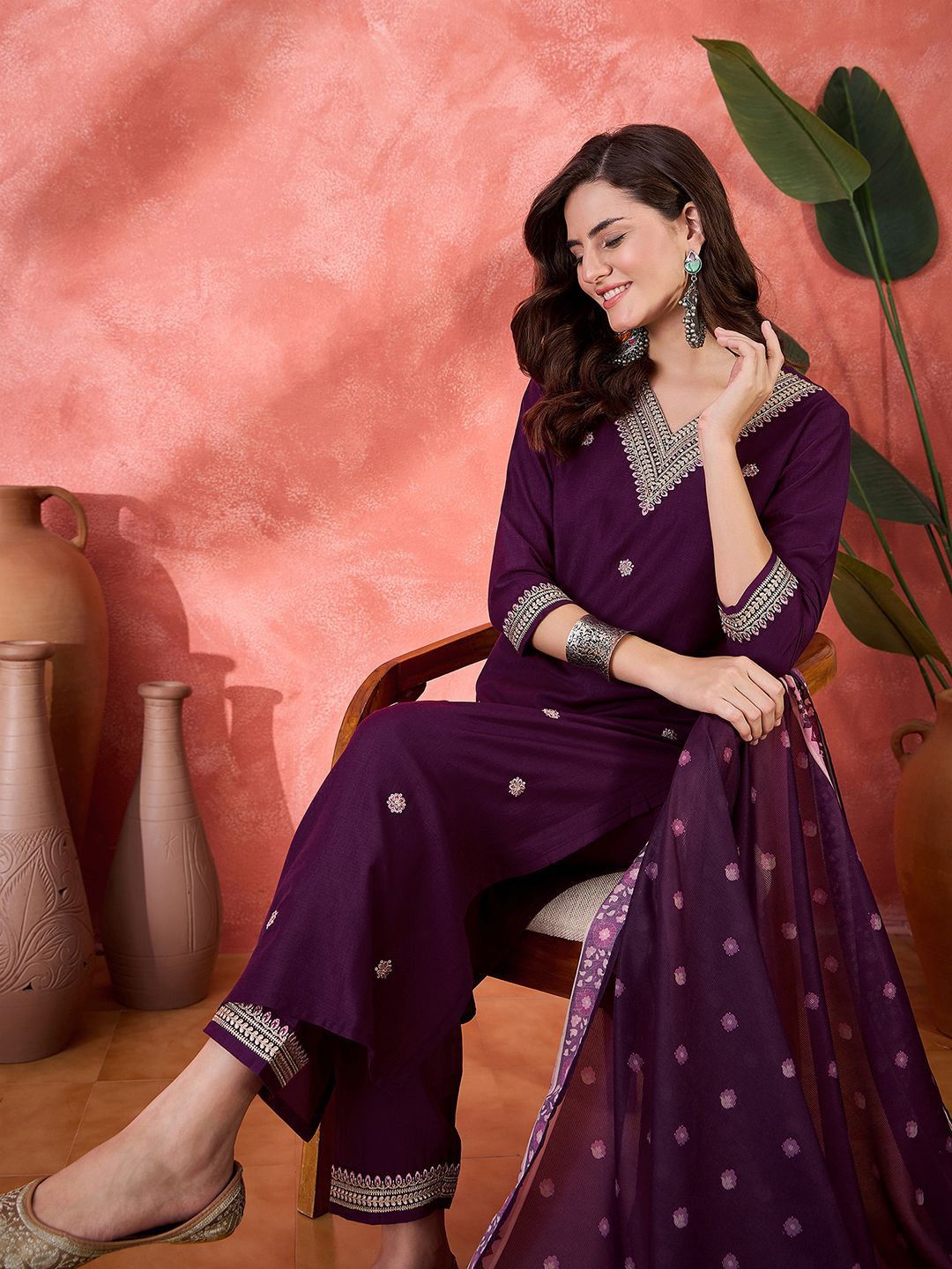 Sangria Floral Embroidered V-Neck Straight Kurta With Trouser And Dupatta