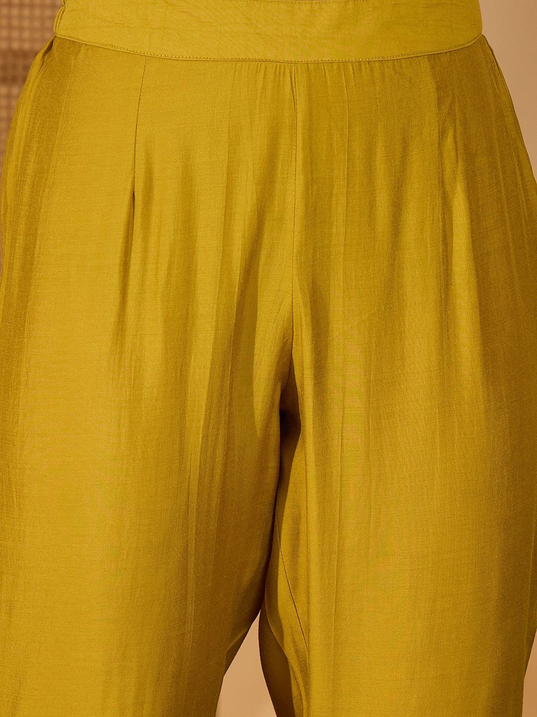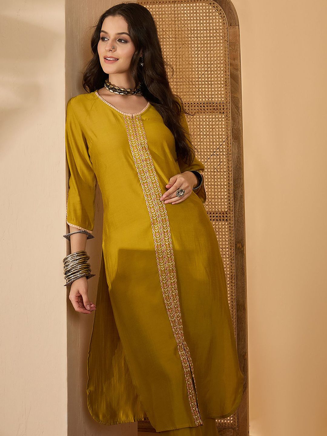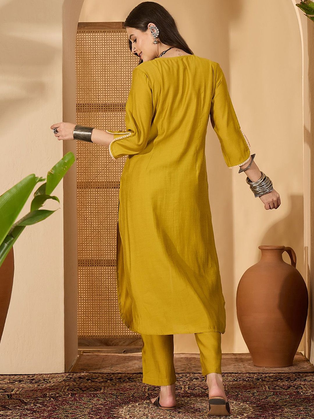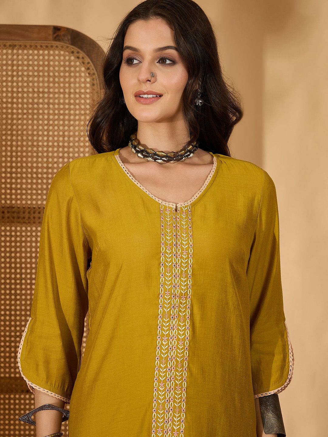 Sangria Floral Embroidered V-Neck Straight Kurta With Trousers