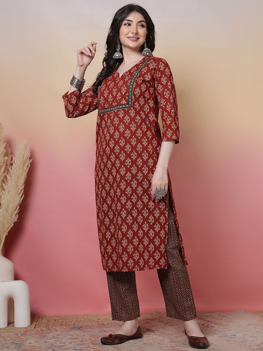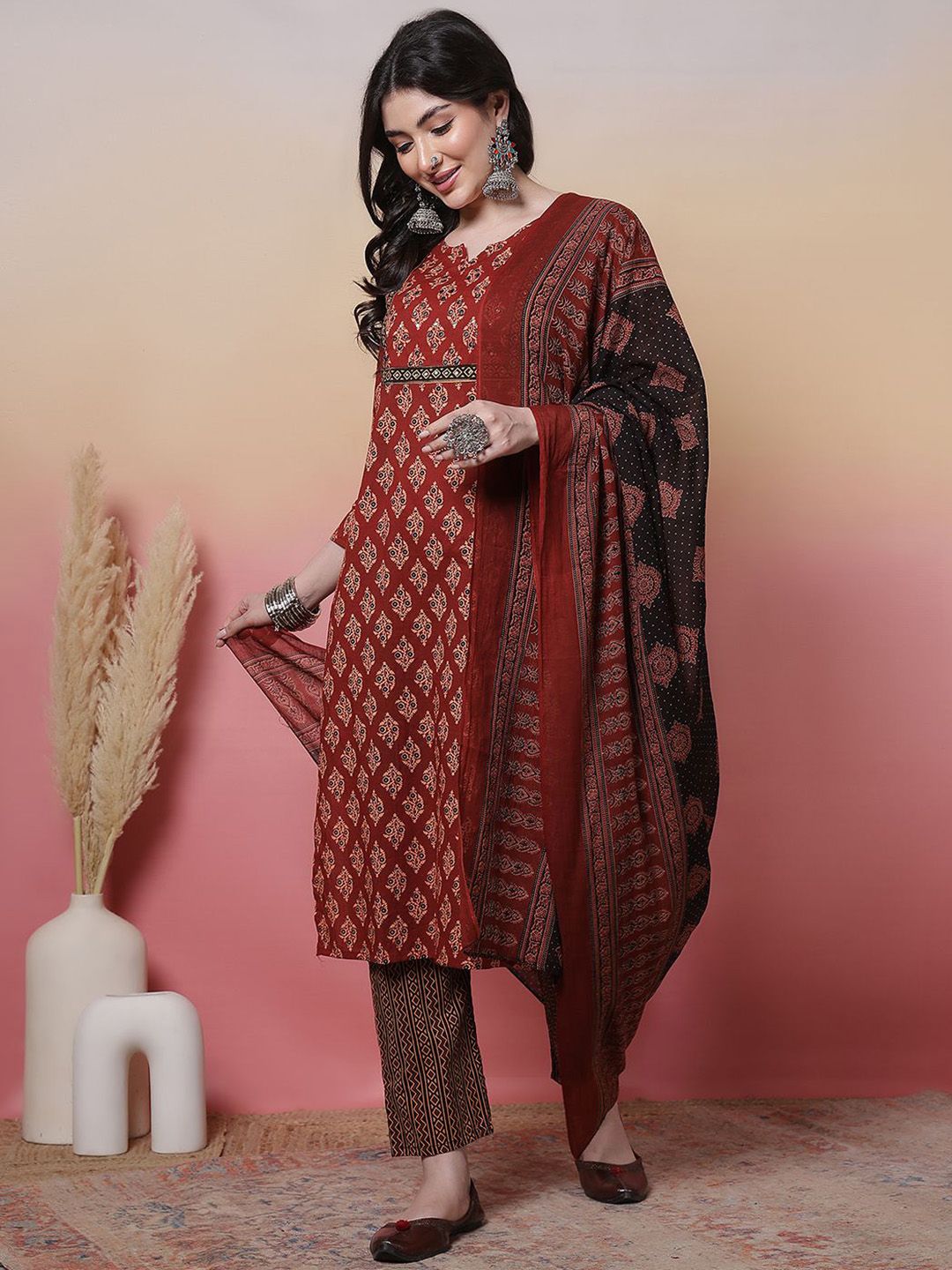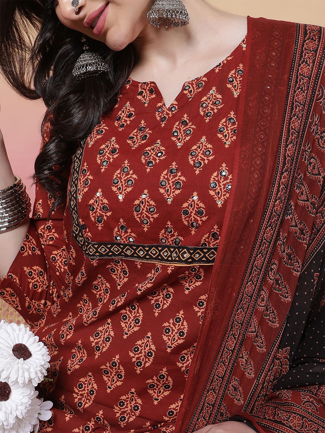Sangria Floral Printed Notch Neck Pure Cotton Straight Kurta With Trouser & Dupatta