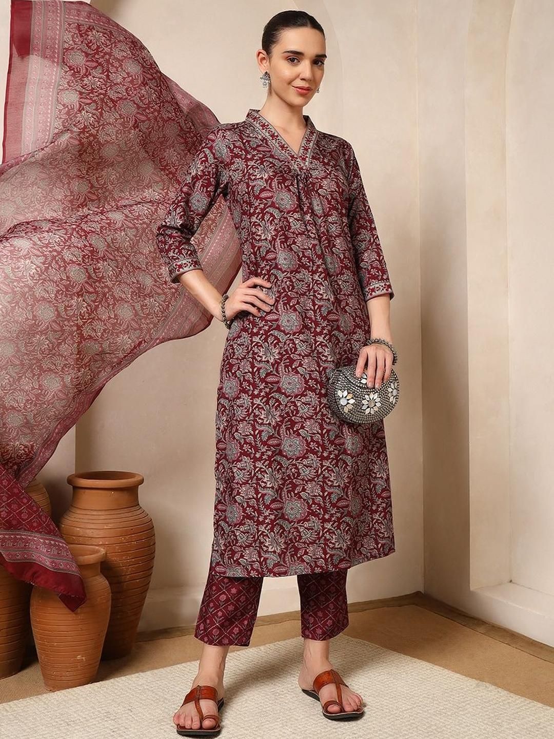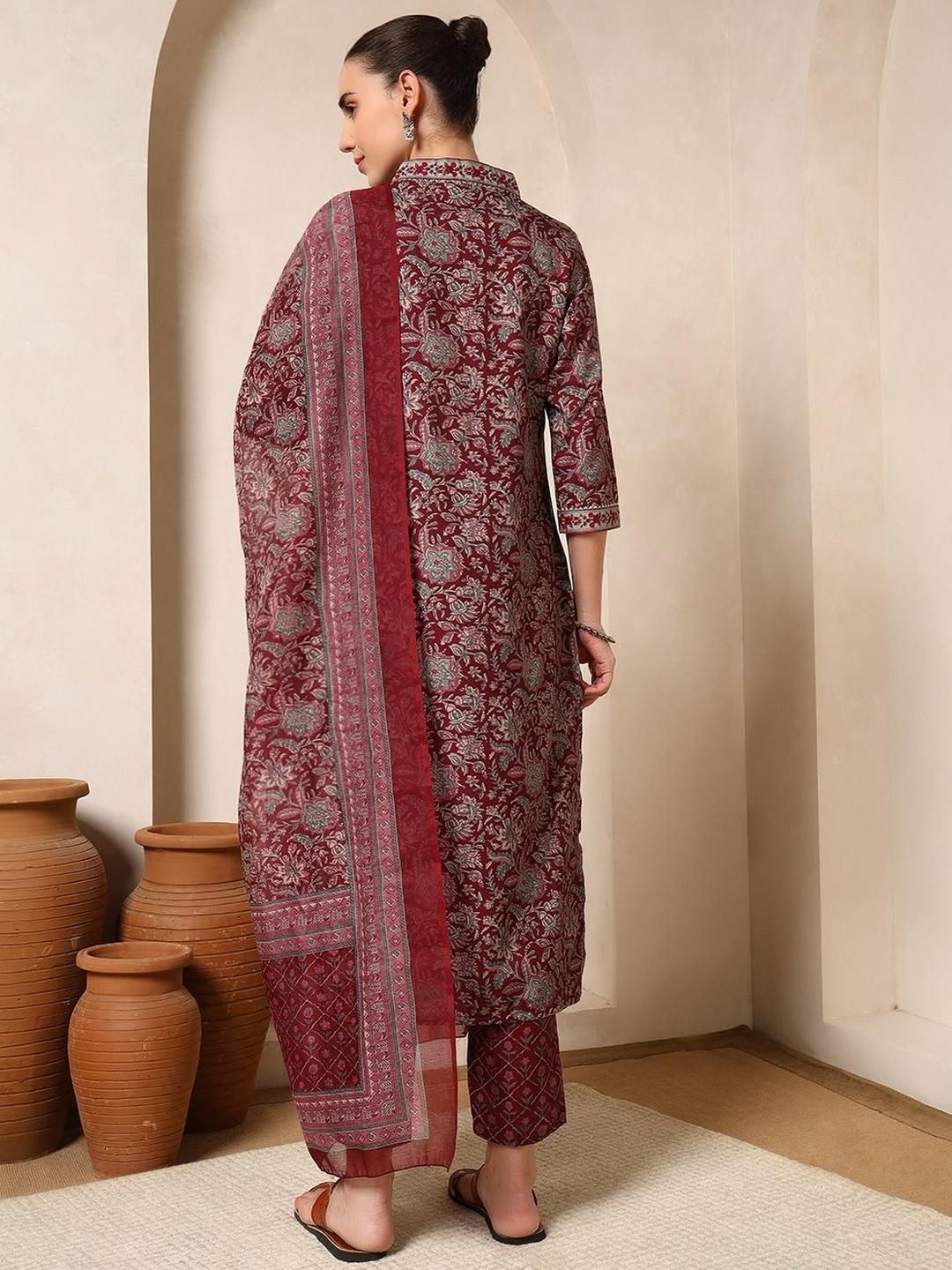 Sangria Floral Printed Pleated Thread Work Straight Kurta with Trouser & Dupatta