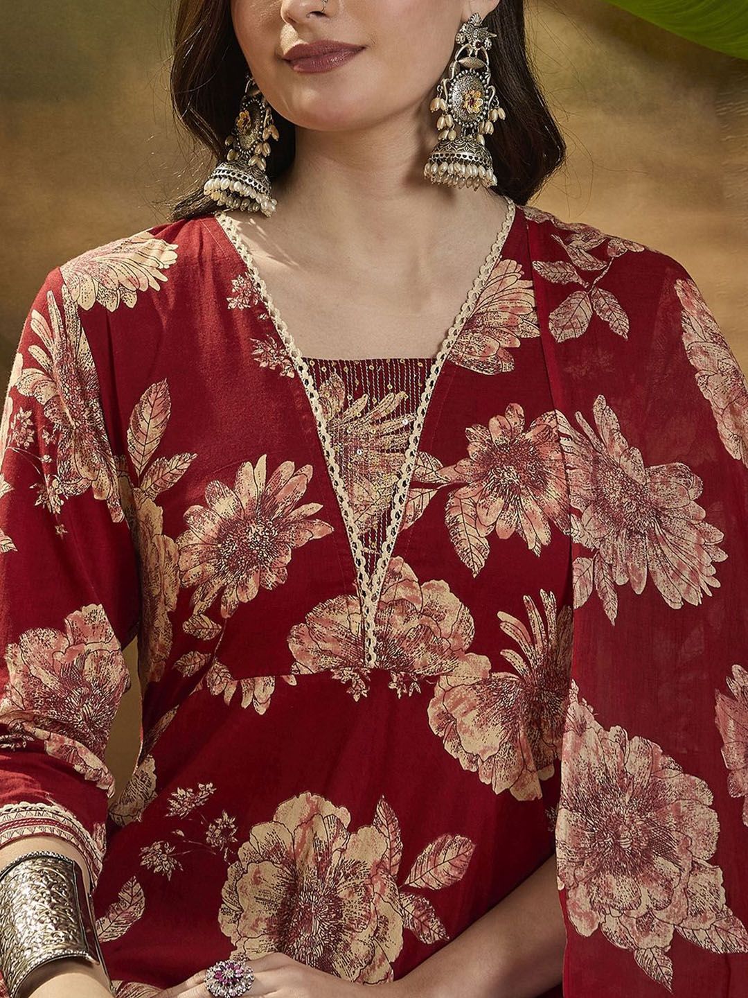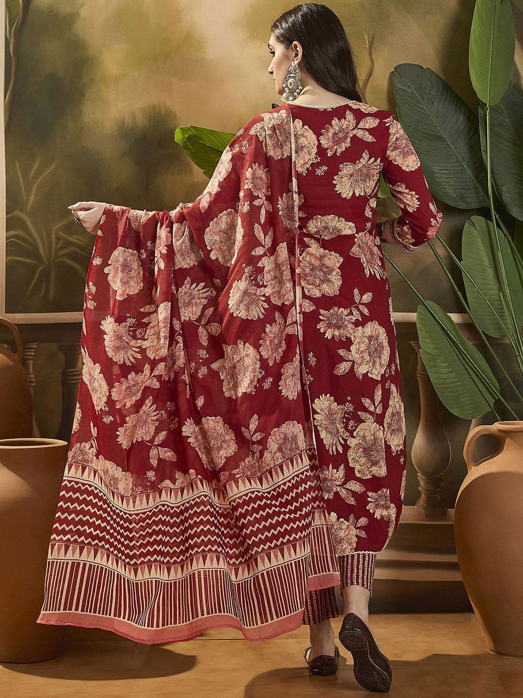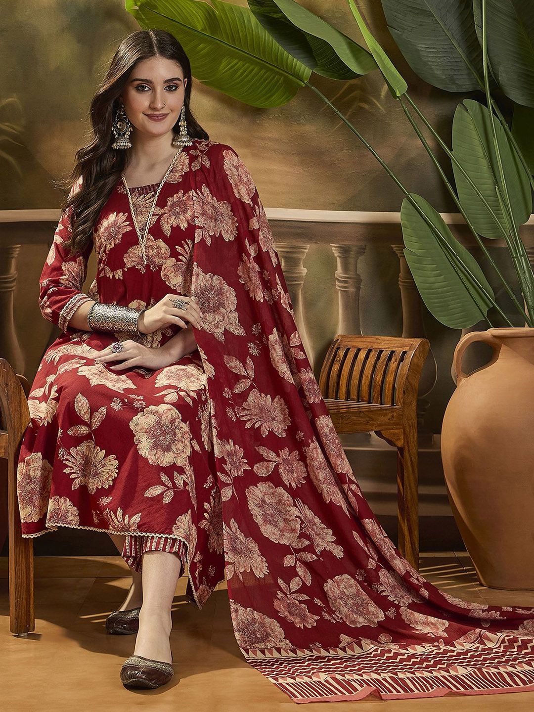 Sangria Floral Printed Pure Cotton Anarkali Kurta With Trouser & Dupatta