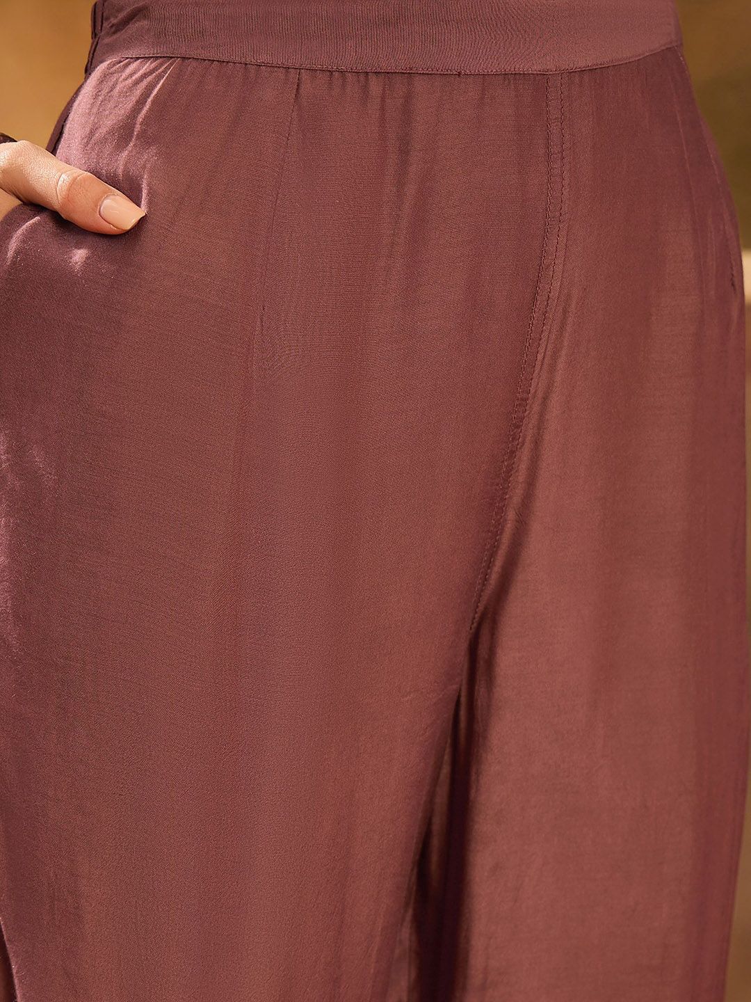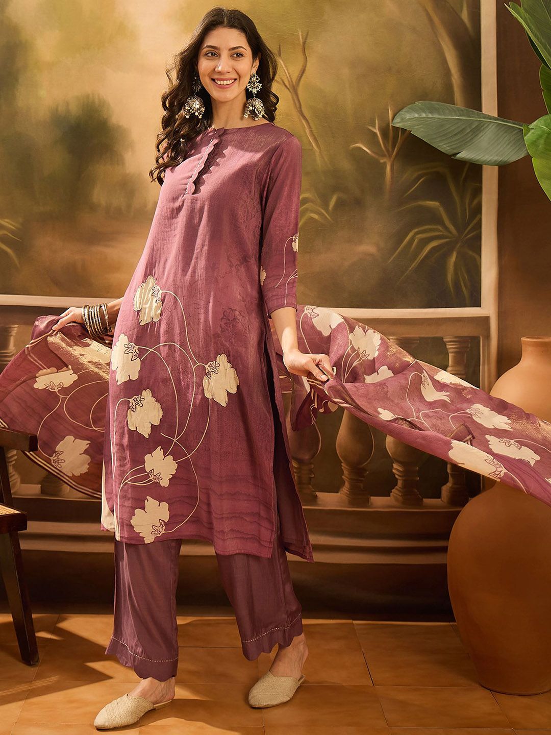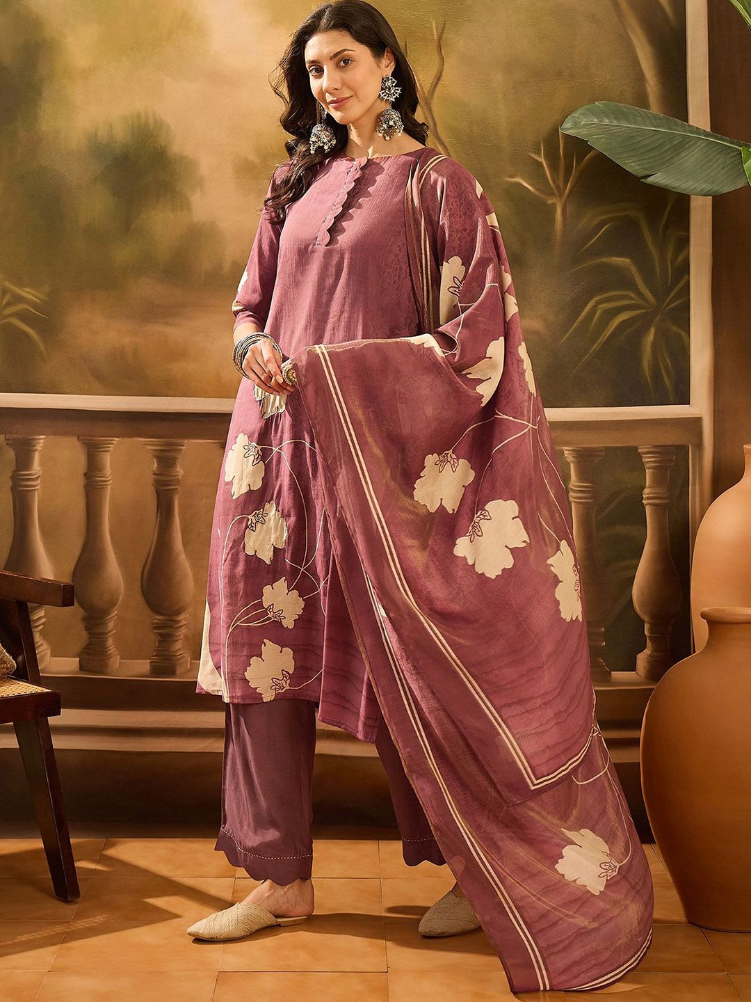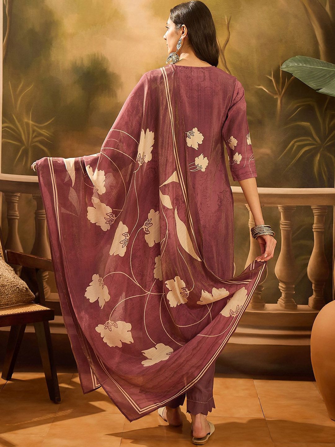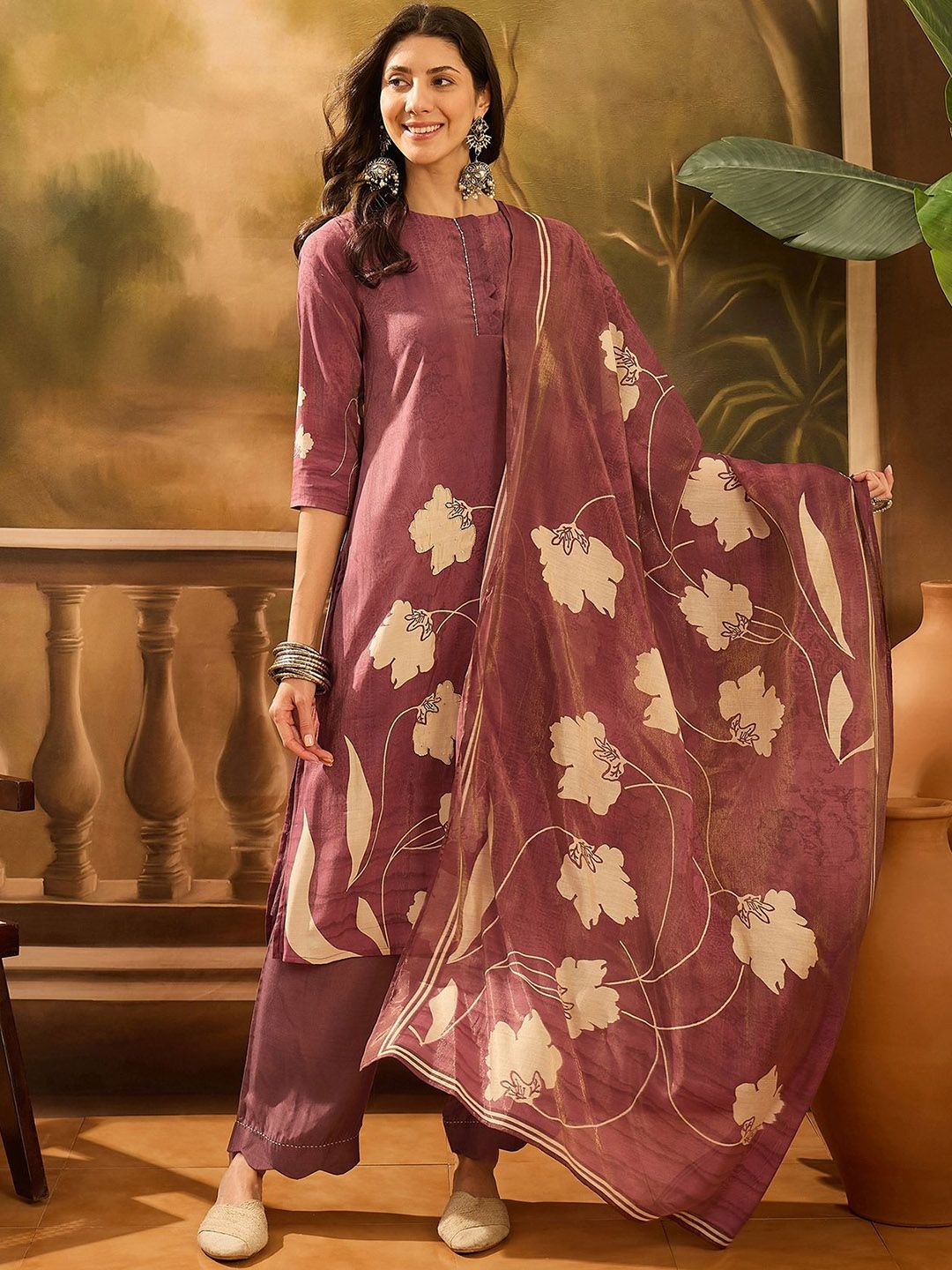 Sangria Floral Printed Round Neck Straight Kurta With Palazzos & Dupatta