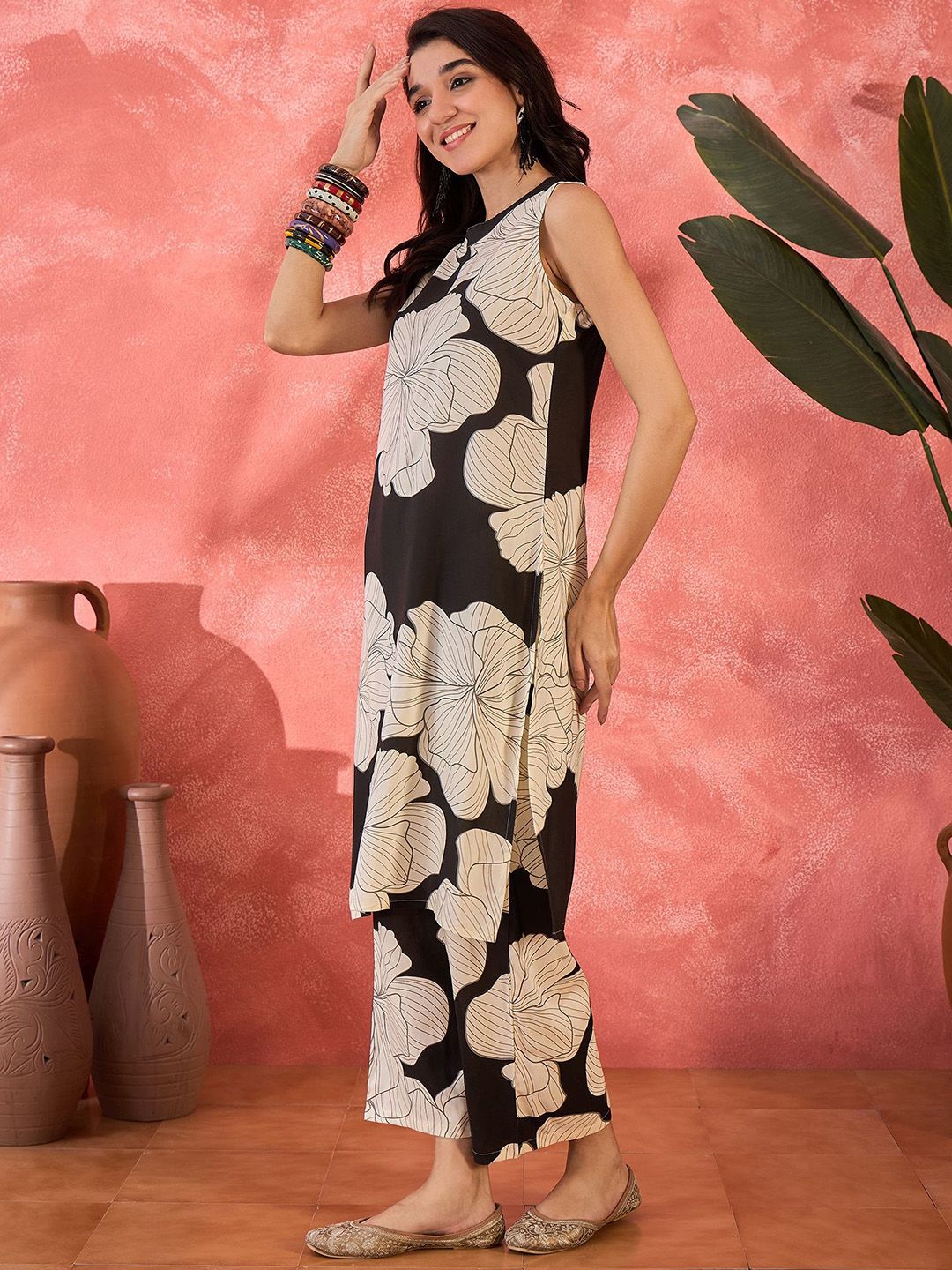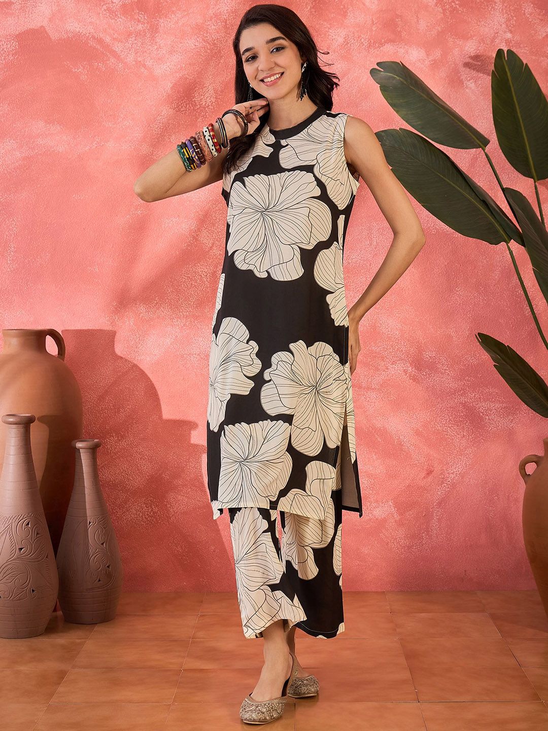 Sangria Floral Printed Round Neck Straight Kurta With Trousers