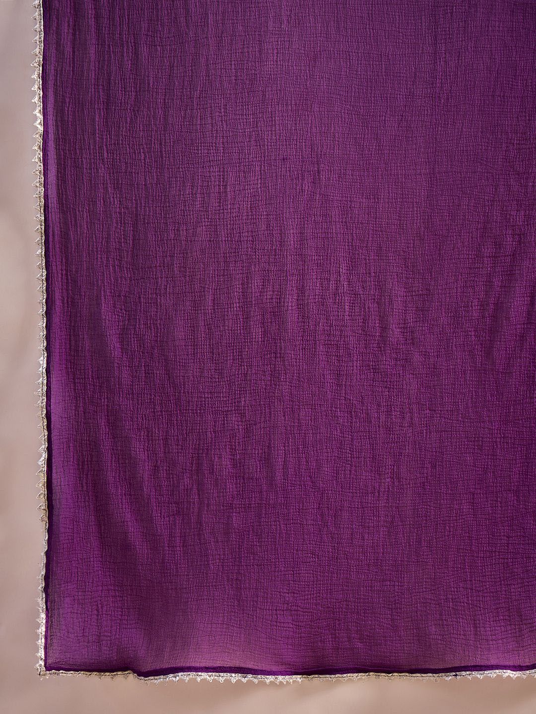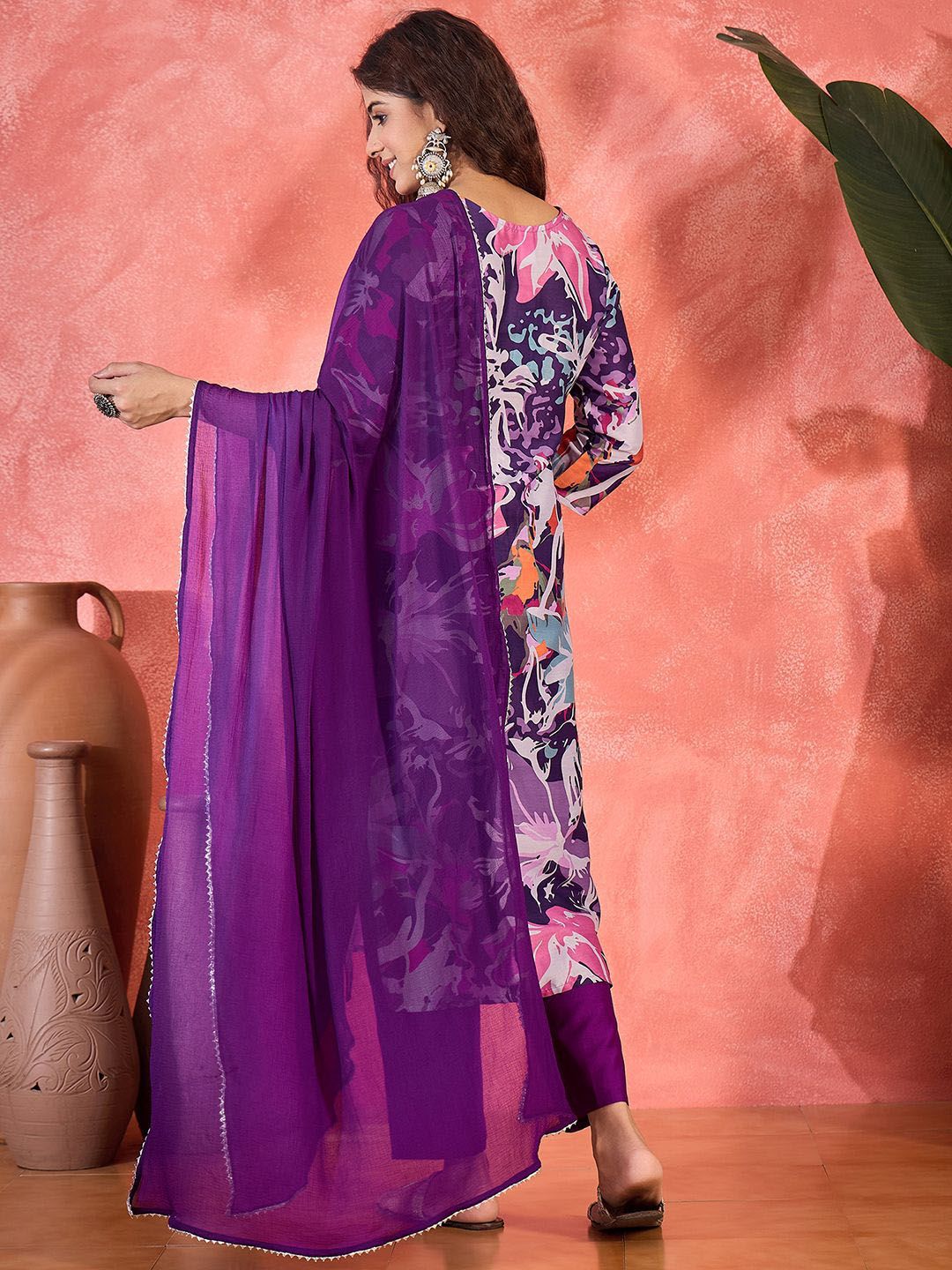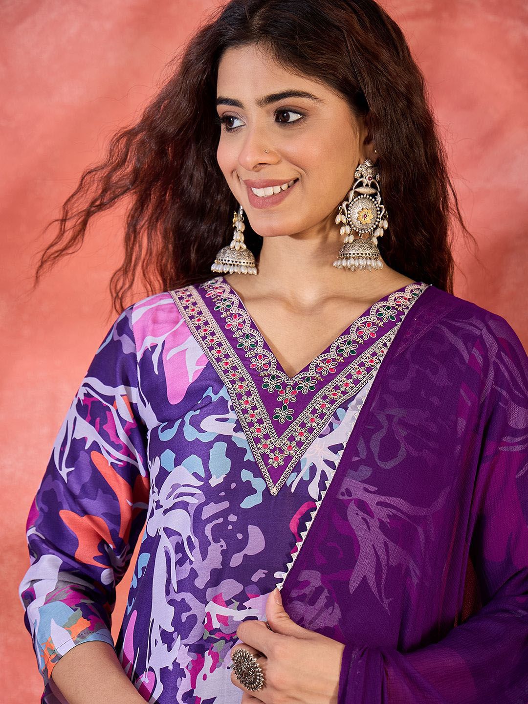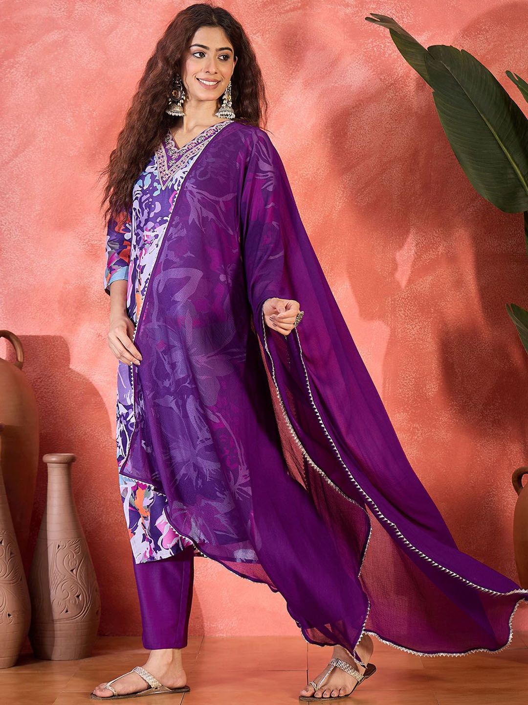 Sangria Floral Printed V-Neck Thread Work Straight Kurta With Trouser & Dupatta