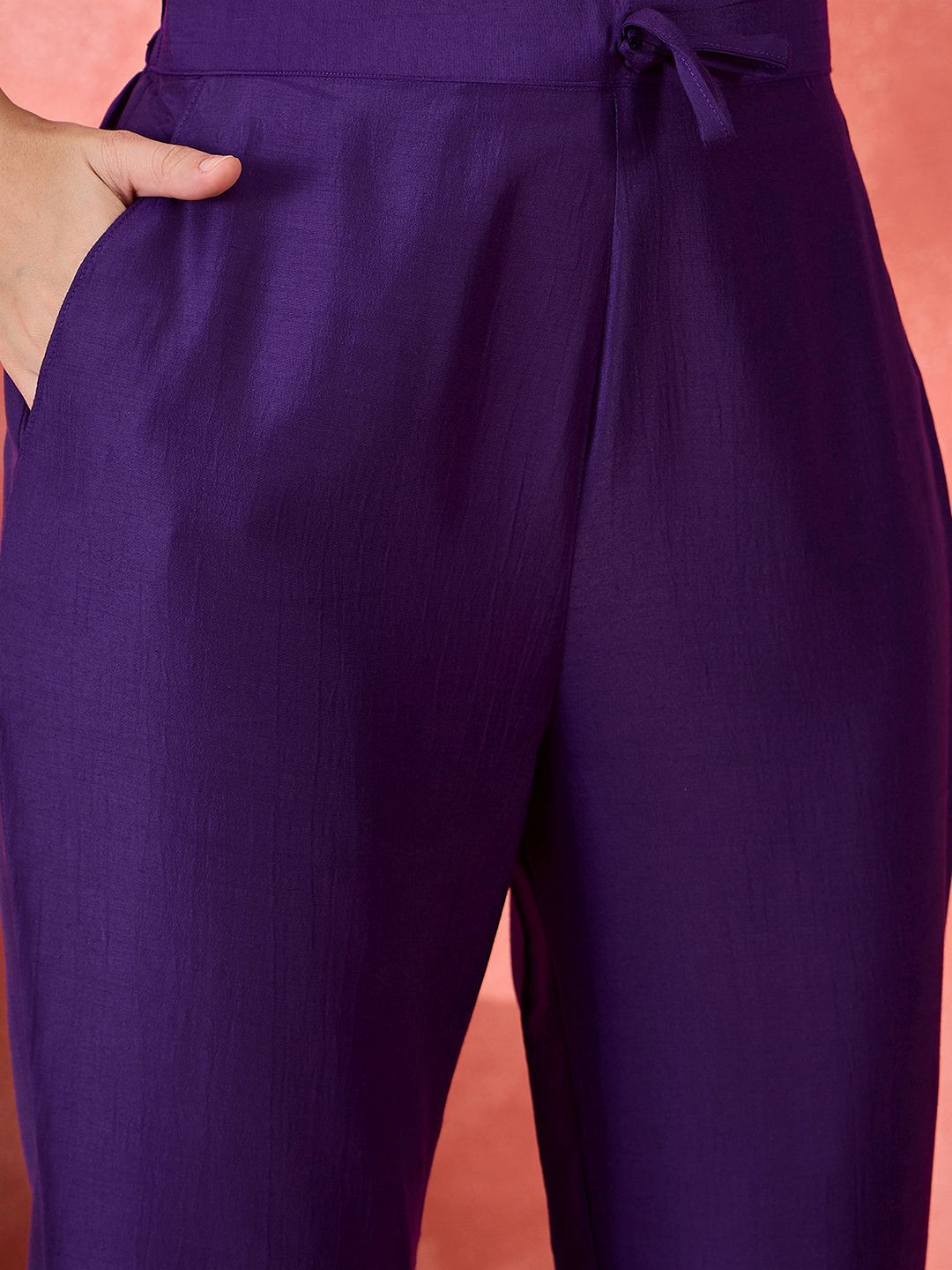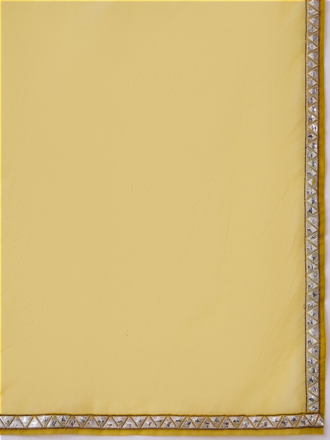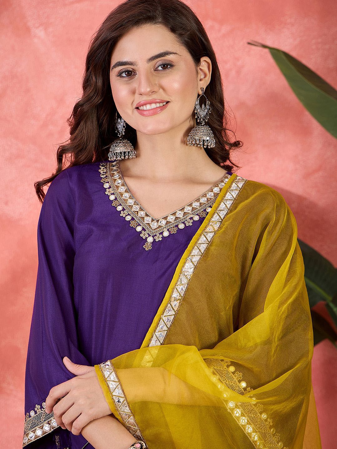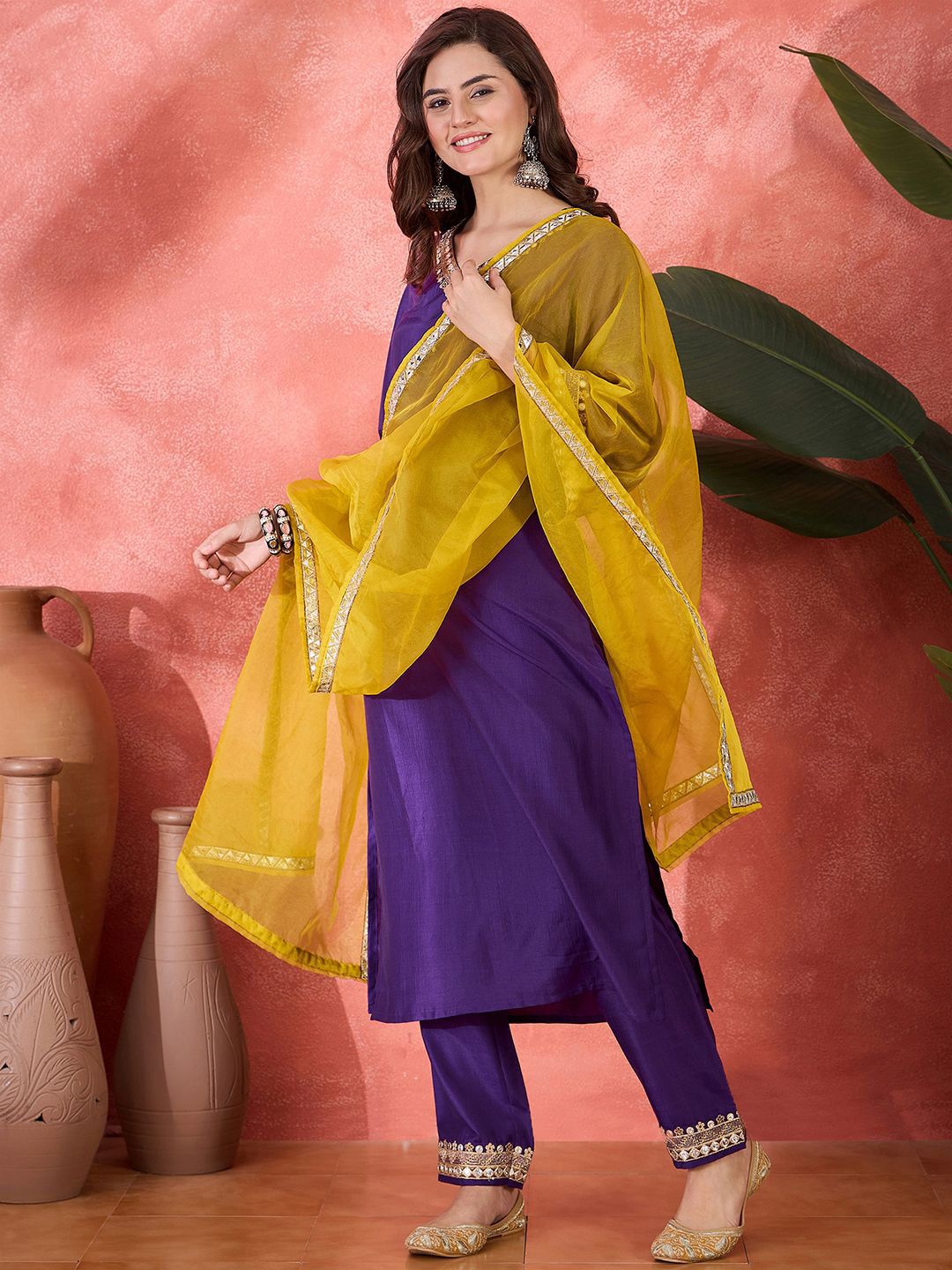 Sangria Floral Yoke Deisgn V Neck Zari Straight Kurta & Trousers With Dupatta