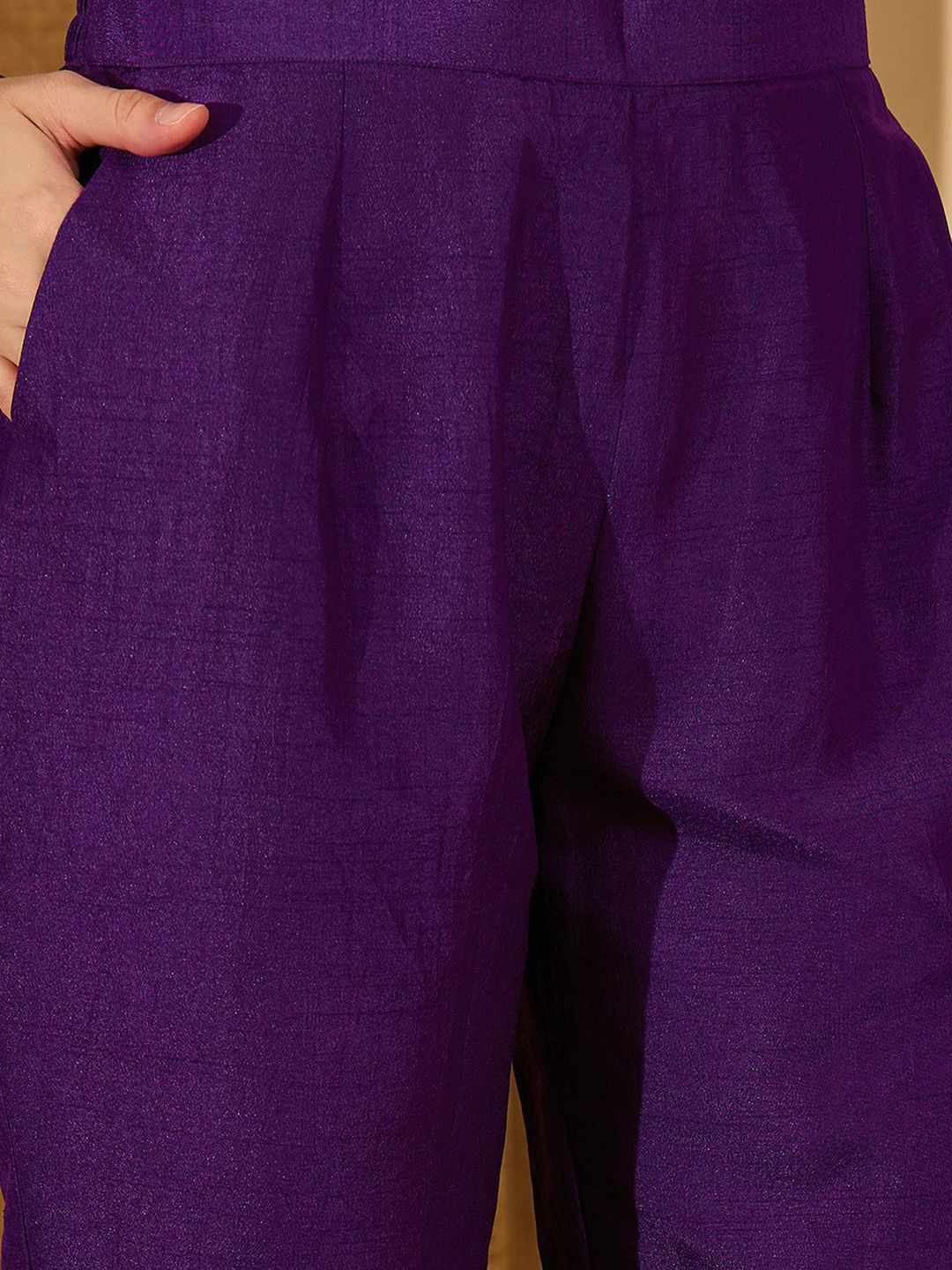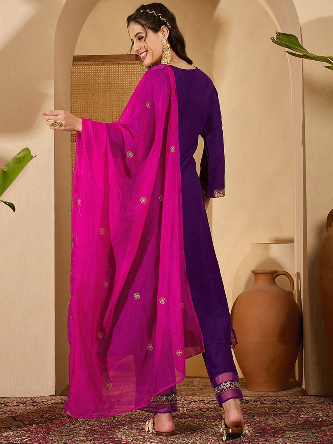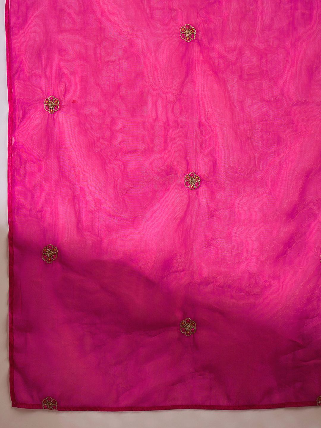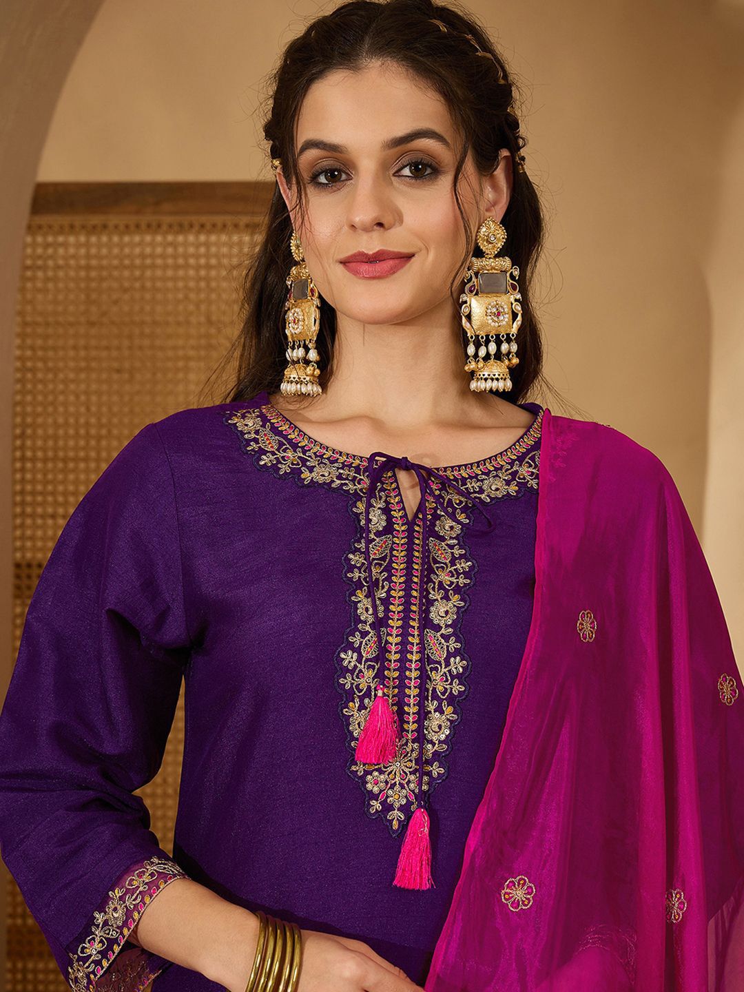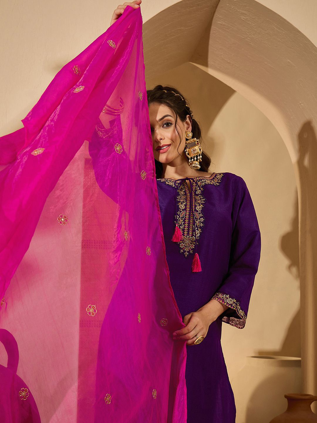 Sangria Floral Yoke Design Tie-Up Neck Thread Work Silk Kurta With Trouser And Dupatta