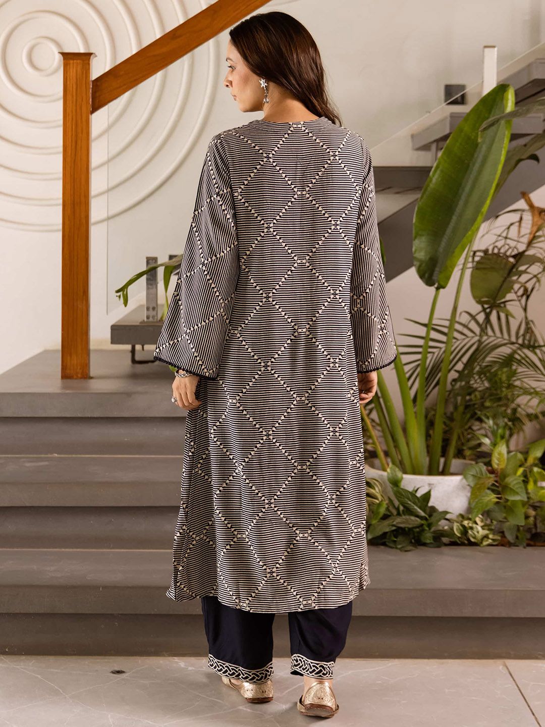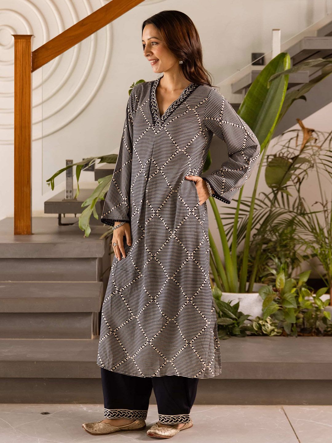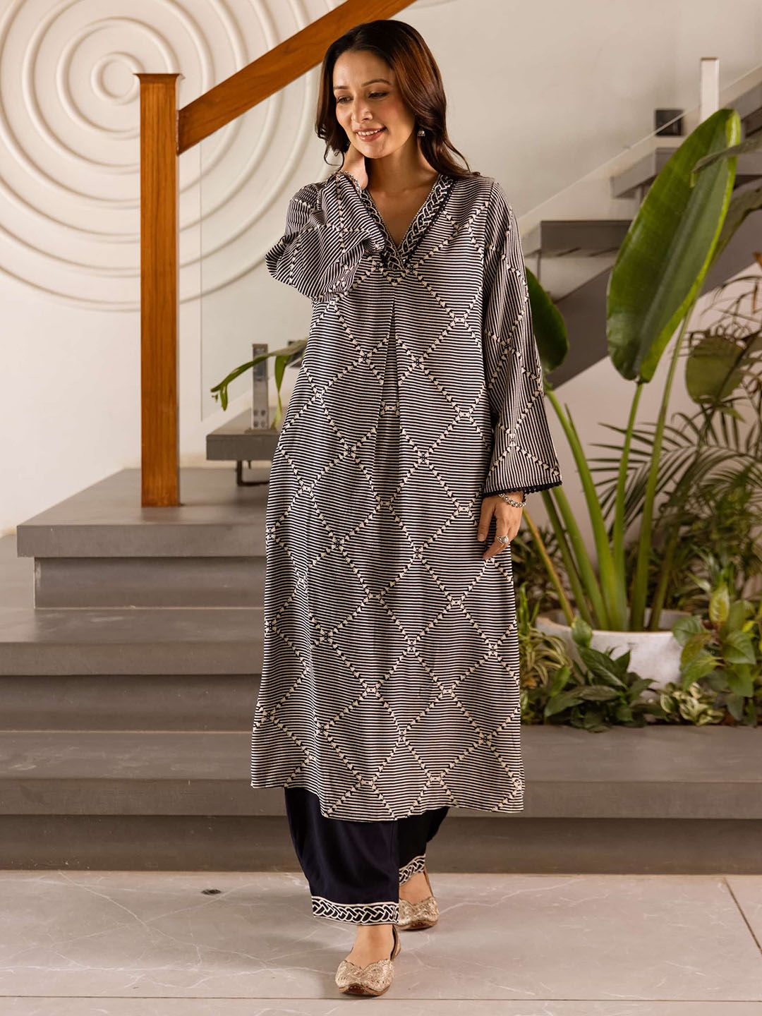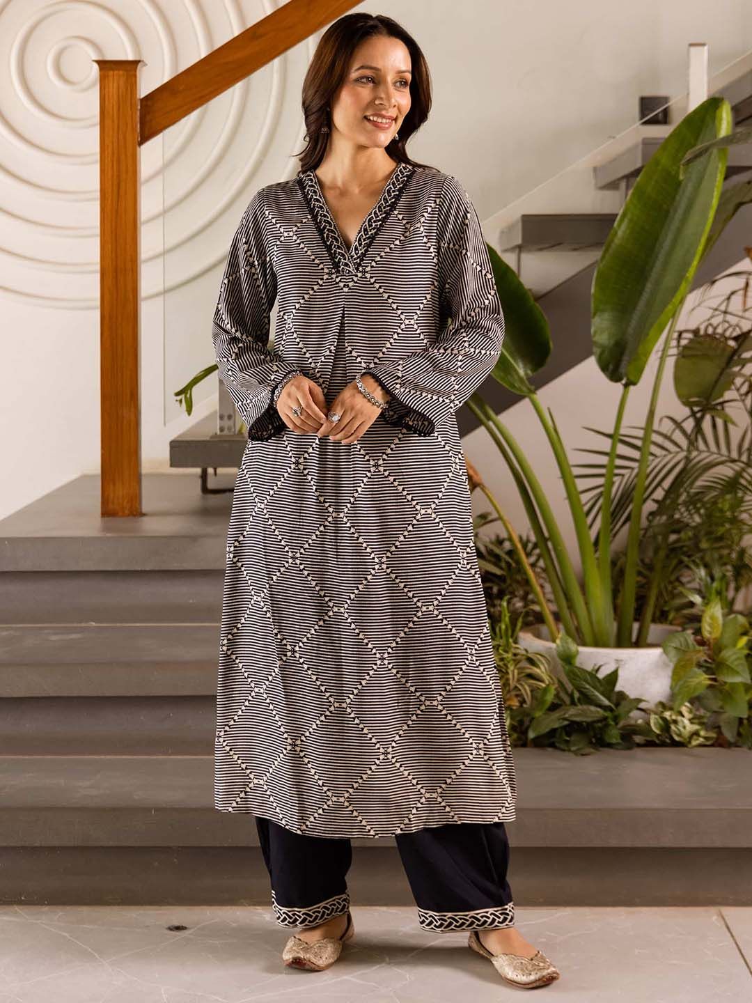 Sangria Geometric Self Design V-Neck Thread Work Kurta With Palazzo