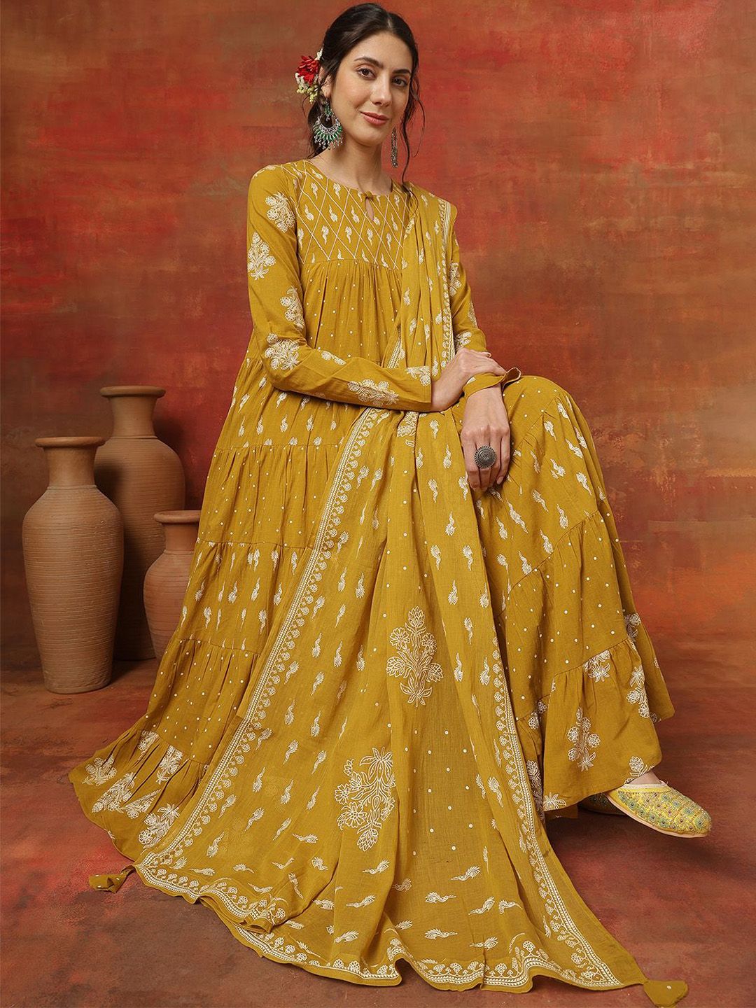 Sangria Printed Pure Cotton Key Hole-Neck Anarkali Kurta & Trousers With Dupatta