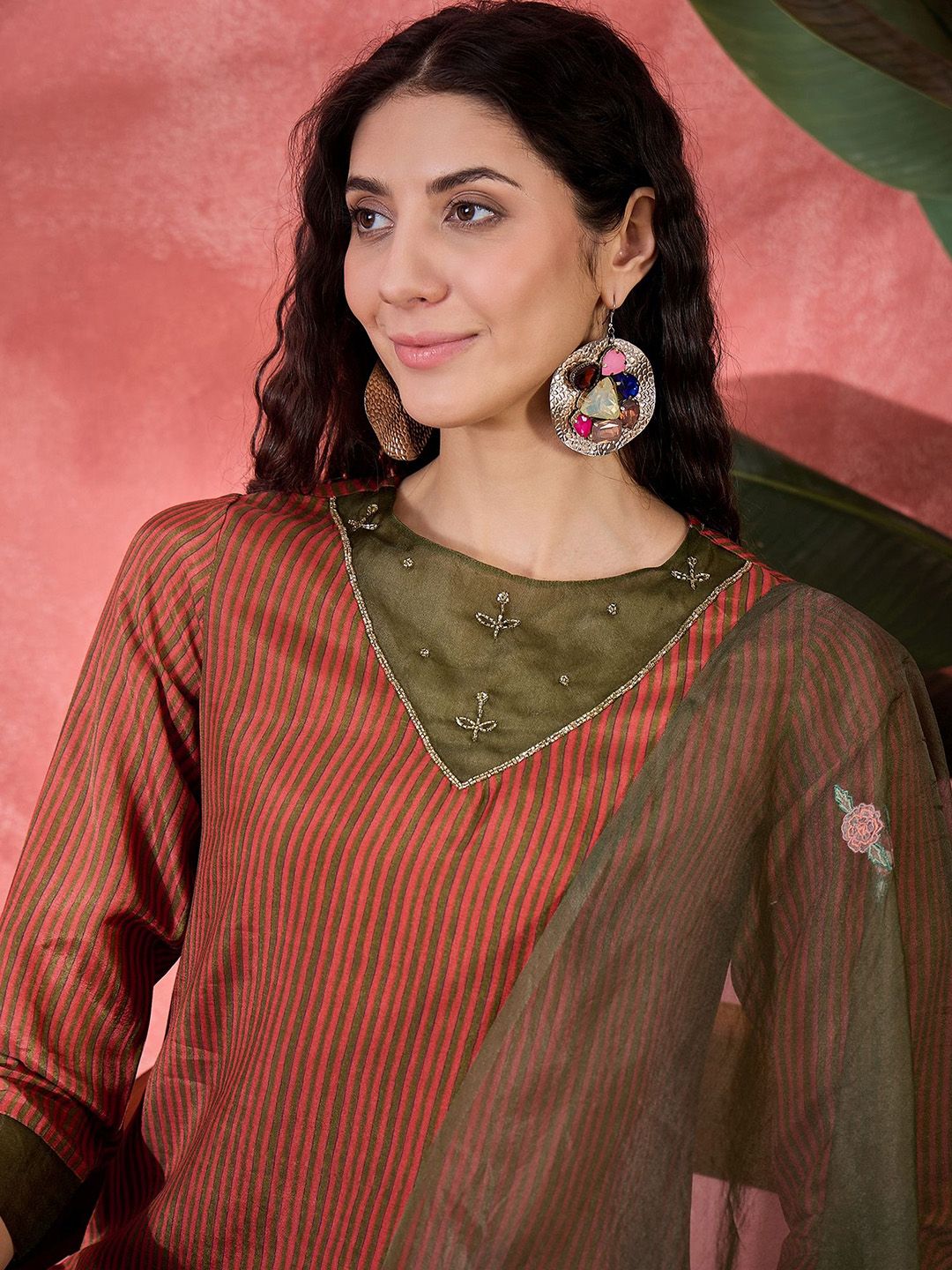 Sangria Striped Printed Round Neck Straight Kurta With Trousers And Dupatta