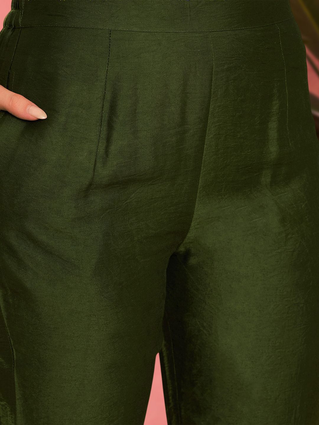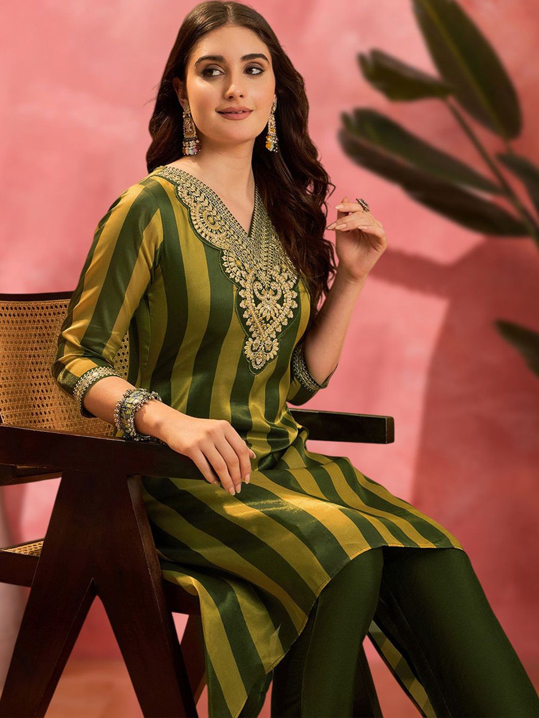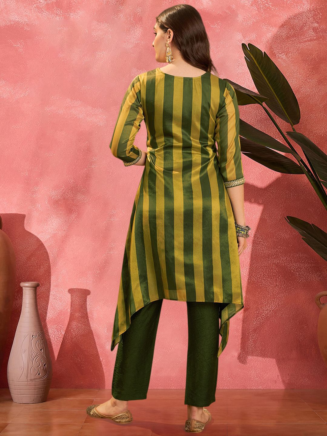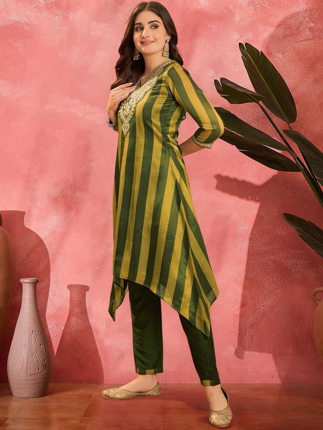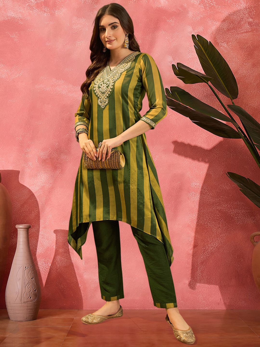 Sangria Striped V-Neck Thread Work A-Line Asymmetric Kurta & Trousers