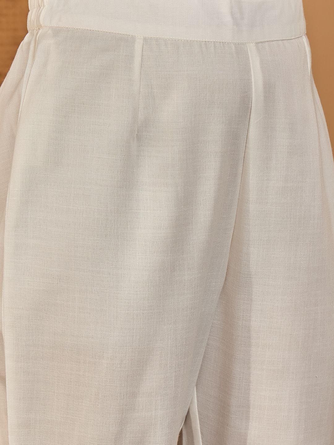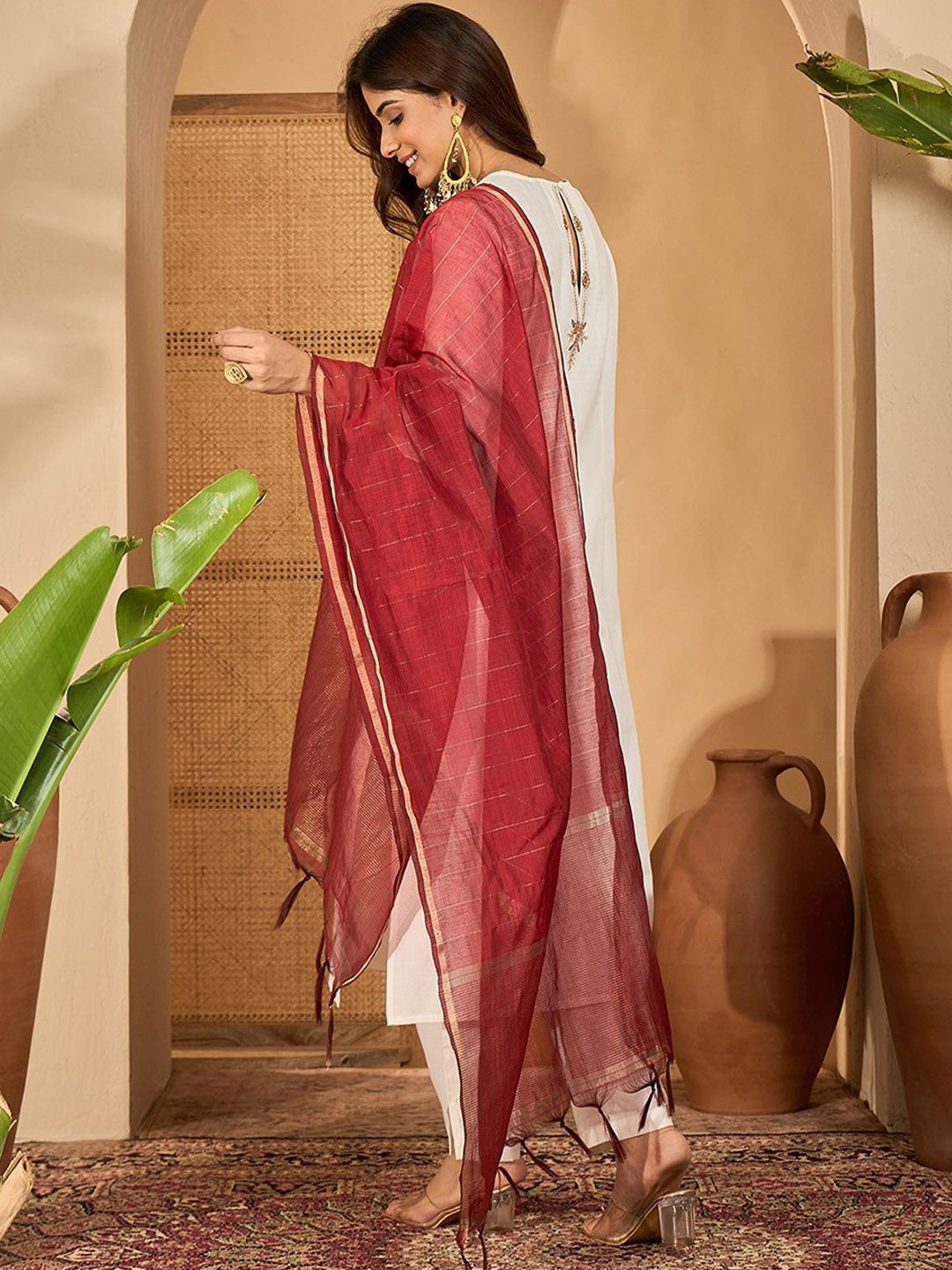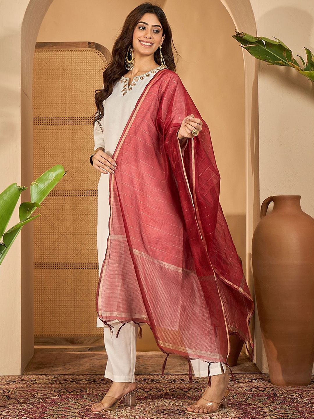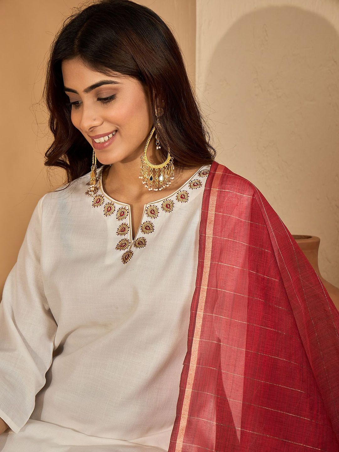 Sangria Thread Work Notch Neck Kurta With Trousers Dupatta