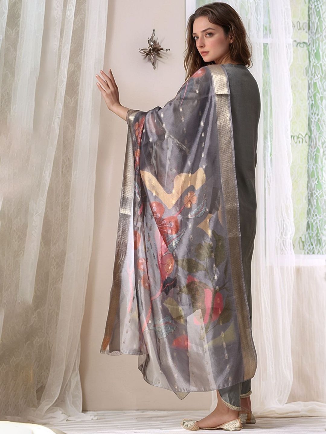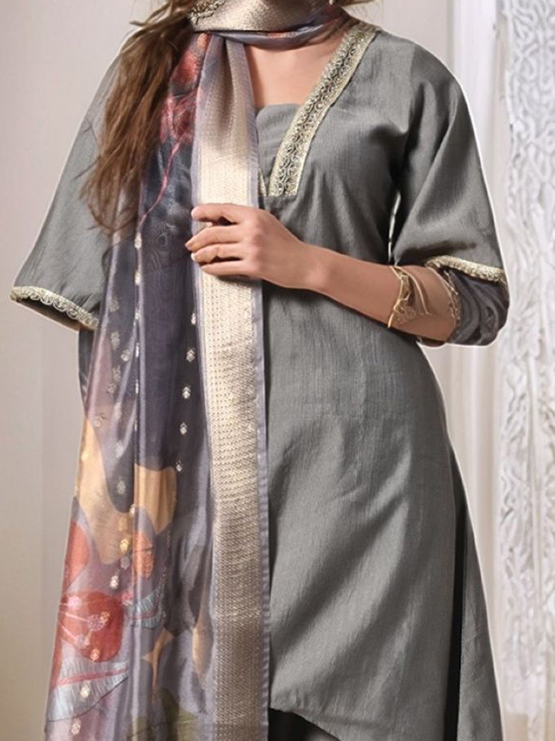 Sangria V-Neck A-Line Kurta With Dhoti Pants & Dupatta