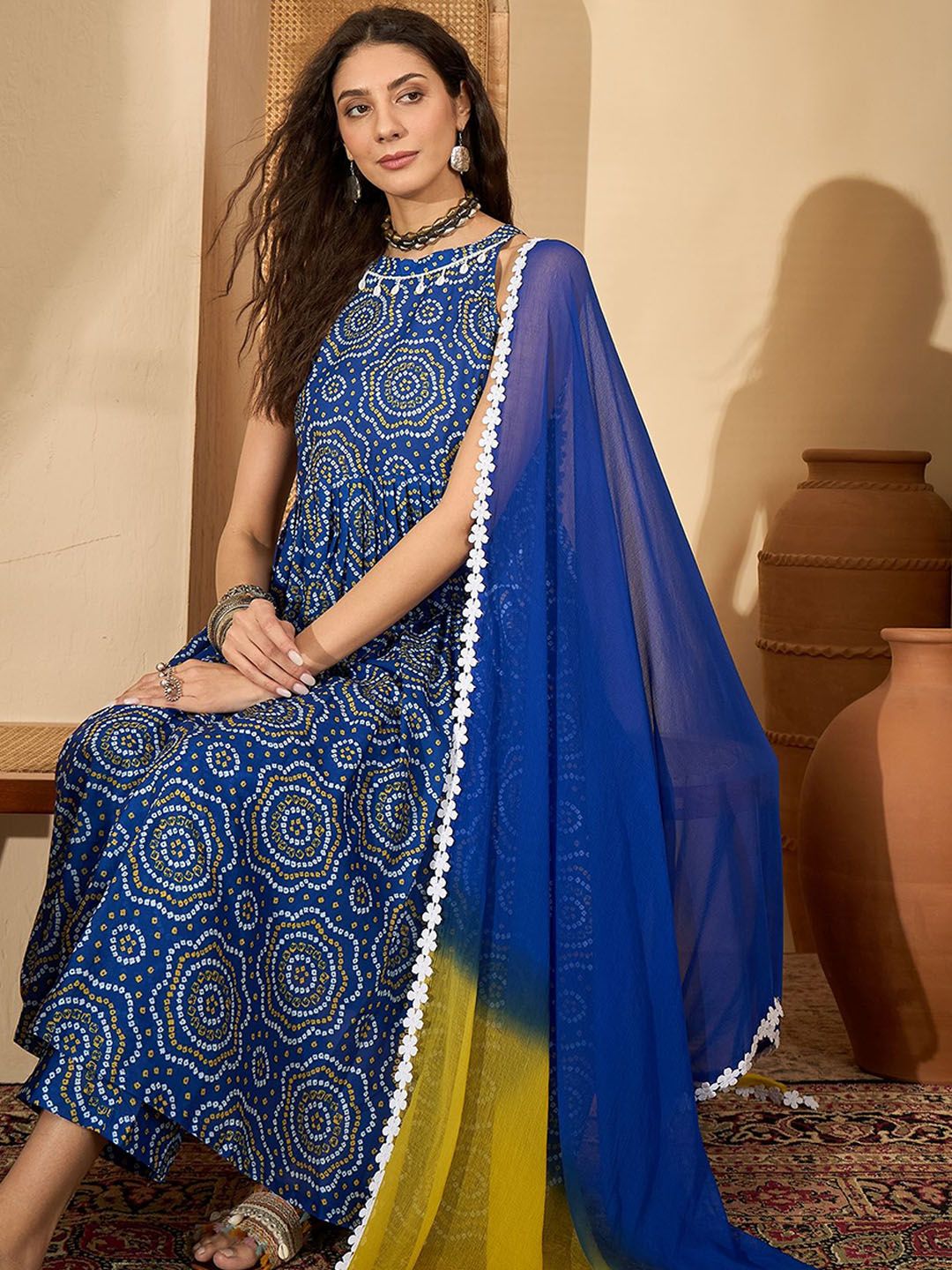 Sangria Women Bandhej Printed Pure Cotton Anarkali Kurta With Trouser & Dupatta