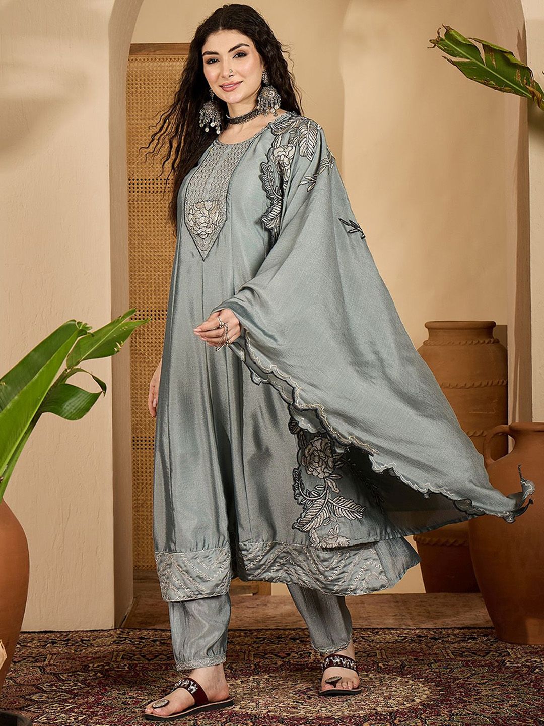 Sangria Women Embroidered A-Line Kurta With Trousers & Dupatta Kurta Sets