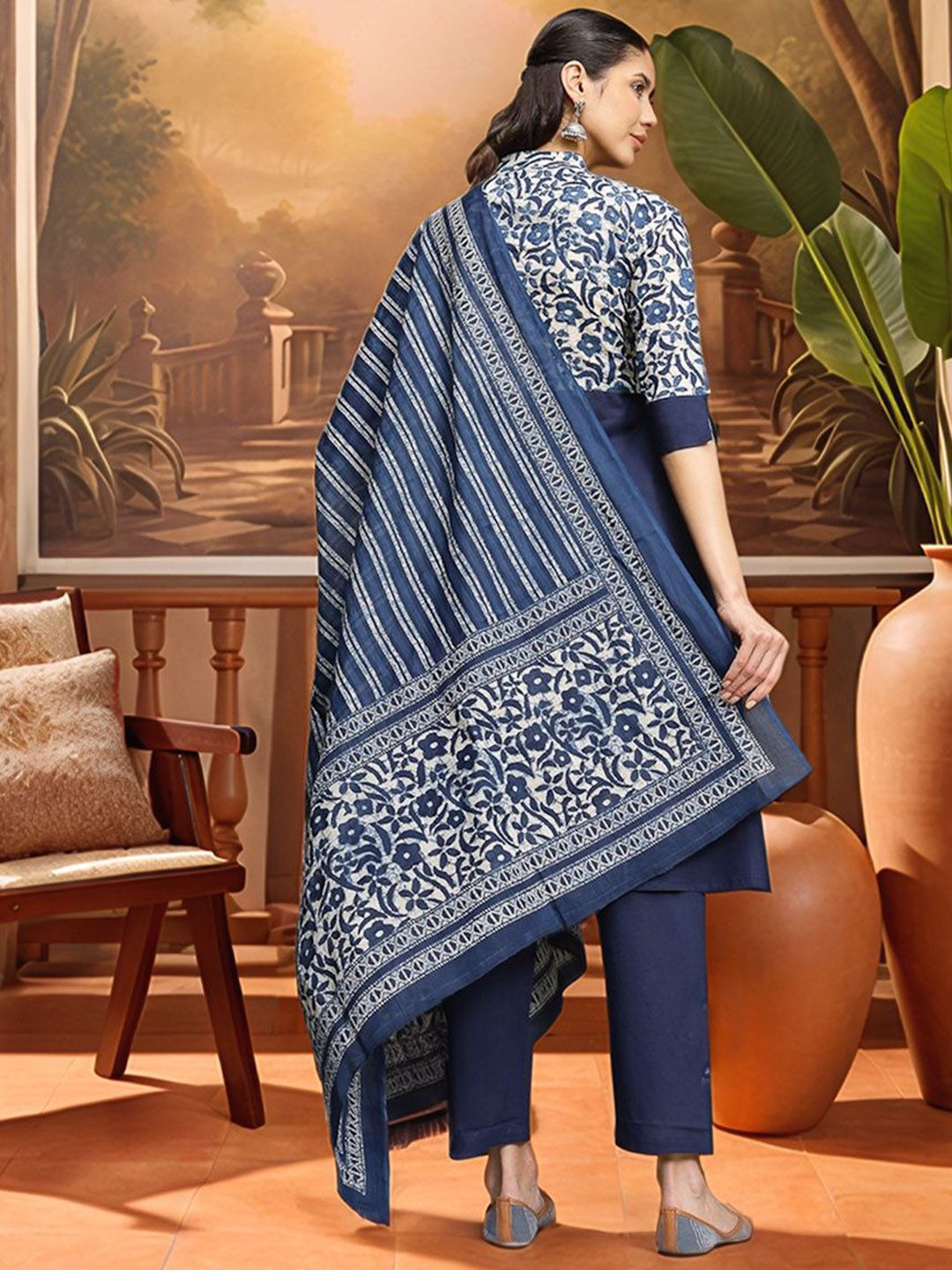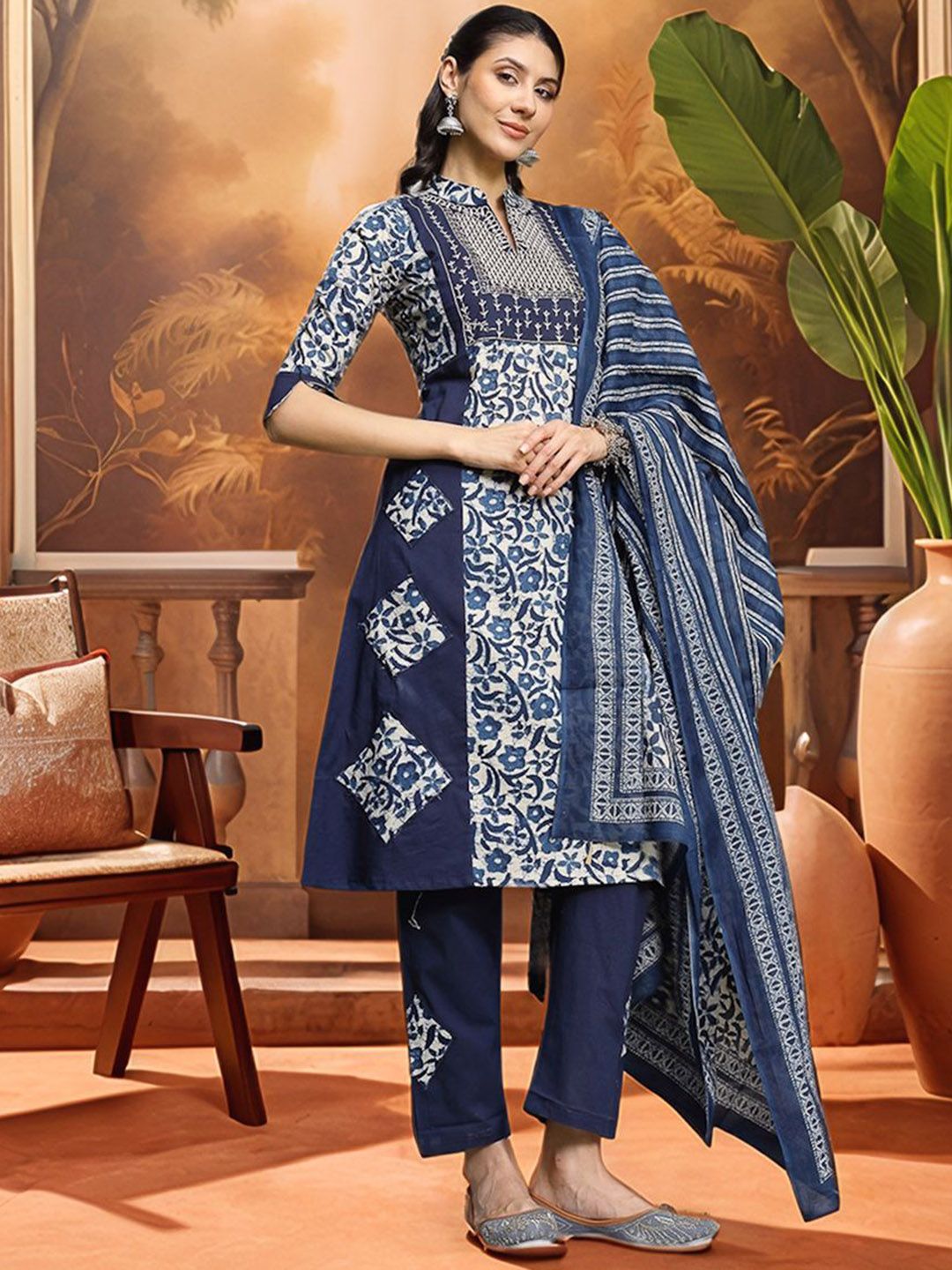 Sangria Women Embroidered A-Line Pure Cotton Kurta & Trousers With Dupatta