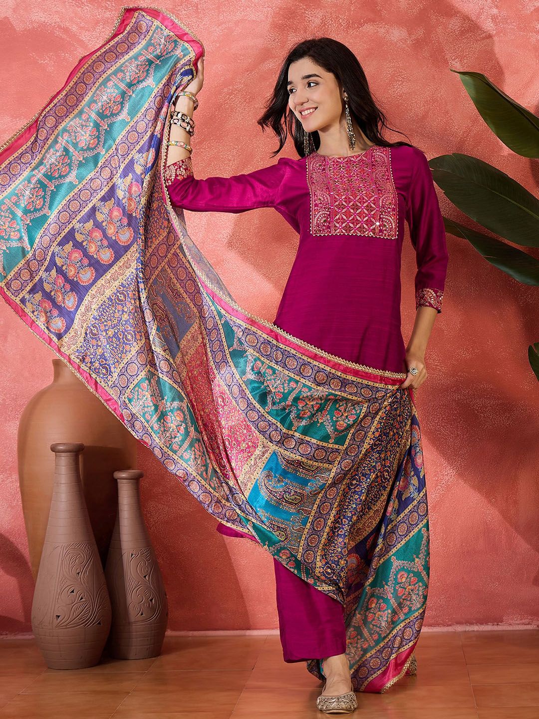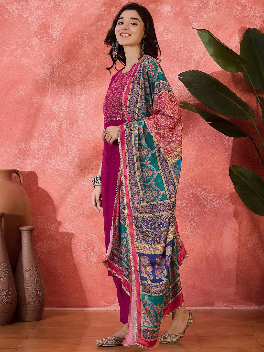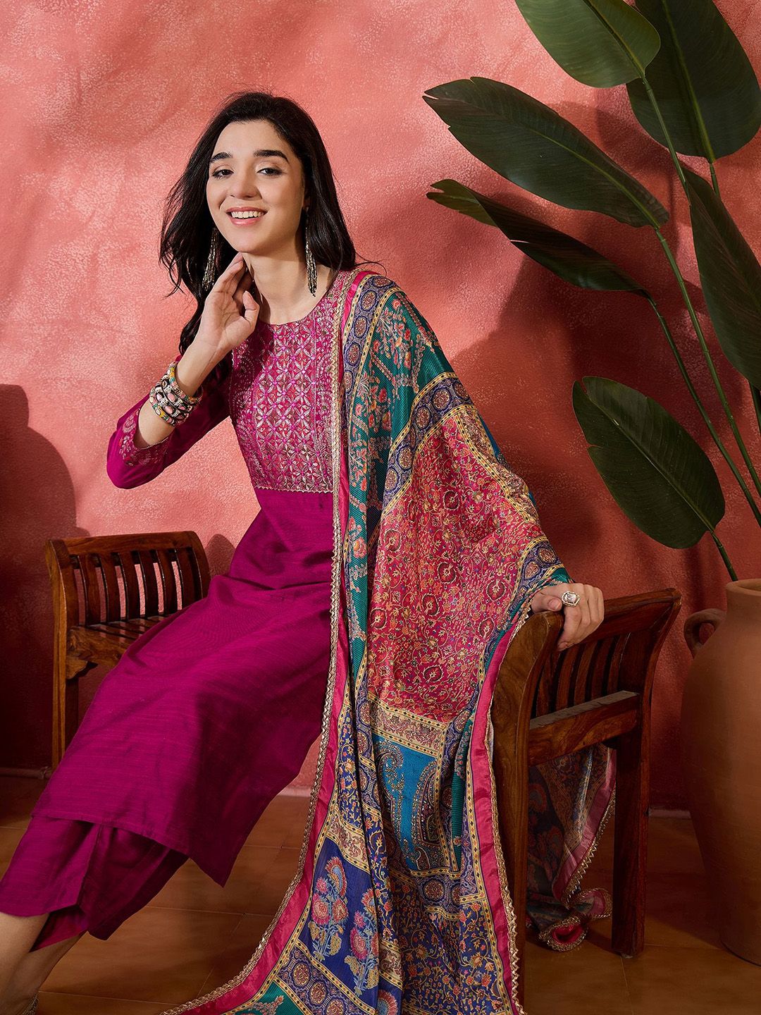 Sangria Women Embroidered Kurta With Trousers & Dupatta