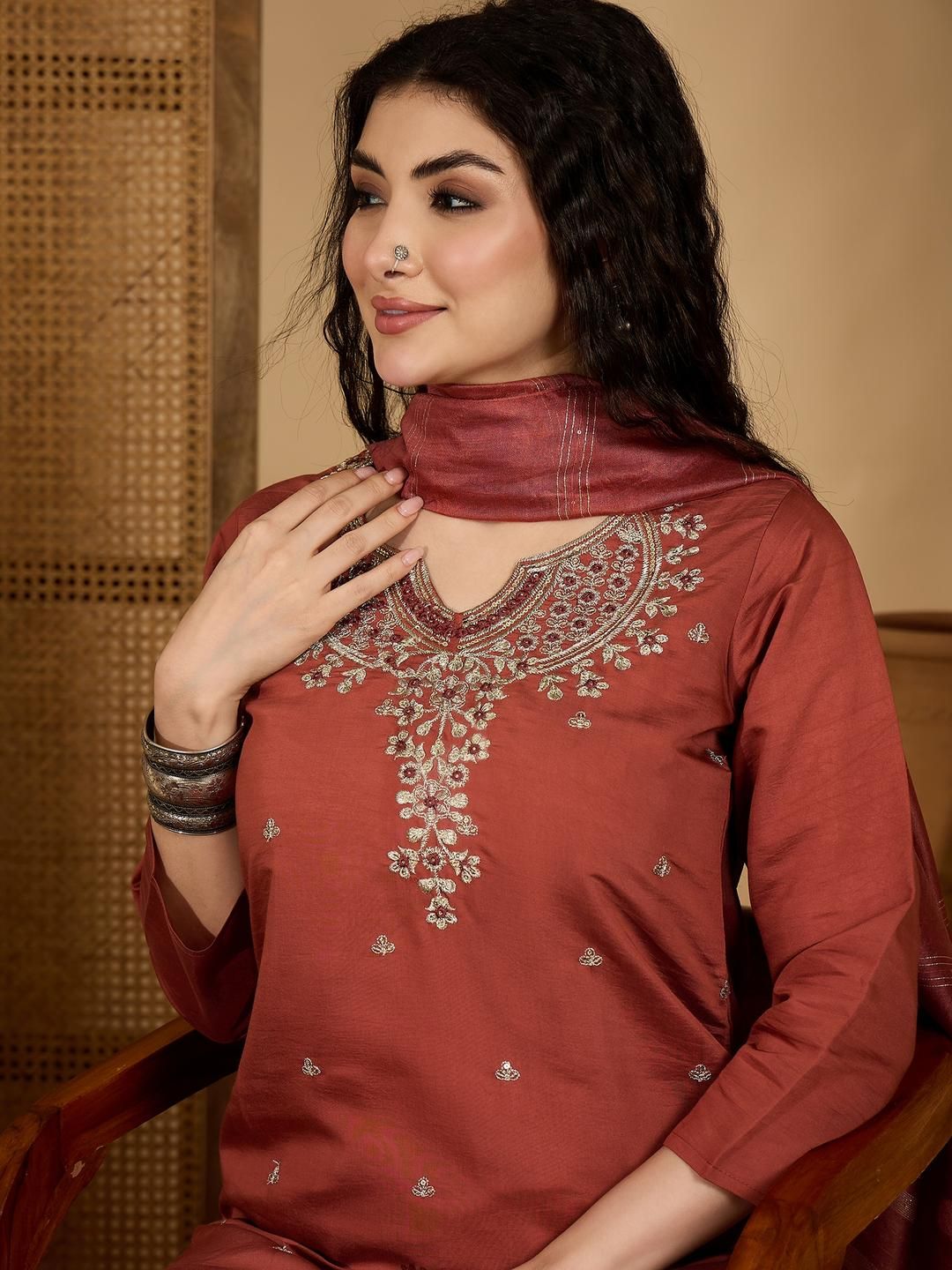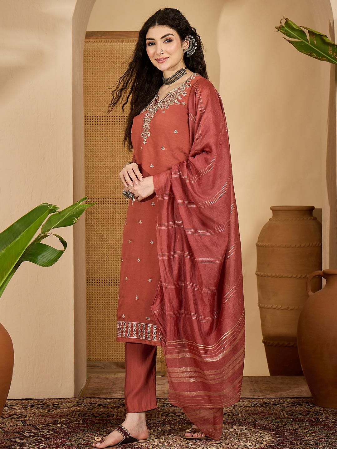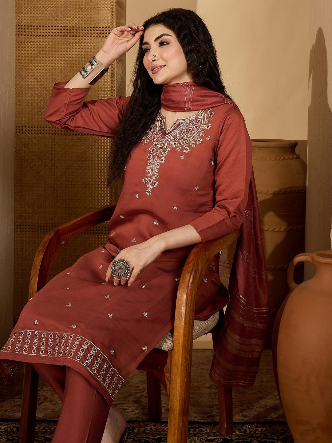 Buy this stylish Sangria Women Embroidered Regular Sequinned Pure Silk Kurta with Trousers & With Dupatta at Marincart Nepal. This product offers great quality and value. Perfect for those looking for the latest trends in fashion. Get yours now at unbeatable prices.