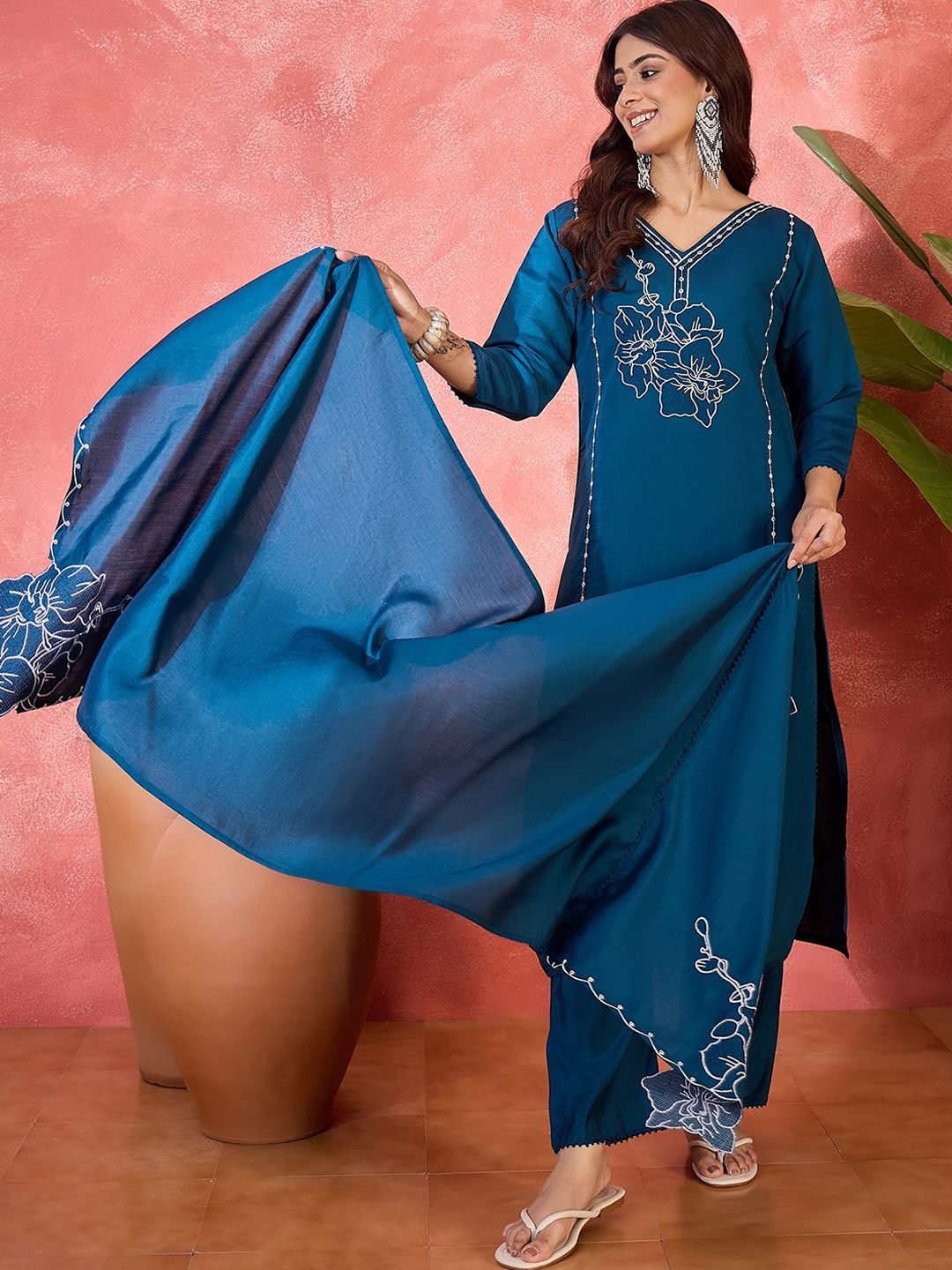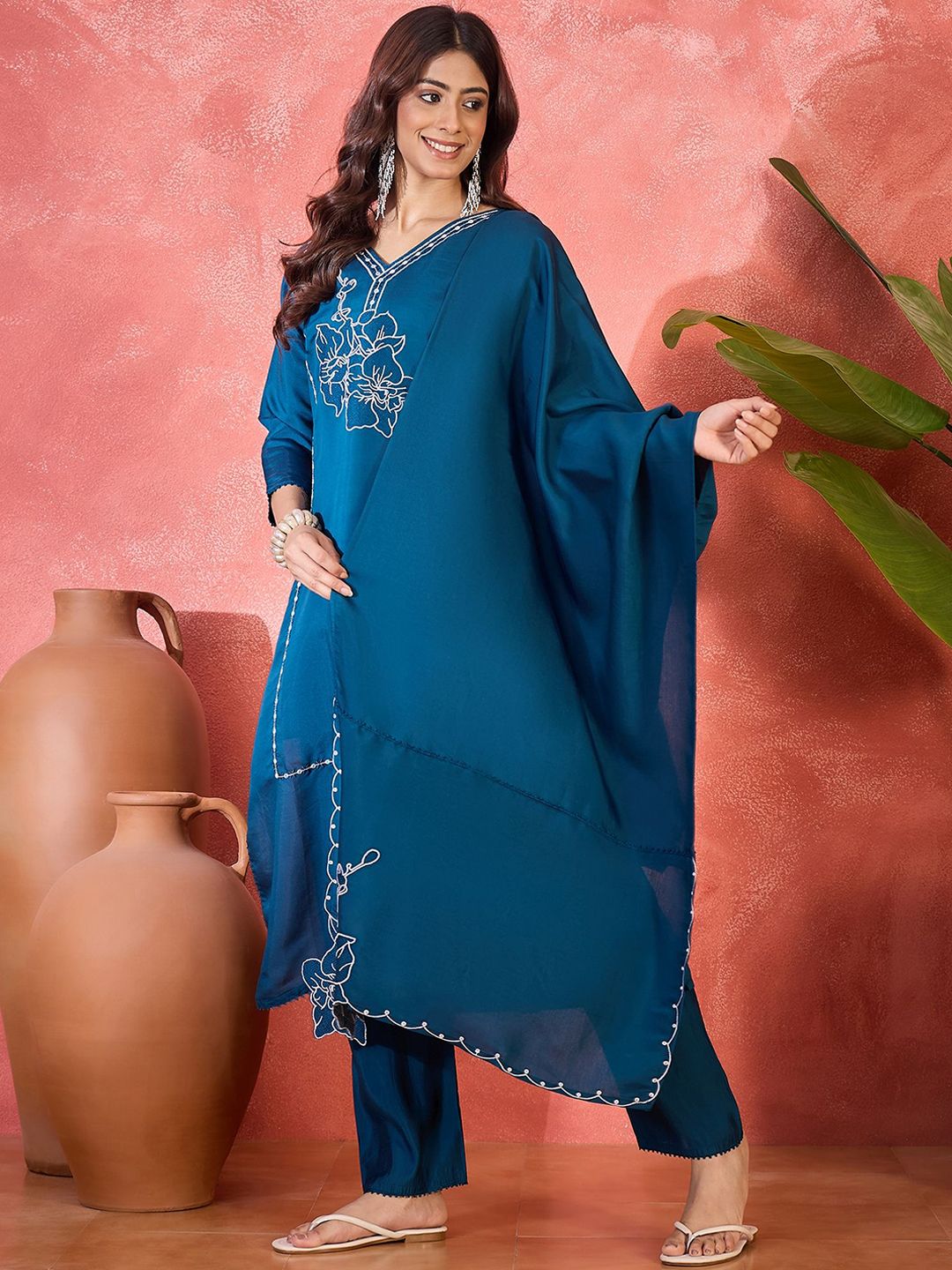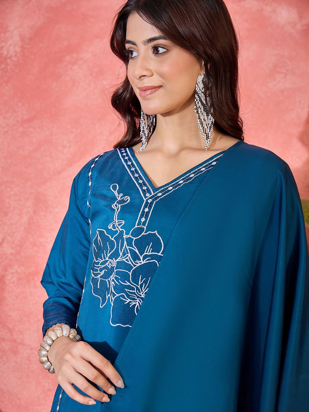 Sangria Women Embroidered Straight Pure Silk Kurta & Trousers With Dupatta