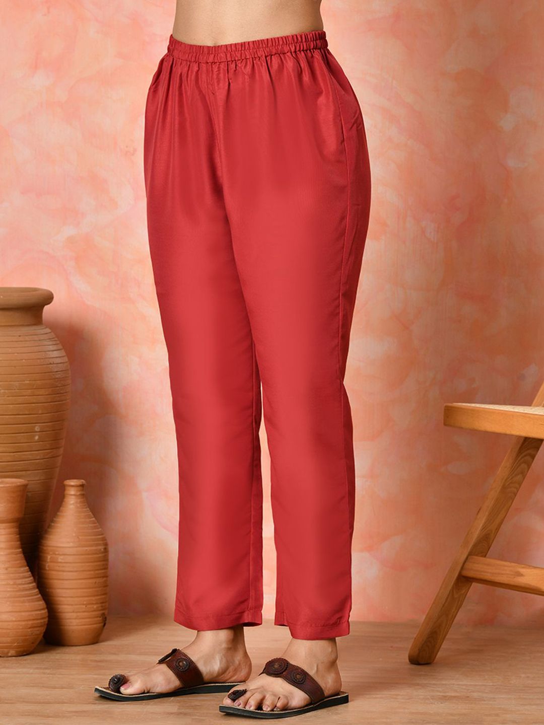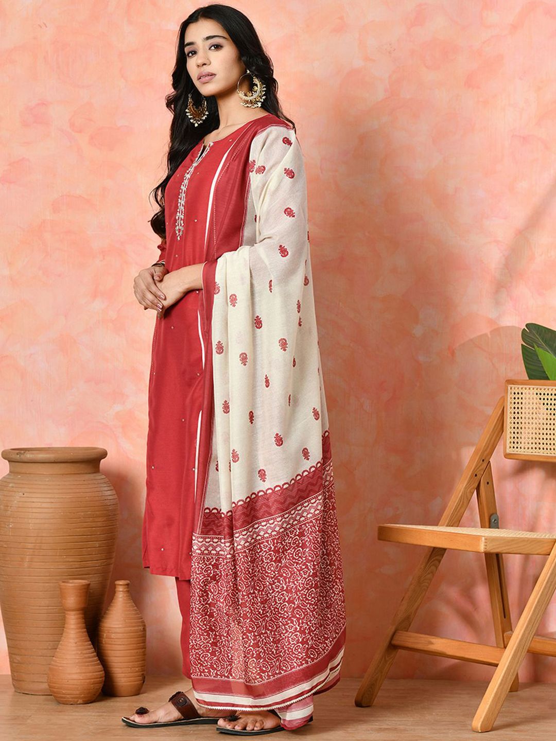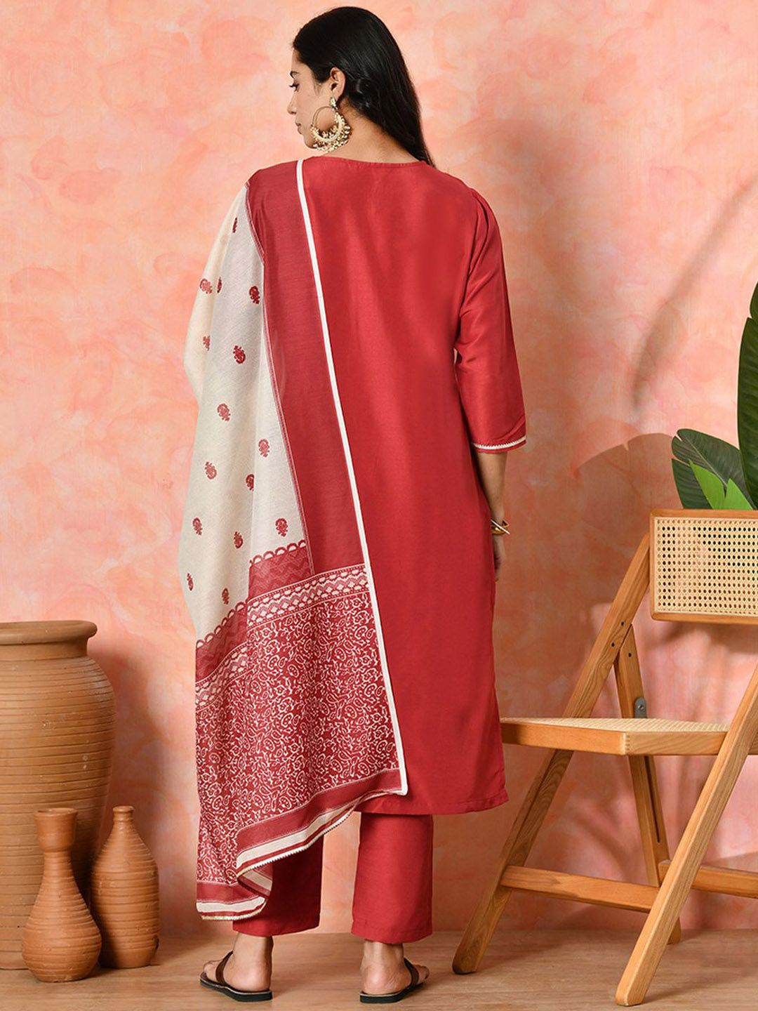 Sangria Women Ethnic Motifs Embroidered Solid Straight Kurta Trouser With Dupatta