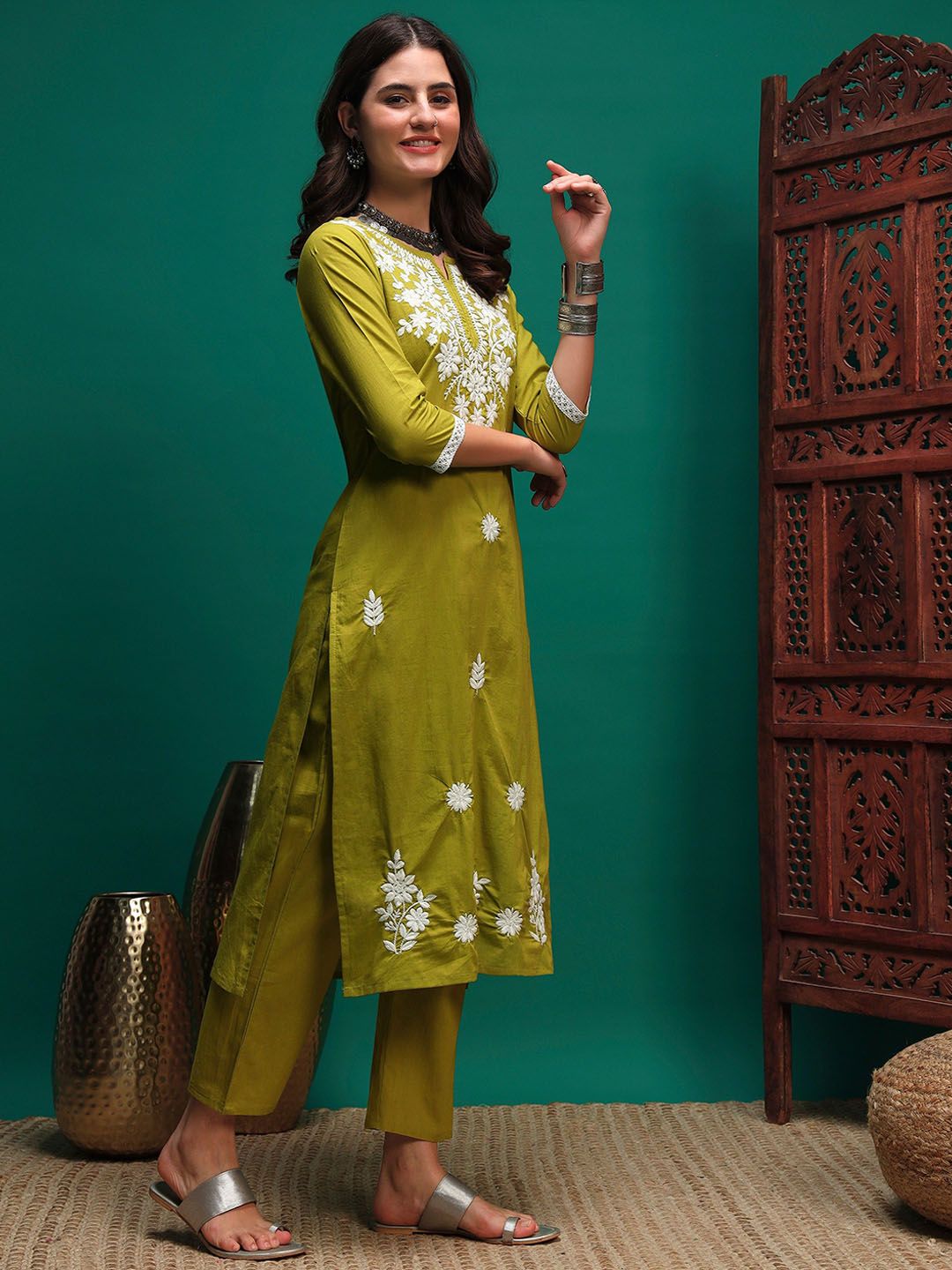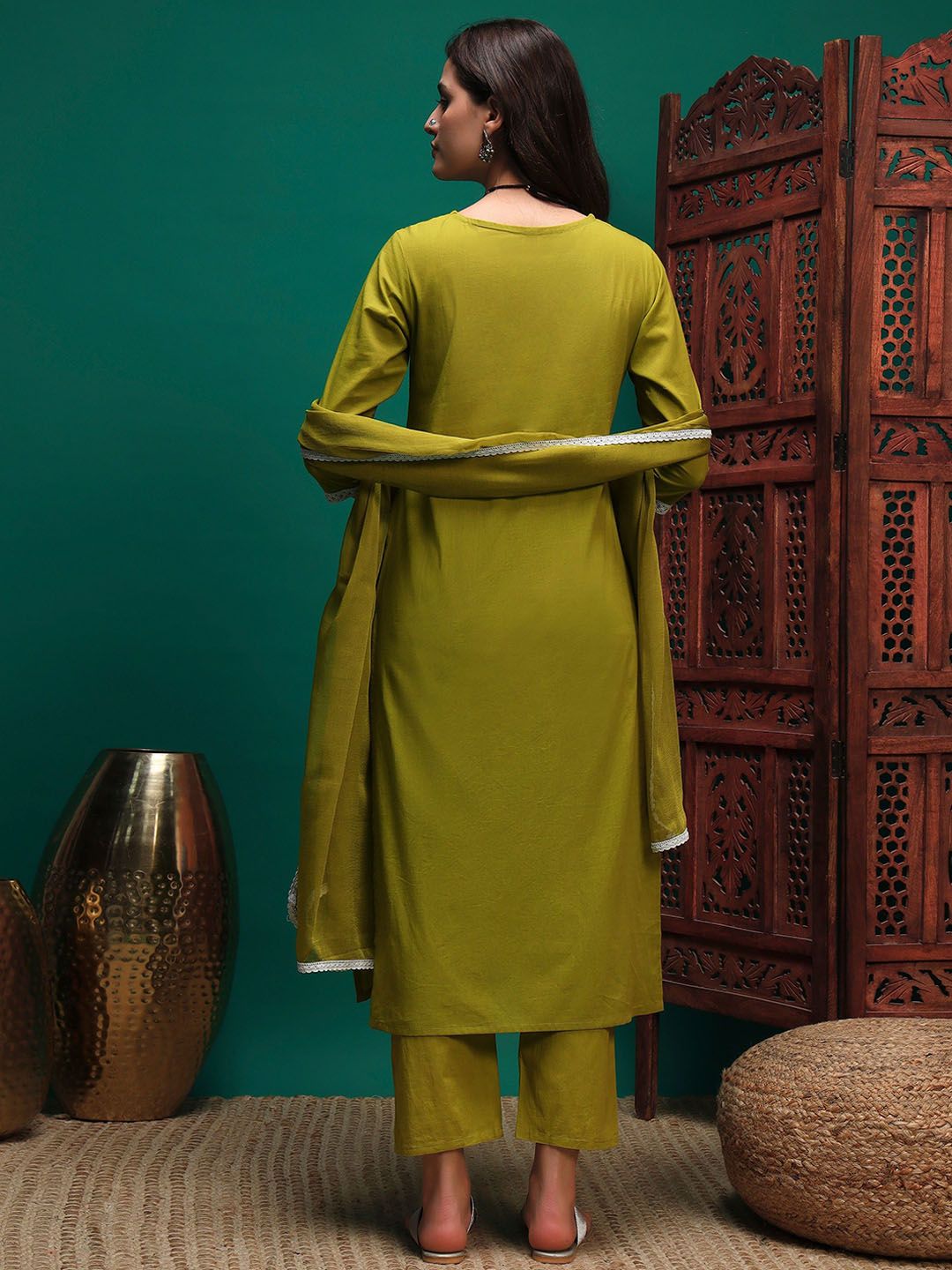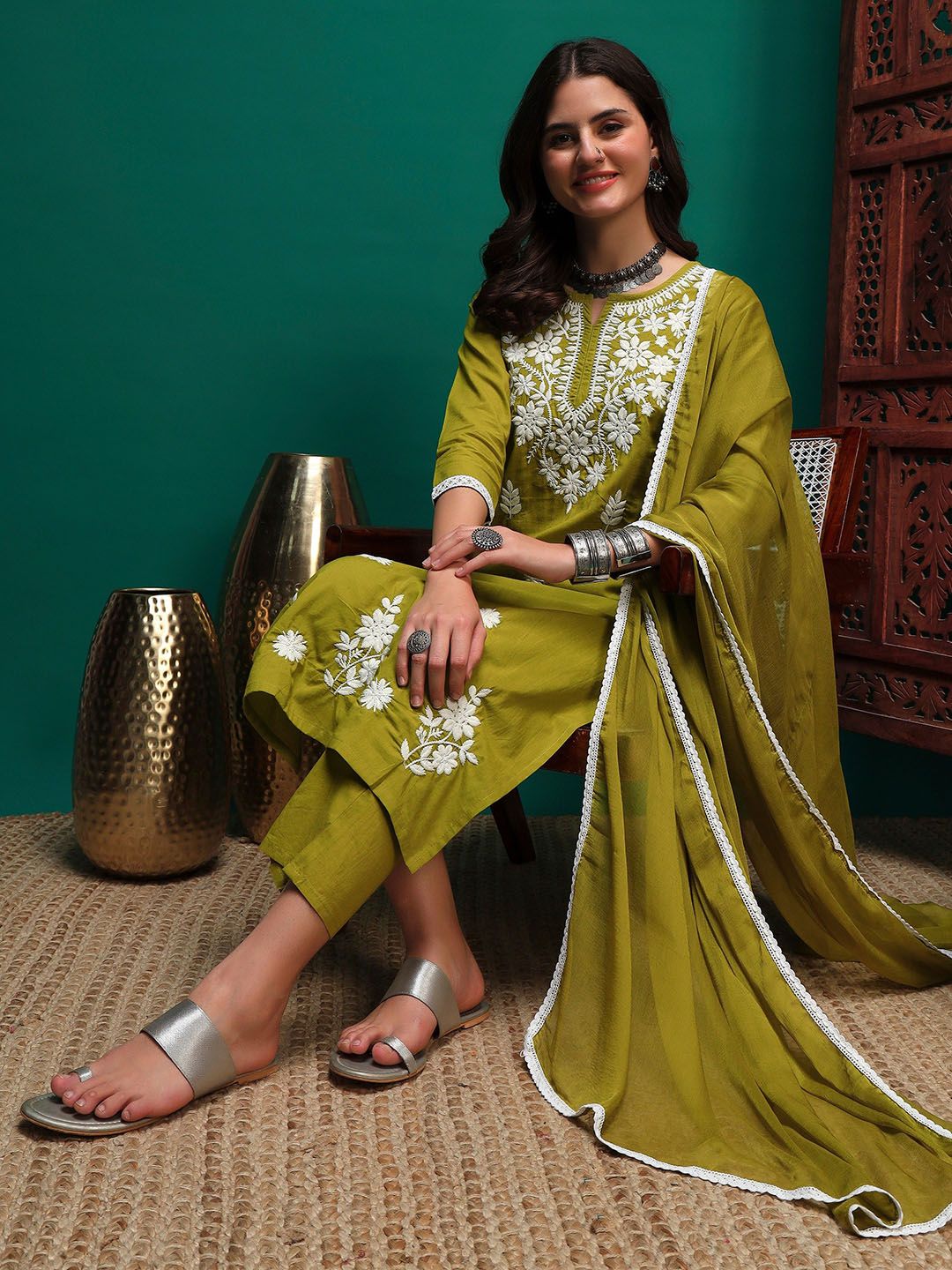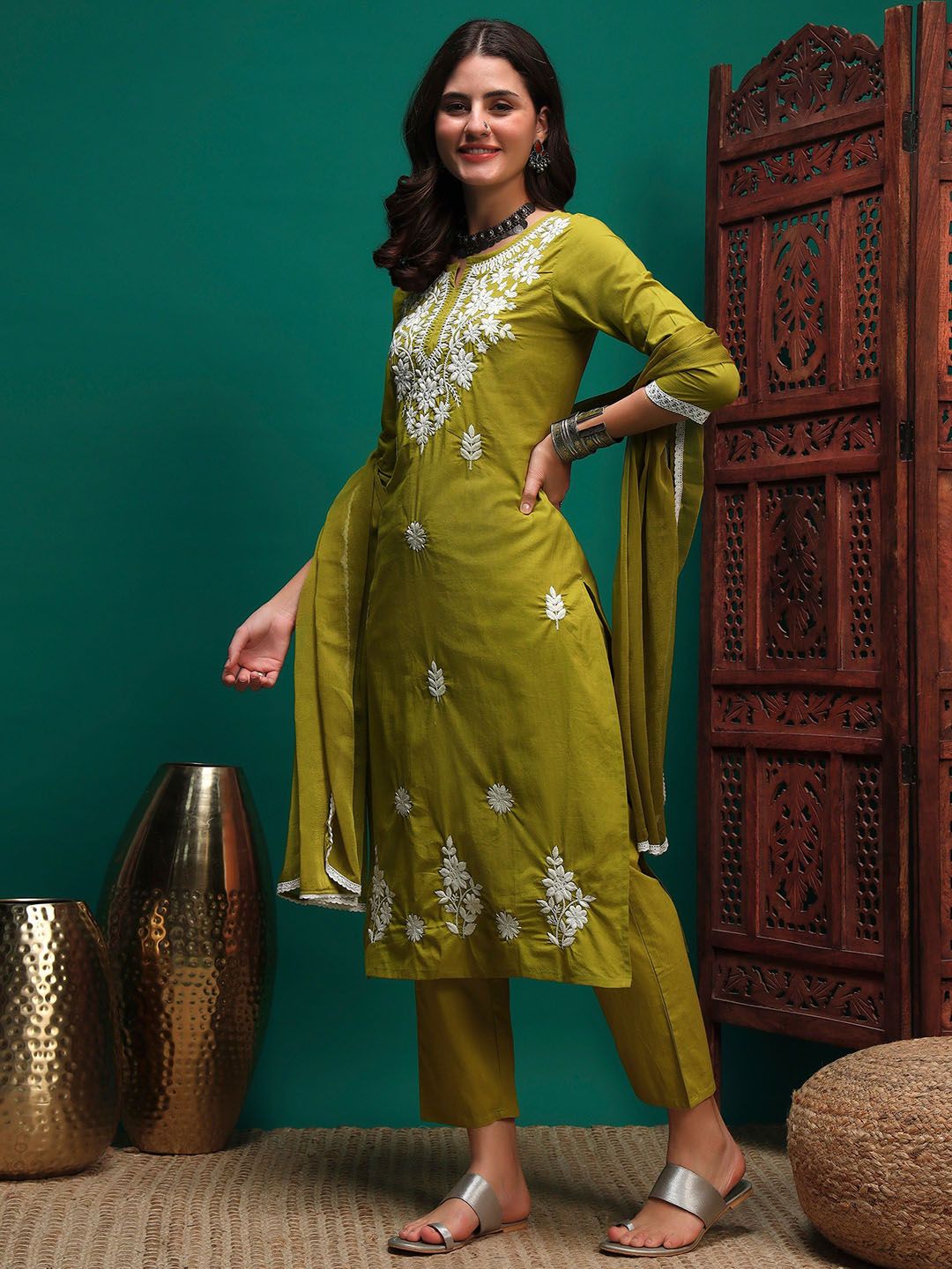 Sangria Women Floral Embroidered Cotton Kurta with Trousers & Dupatta