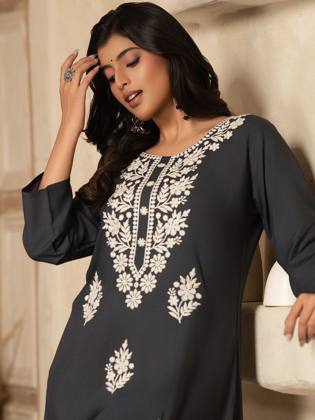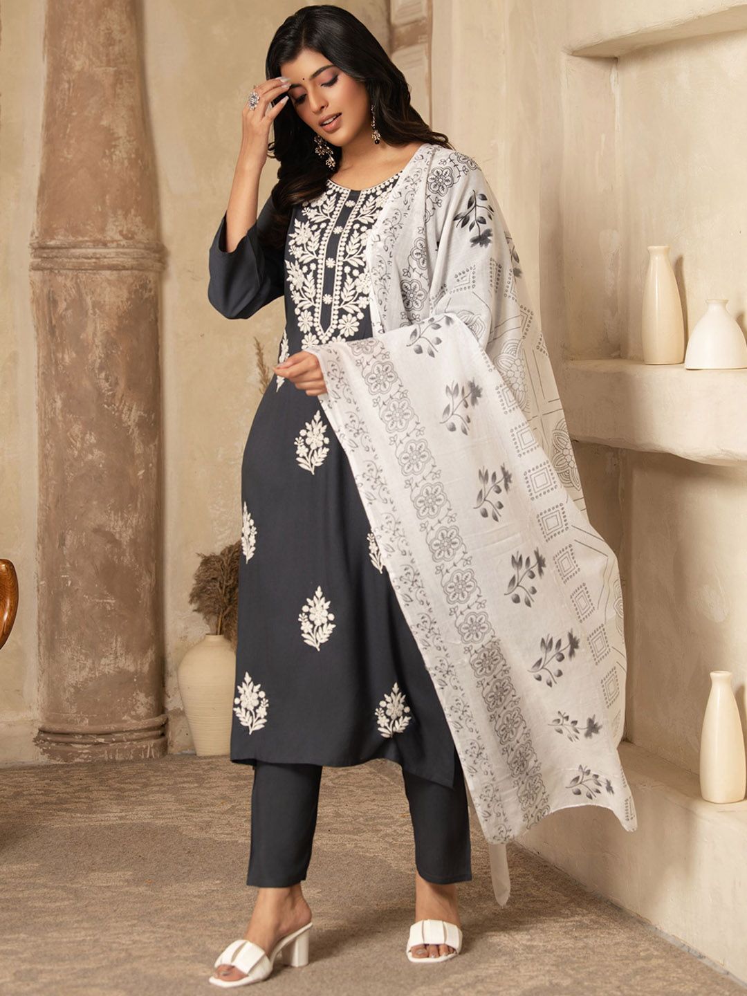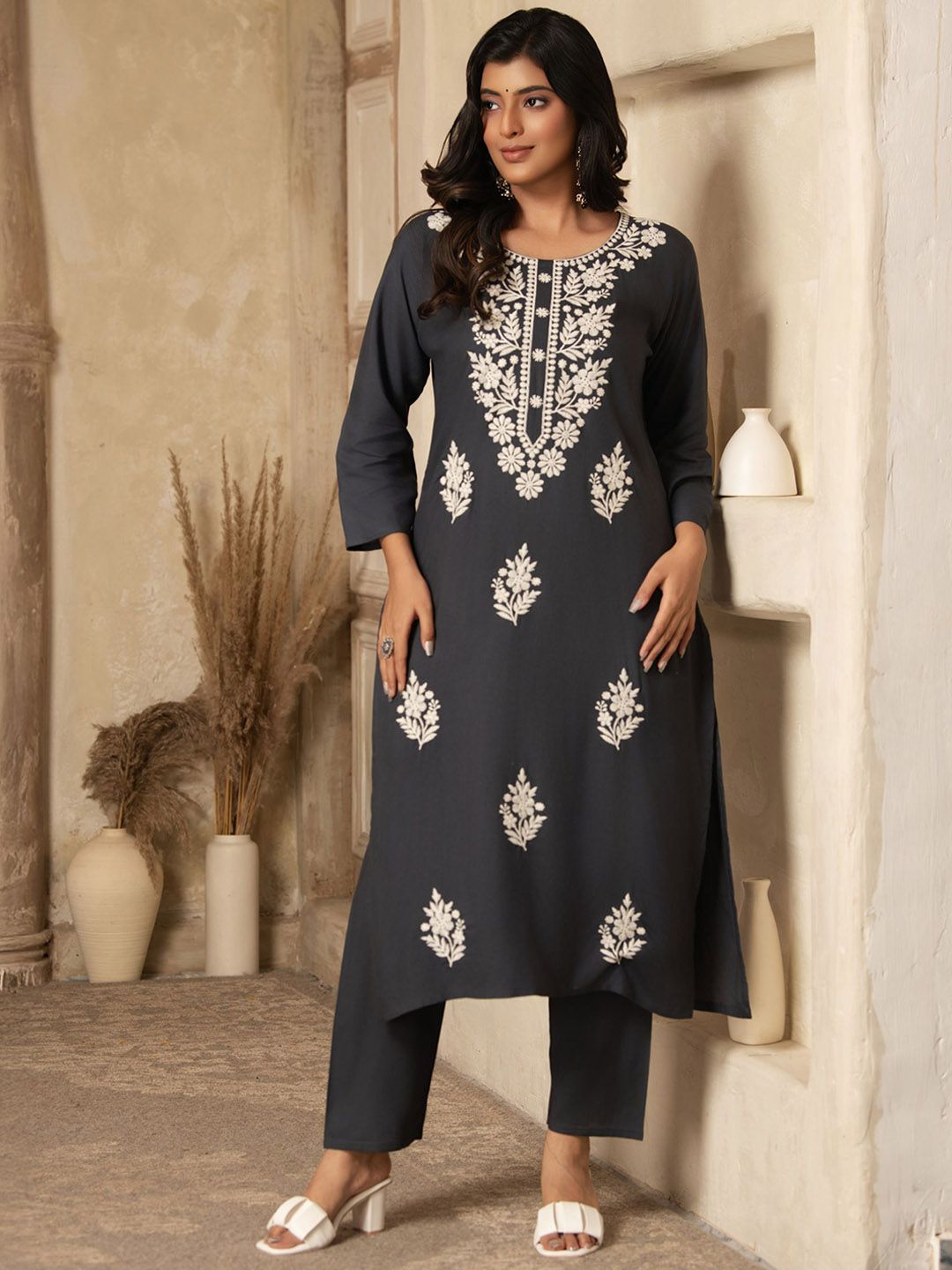 Sangria Women Floral Embroidered Round Neck Chikankari Straight Kurta & Trousers Dupatta