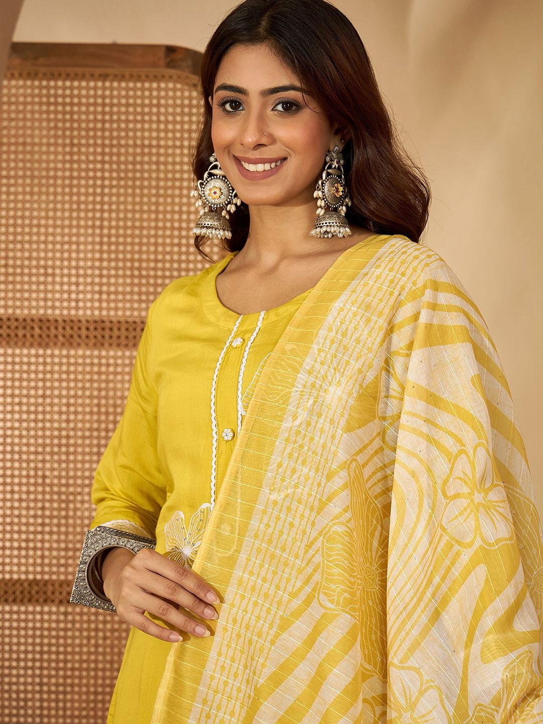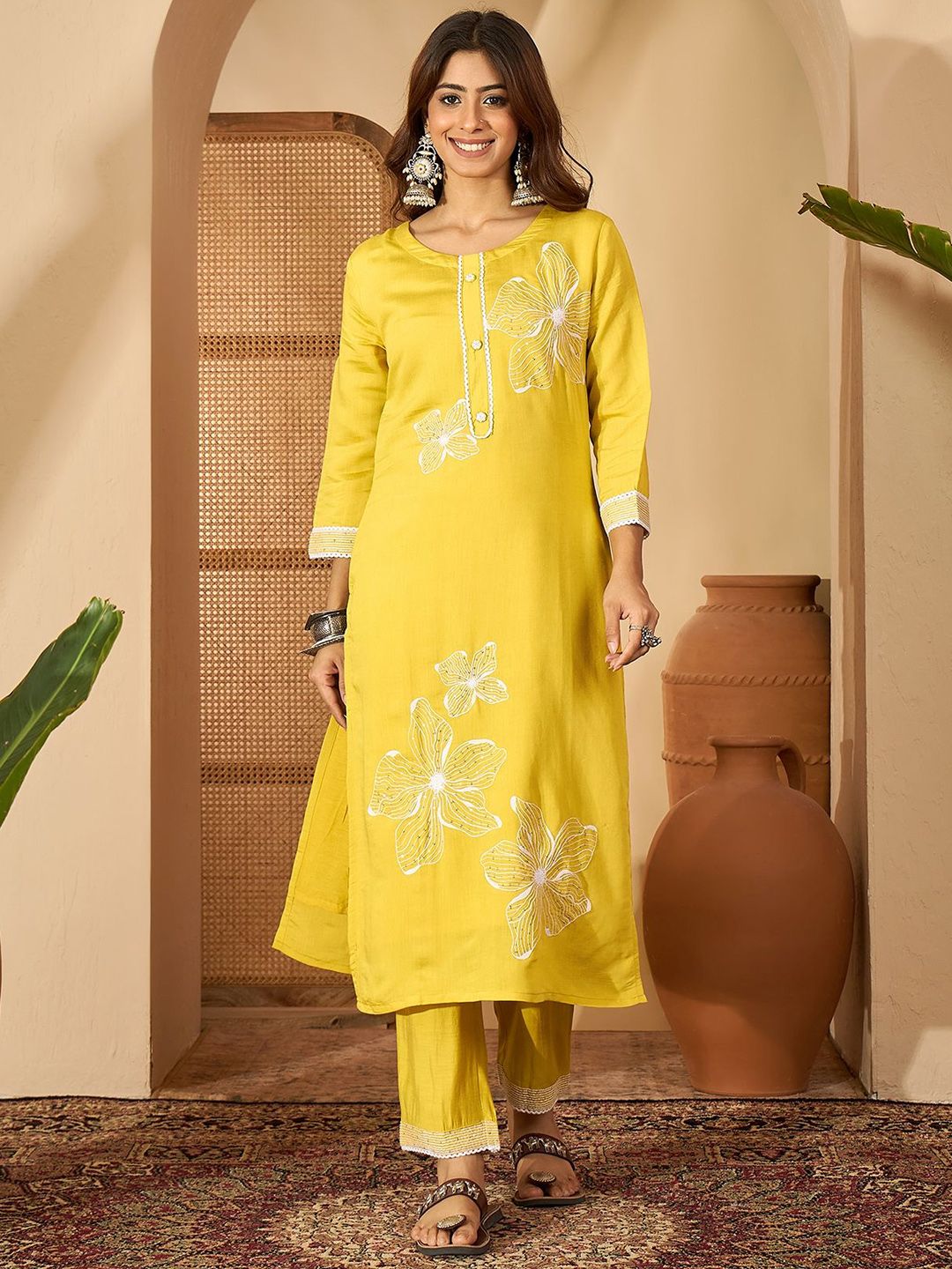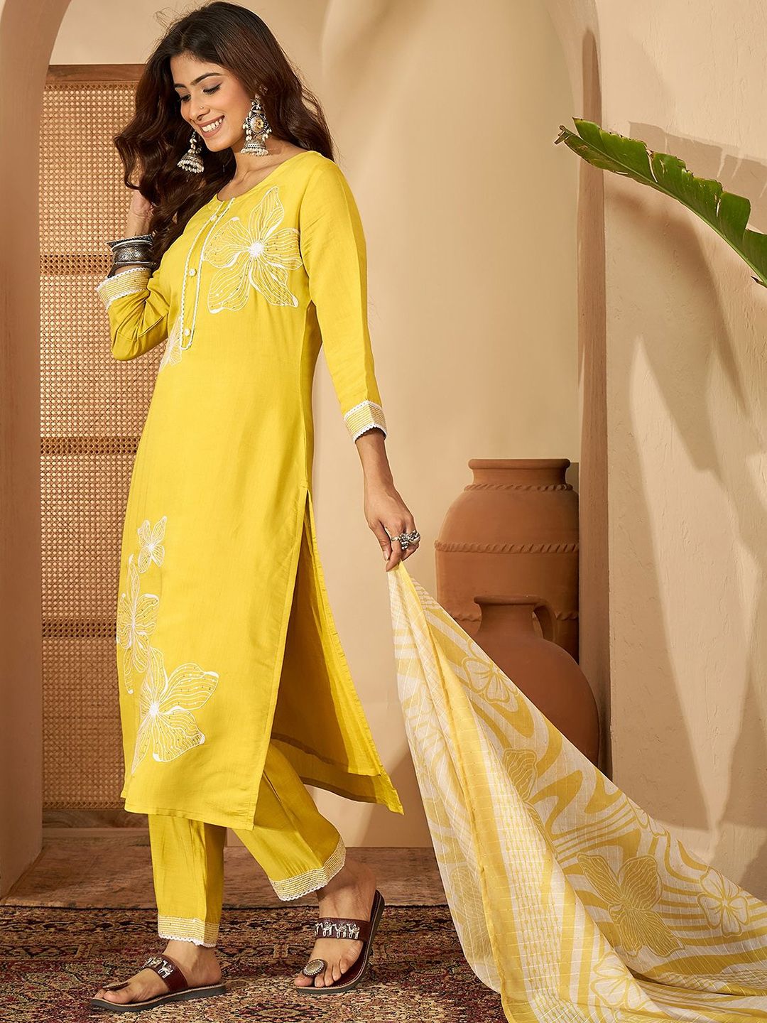 Sangria Women Floral Embroidered Straight Kurta & Trousers With Dupatta